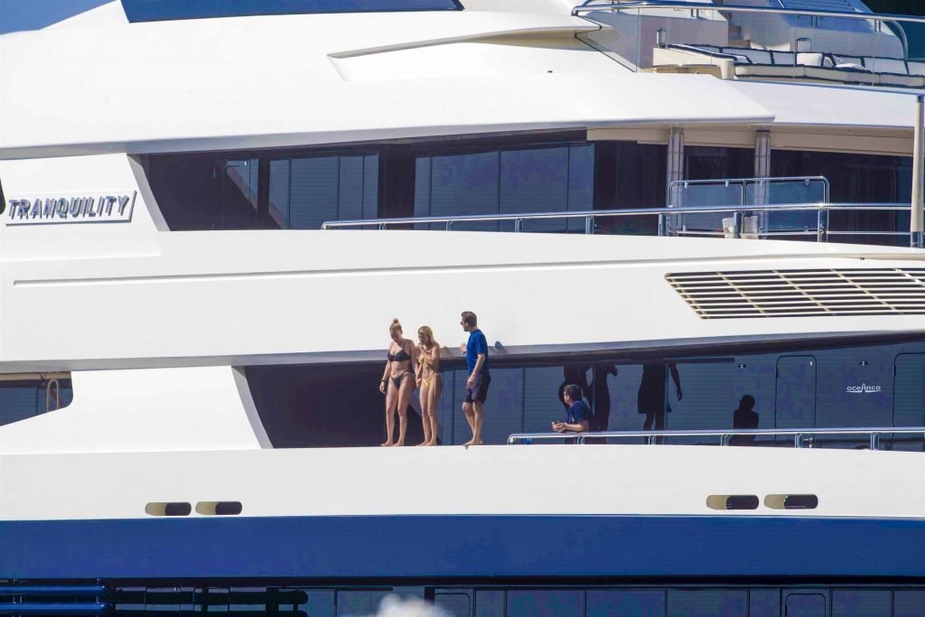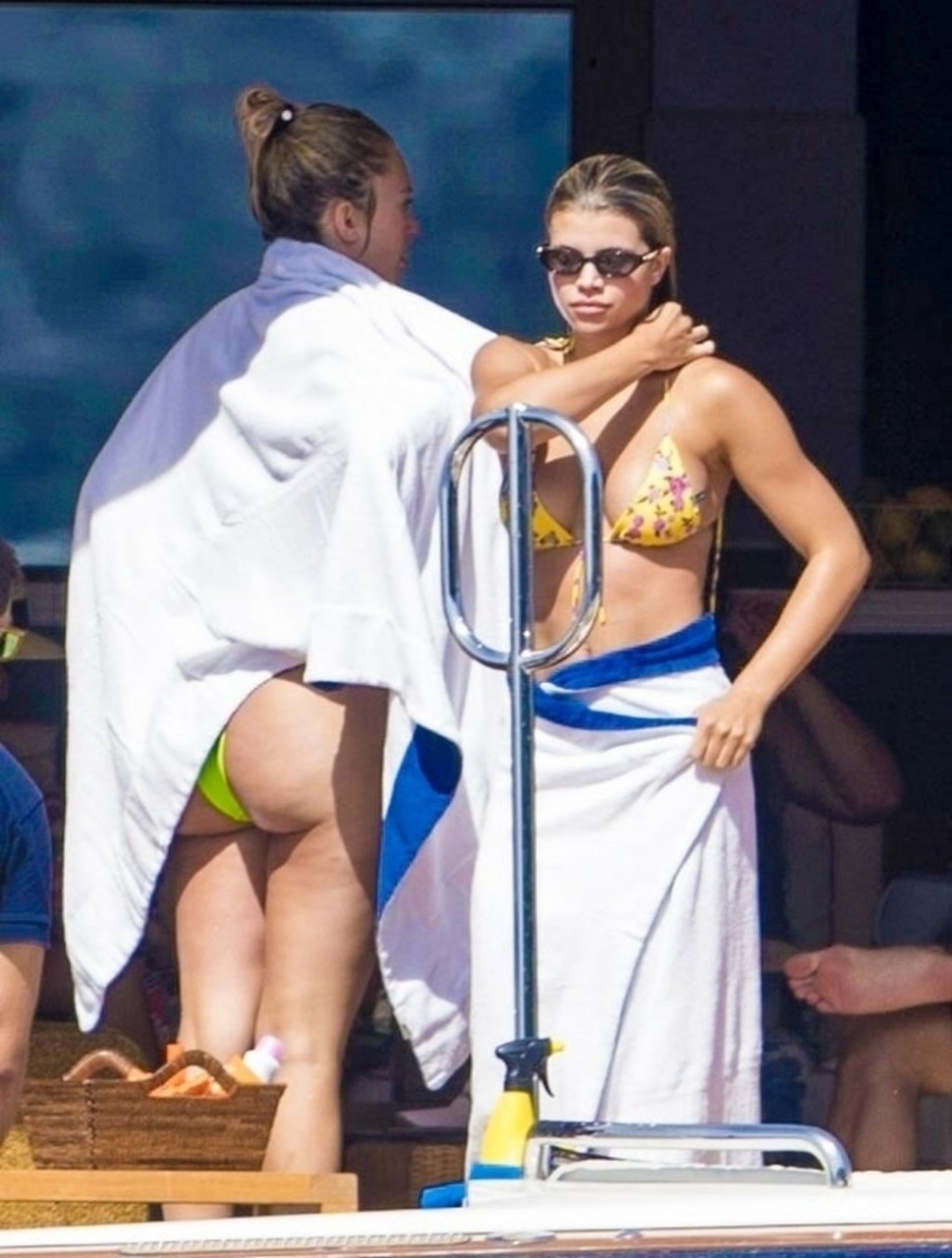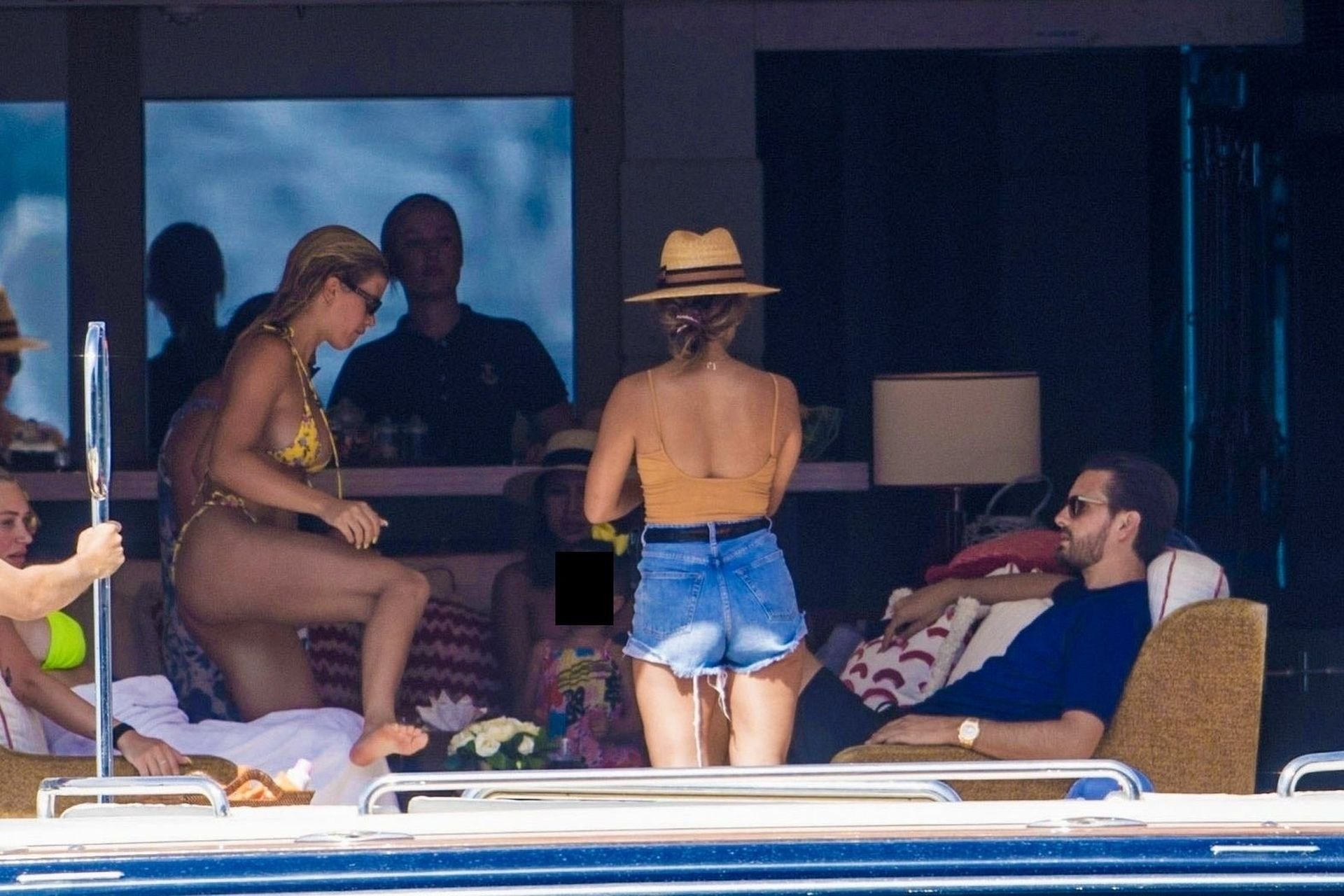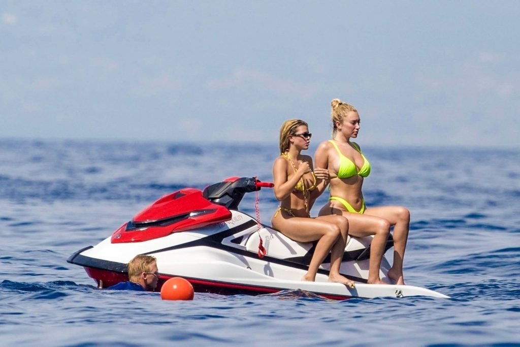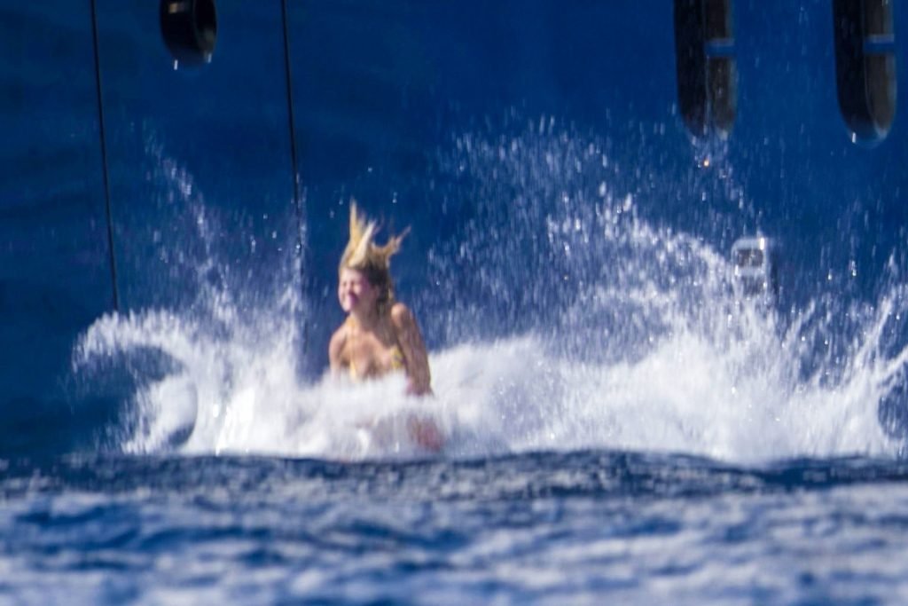 La star americana dei reality Scott Disick, Sofia Richie e la sua amica, Anastasia Karanikolaou, si divertono un po’ tuffandosi in mare dal loro lussuoso yacht in vacanza in Italia, 08/07/2019.