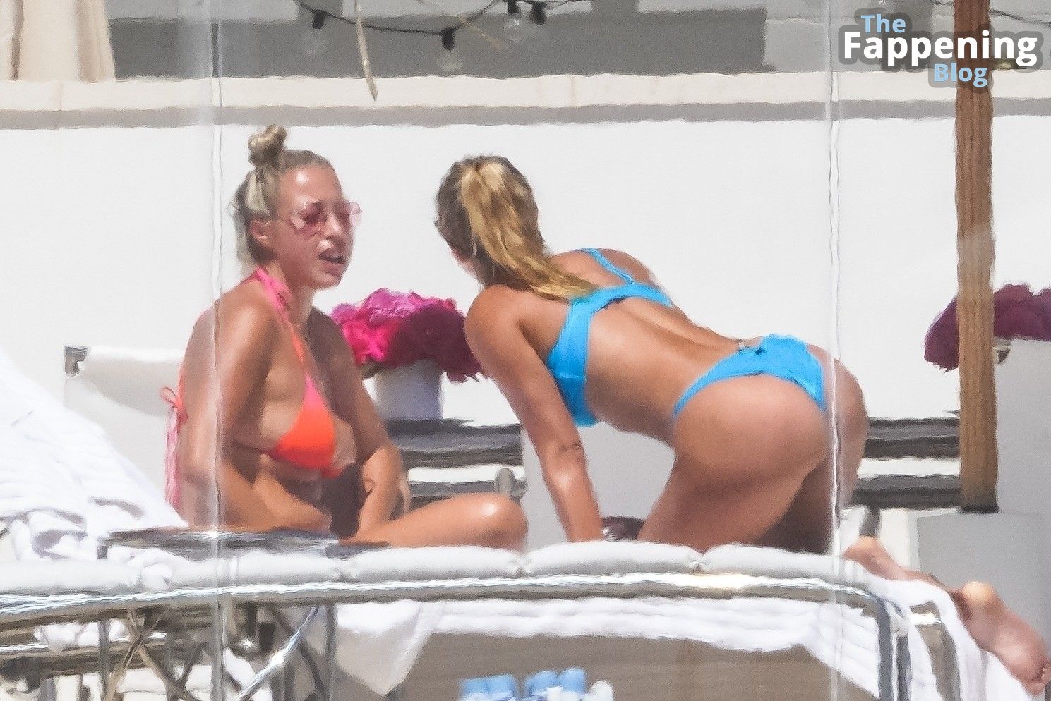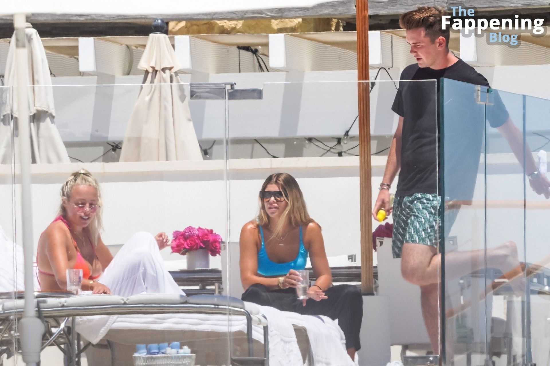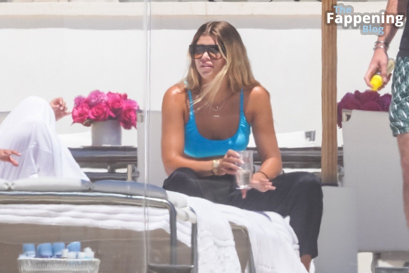 Sofia Richie è vista in un bikini blu mentre si rilassa con gli amici sul balcone della loro camera d’hotel di lusso.