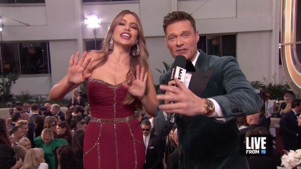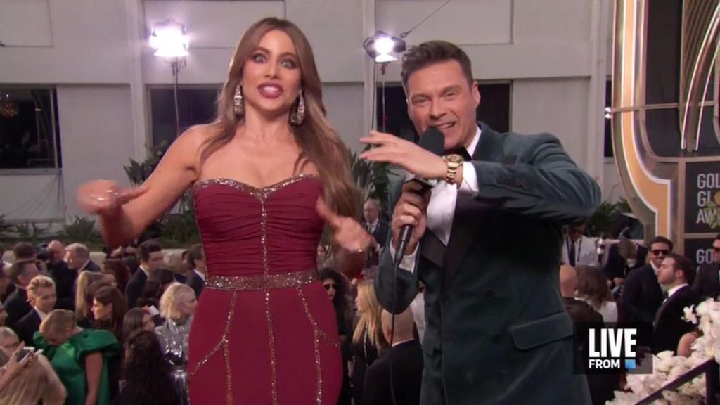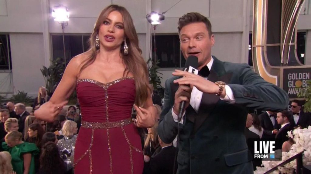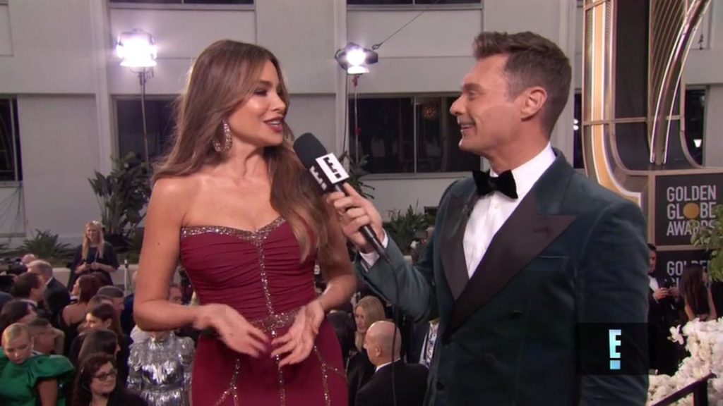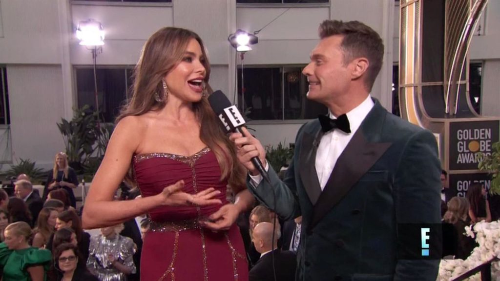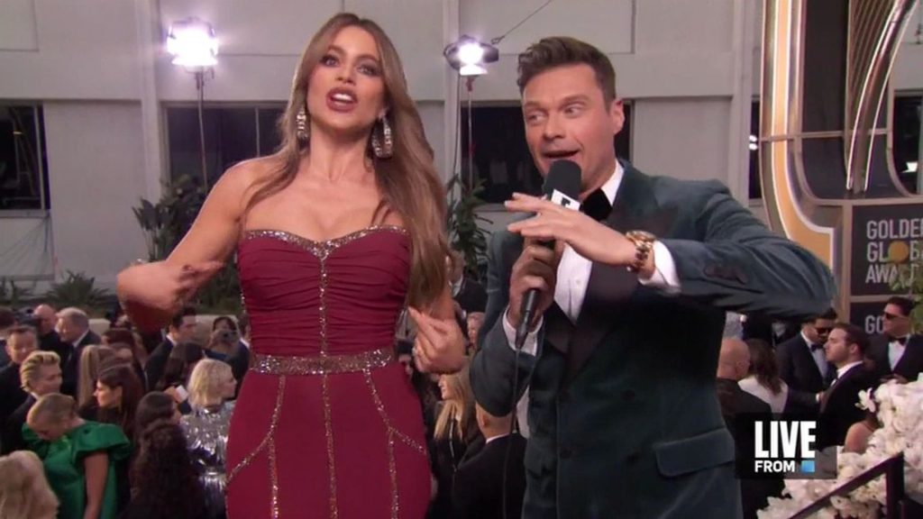 Sofia Vergara dichiara che il suo seno è naturale mentre cammina sul red carpet dei Golden Globes a Beverly Hills, 01/05/2020.