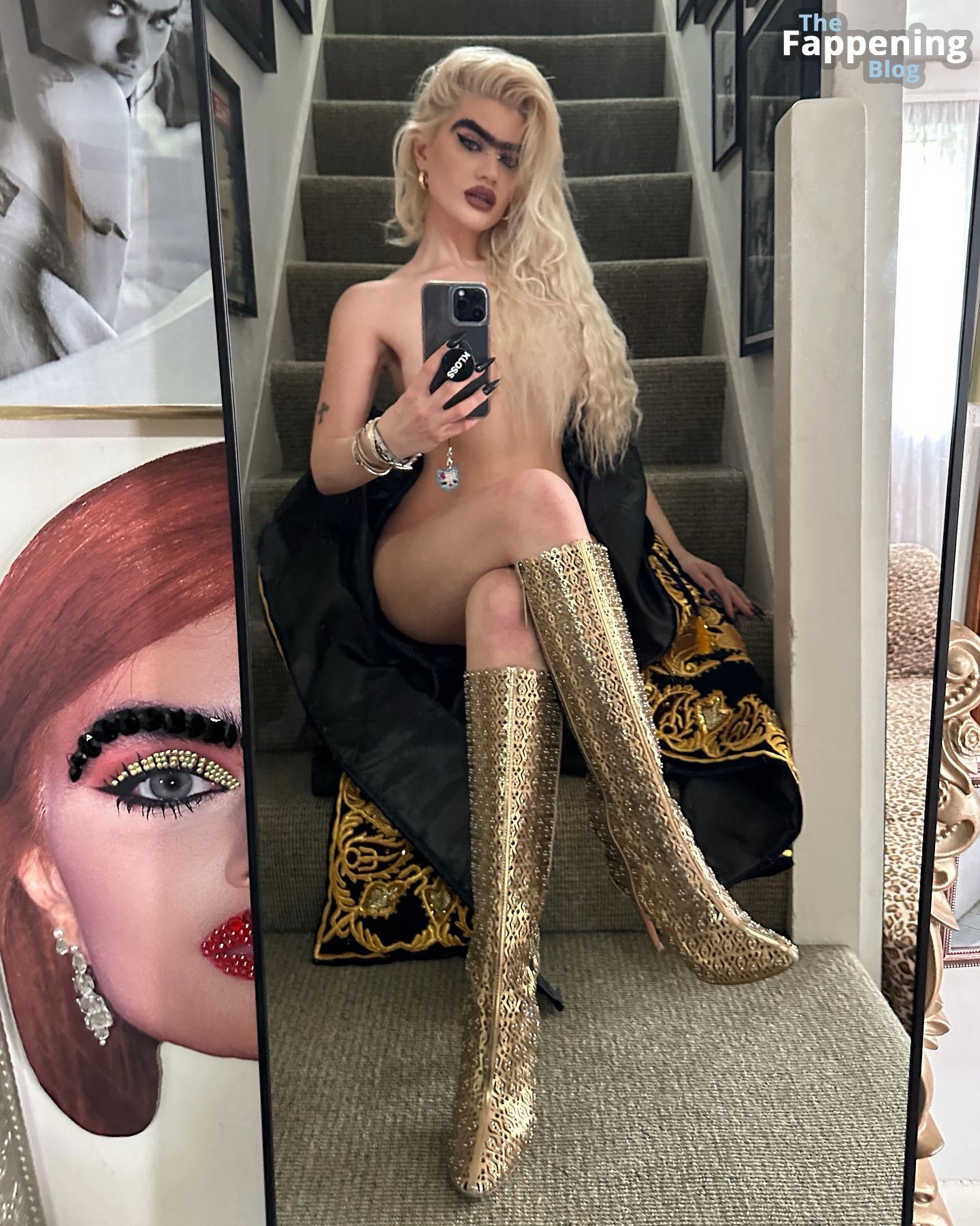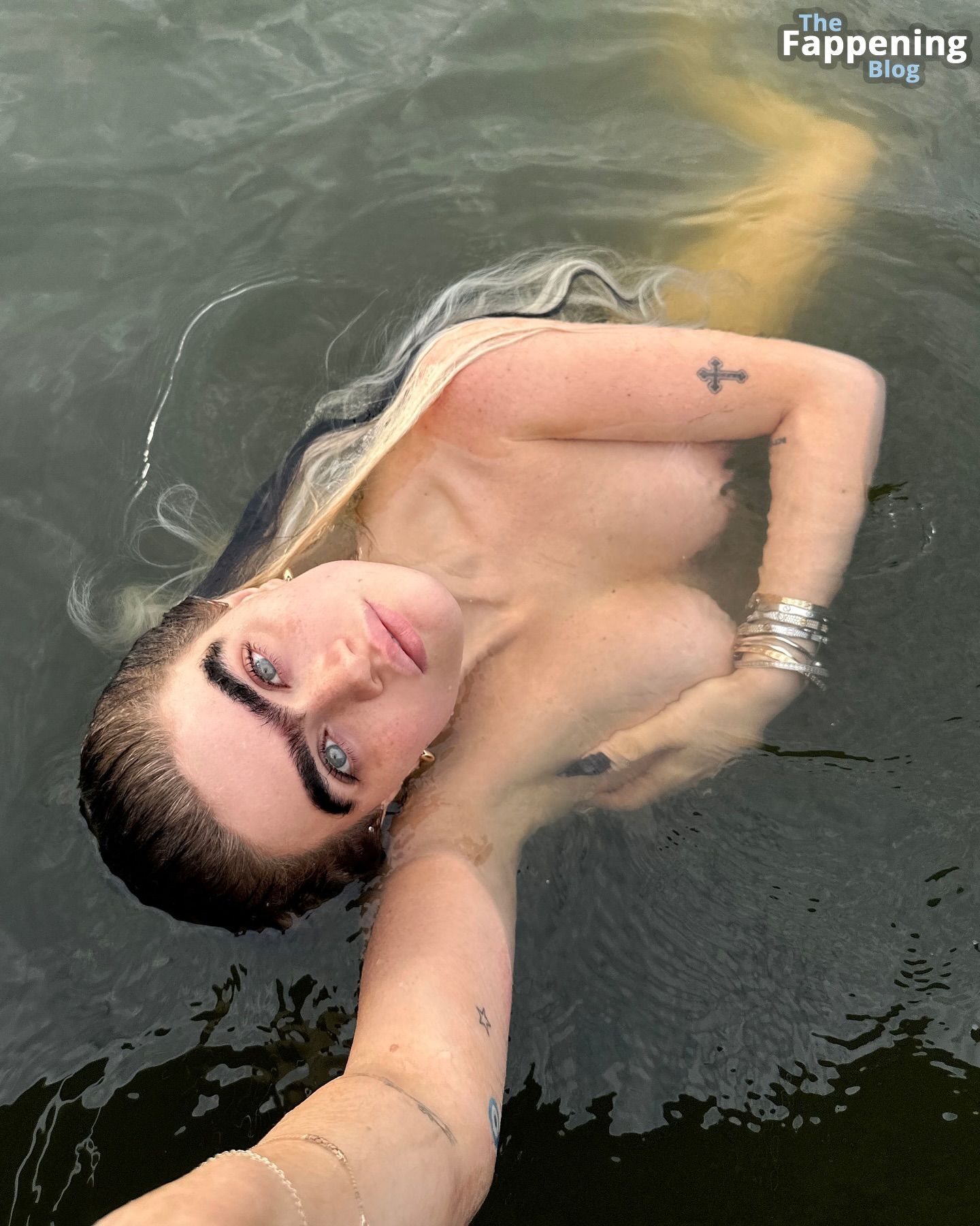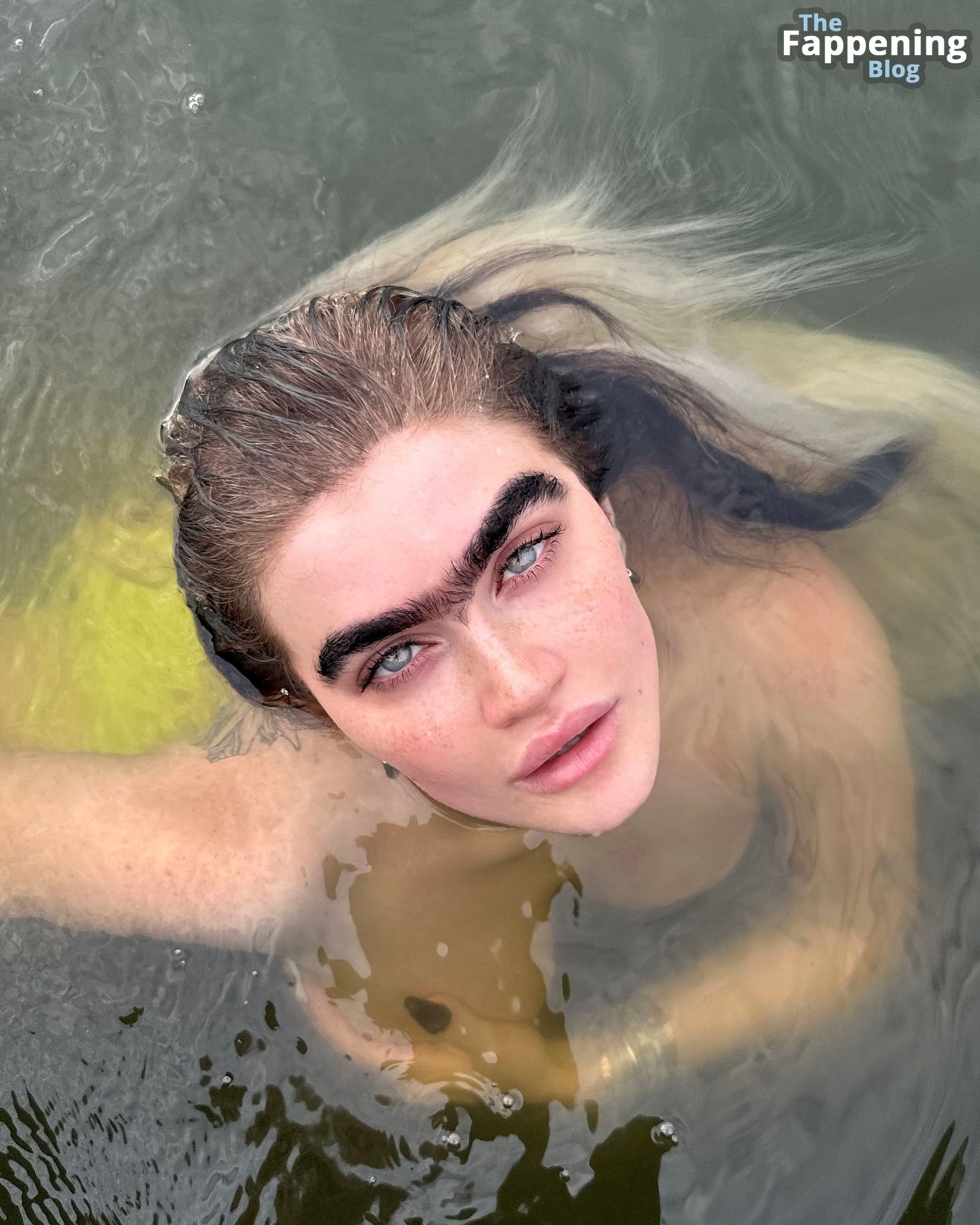 Il suo corpo seminudo è immerso nell’acqua, con delle croci nere che coprono i capezzoli. Ma diciamolo chiaramente — quelle croci aggiungono solo mistero, facendo volare la fantasia.