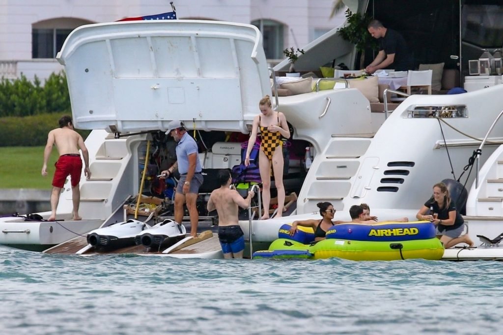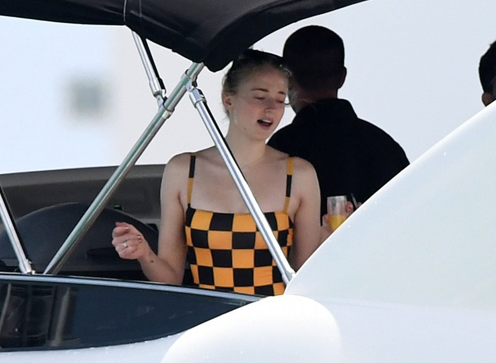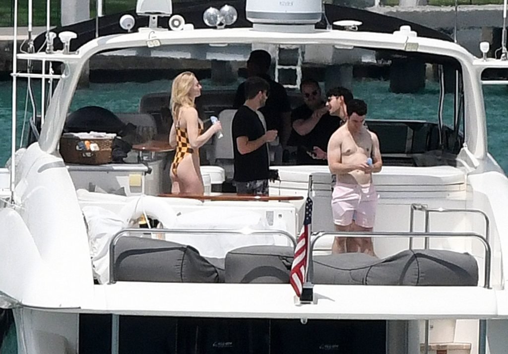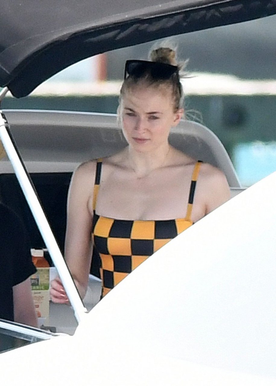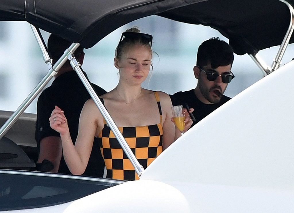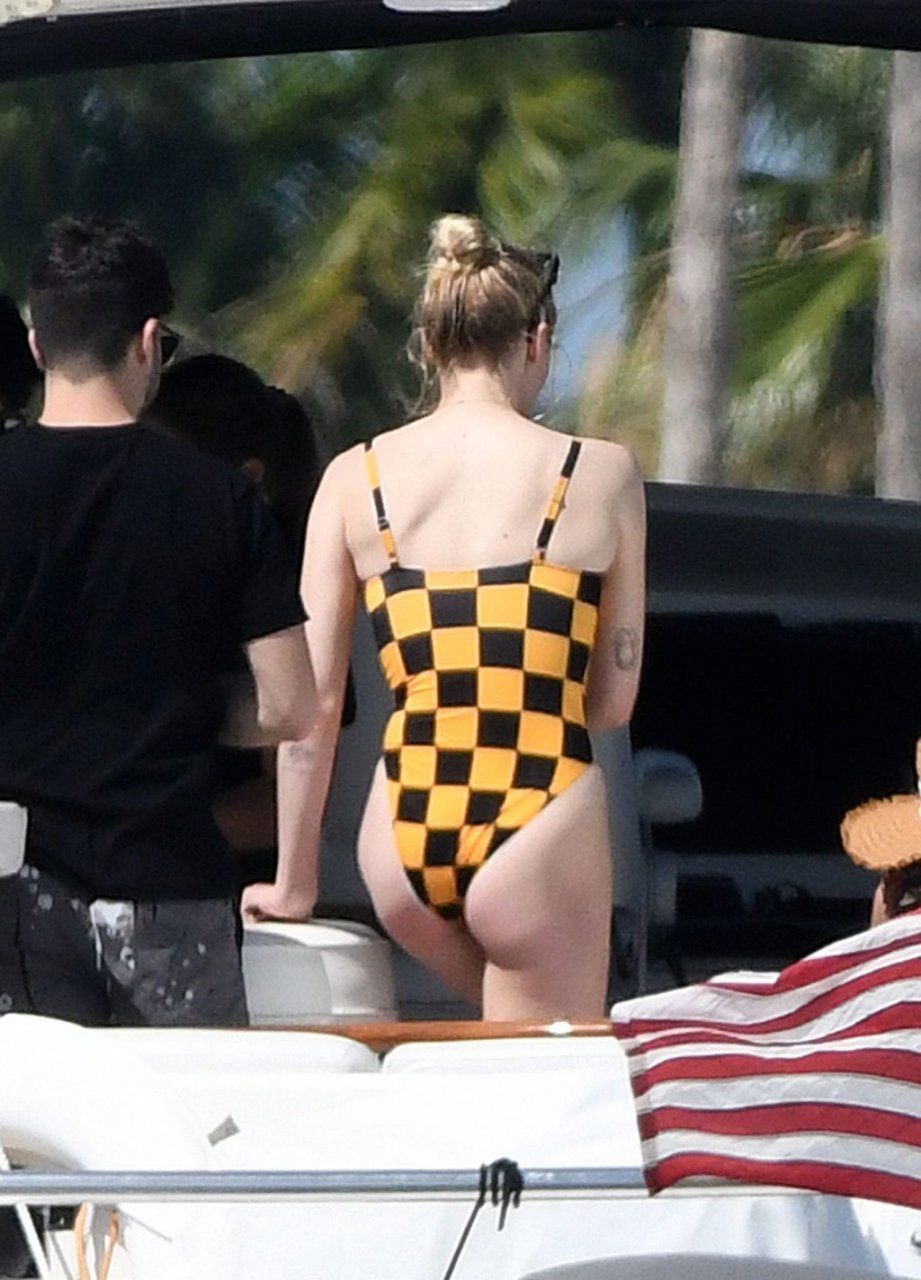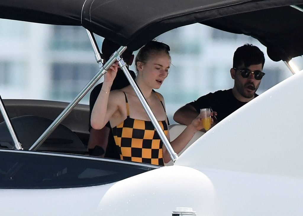 La star di “Game of Thrones” Sophie Turner indossa un costume da bagno a quadri mentre si diverte con i Jonas Brothers e Priyanka Chopra a Miami, 25/03/2019.