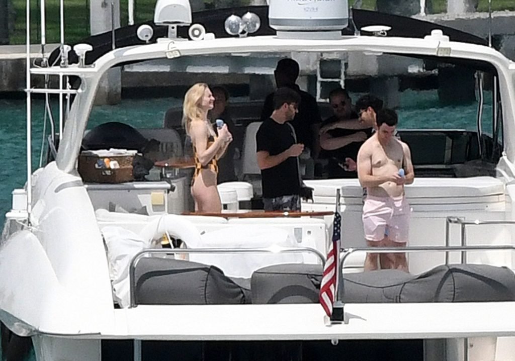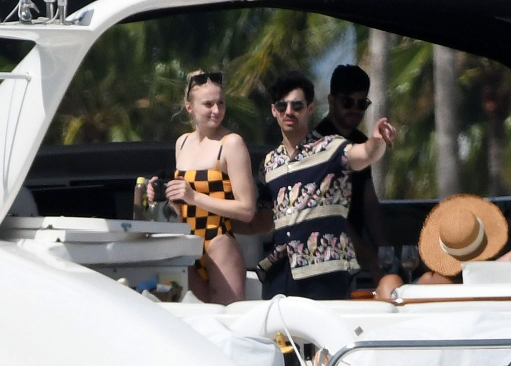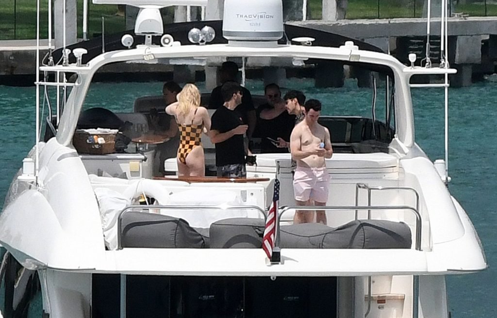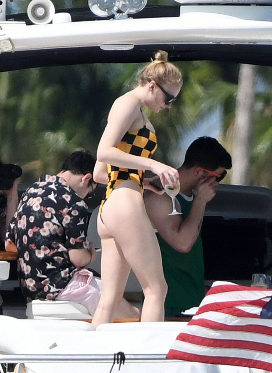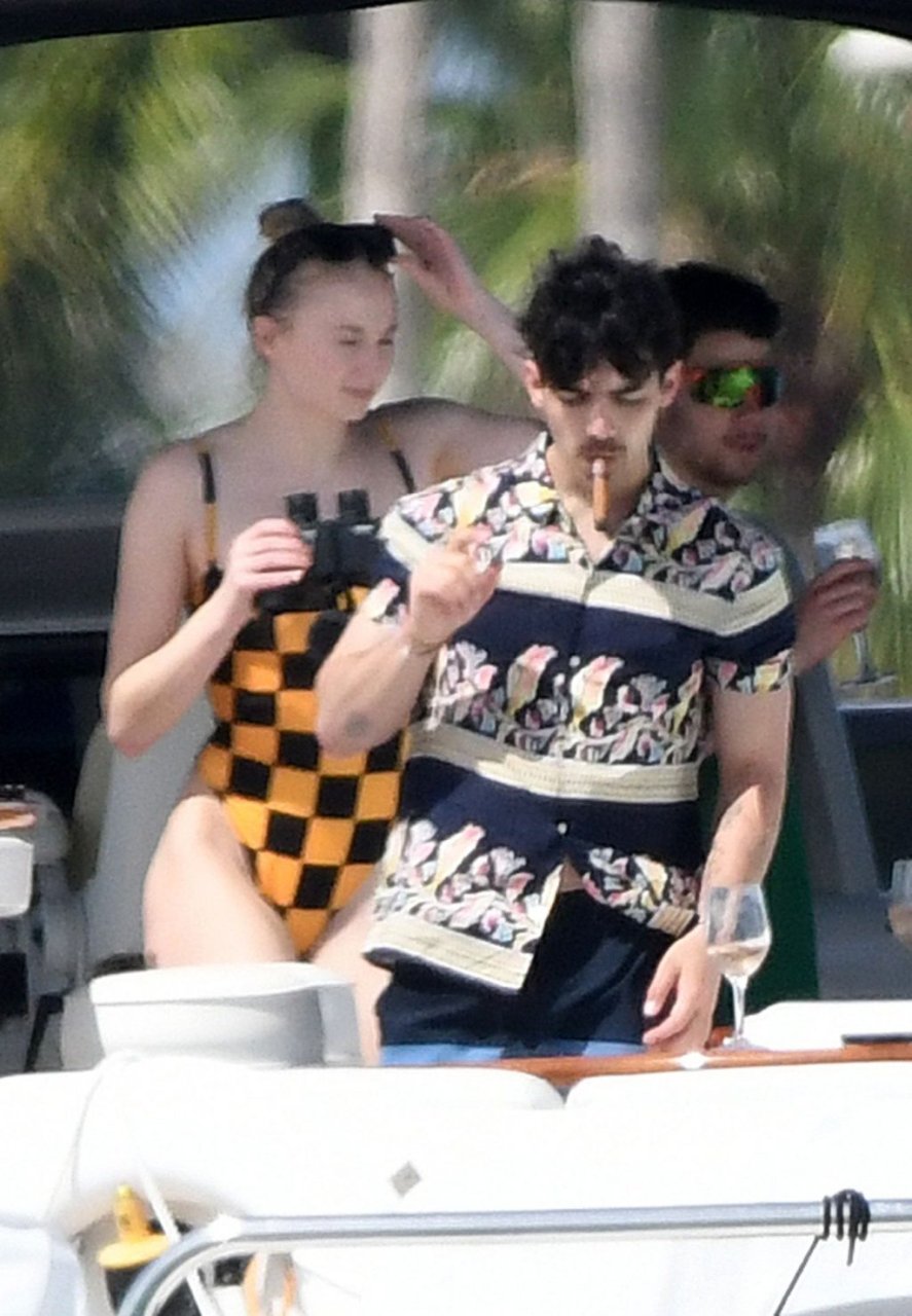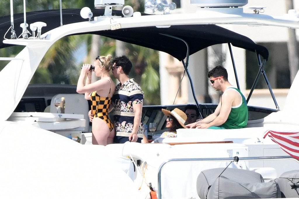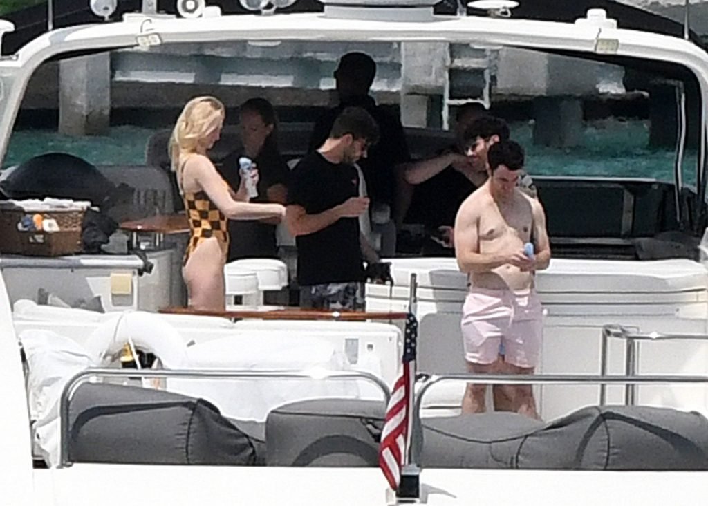 La star di “Game of Thrones” Sophie Turner indossa un costume da bagno a quadri mentre si diverte con i Jonas Brothers e Priyanka Chopra a Miami, 25/03/2019.
