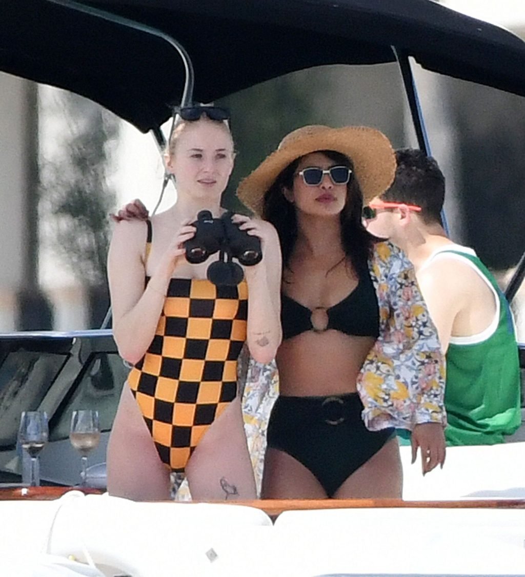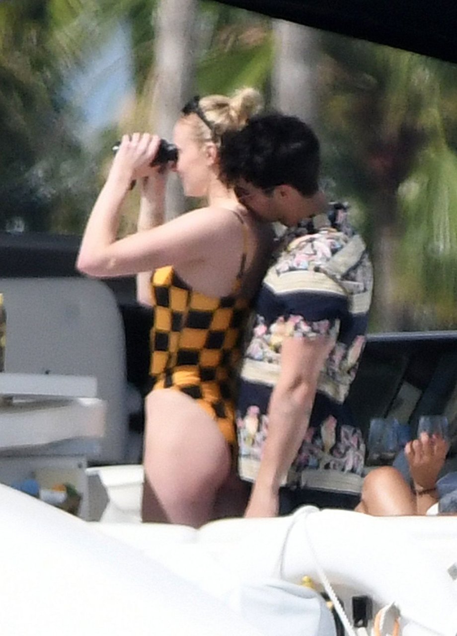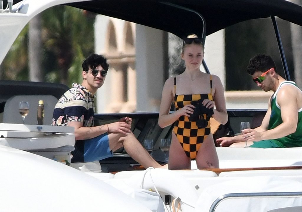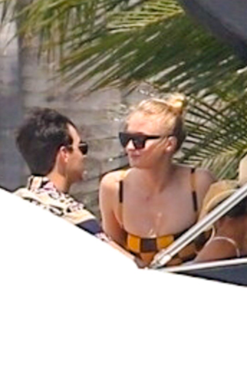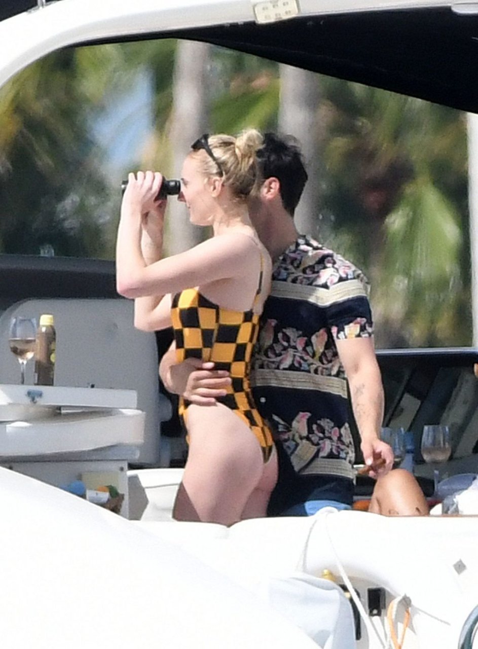 La star di “Game of Thrones” Sophie Turner indossa un costume da bagno a quadri mentre si diverte con i Jonas Brothers e Priyanka Chopra a Miami, 25/03/2019.