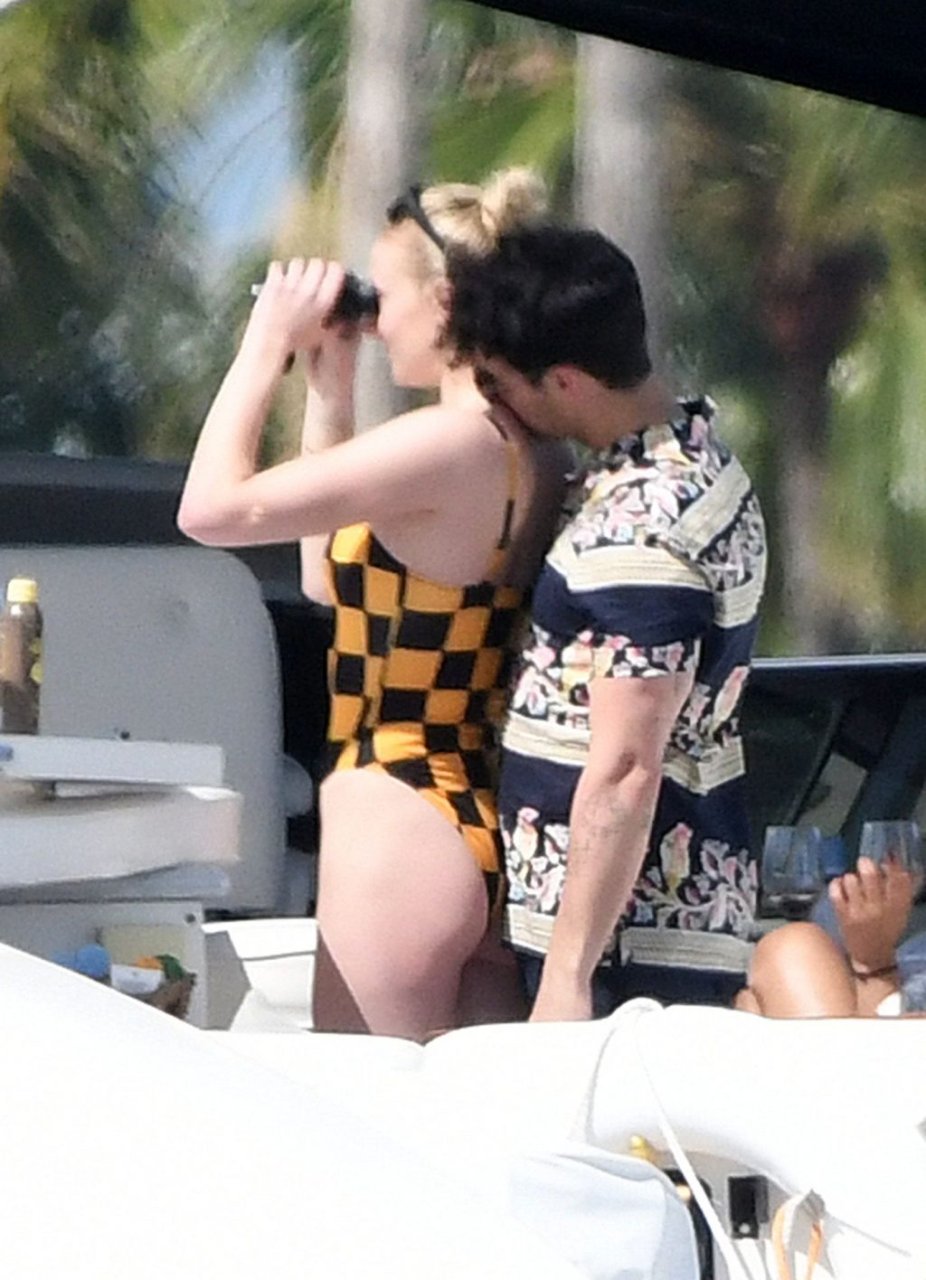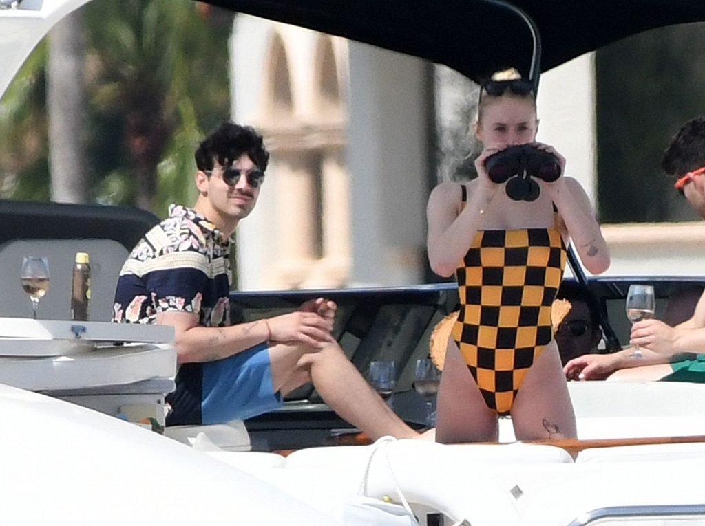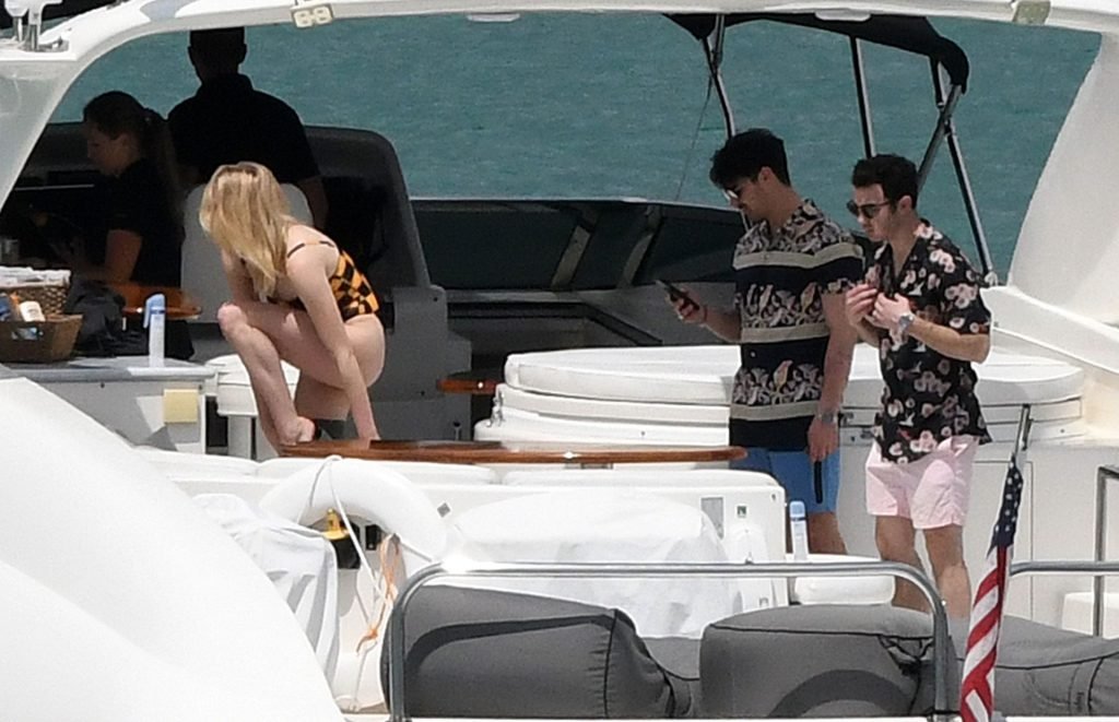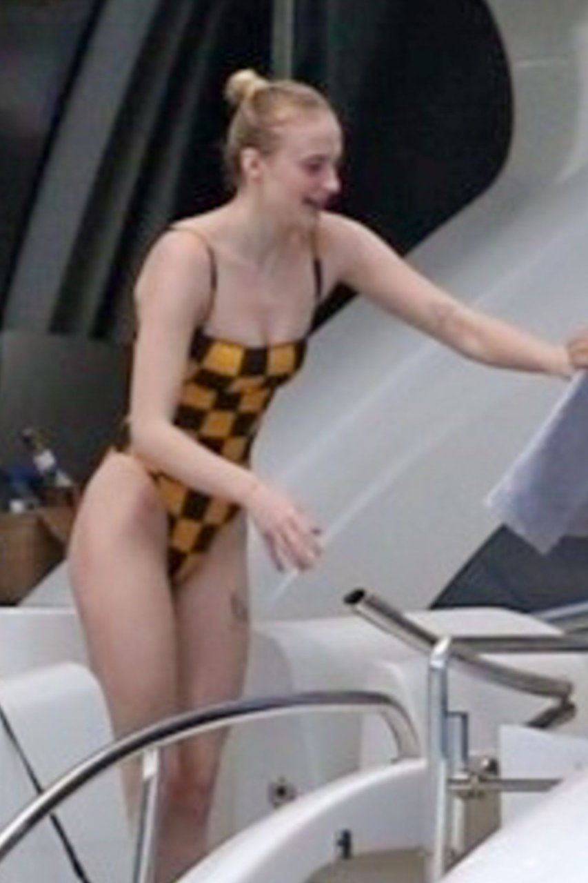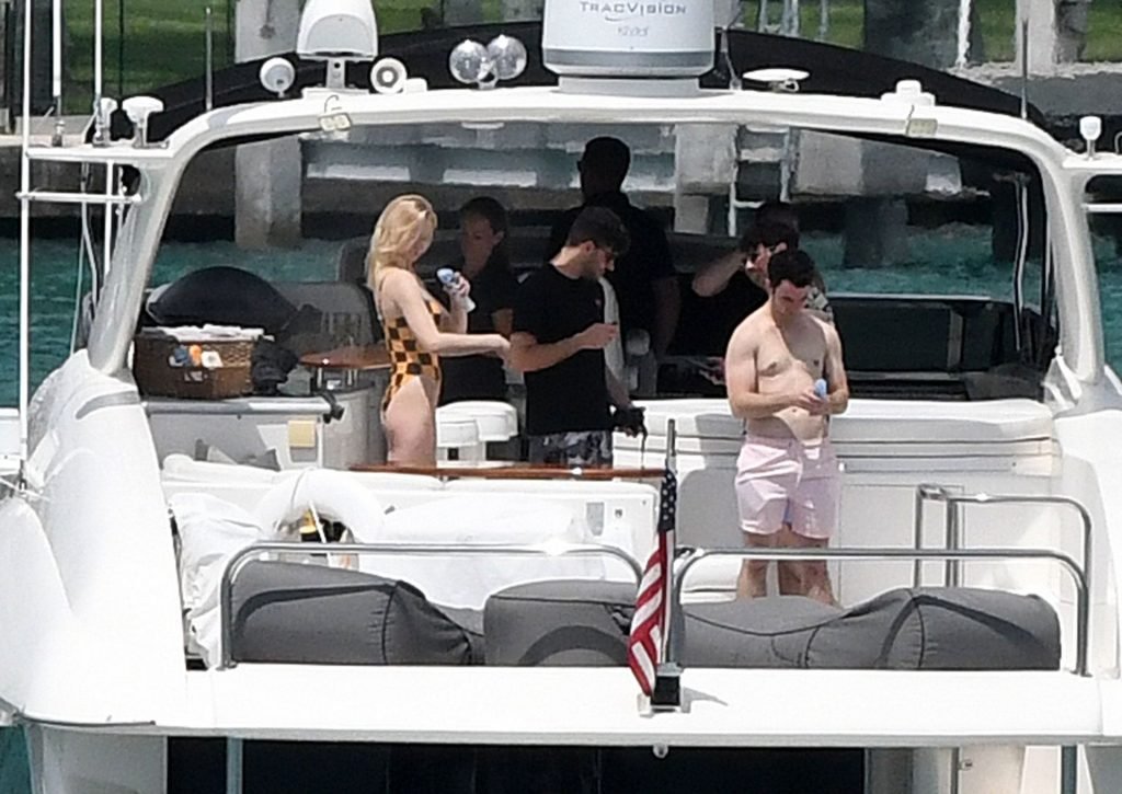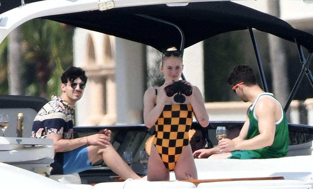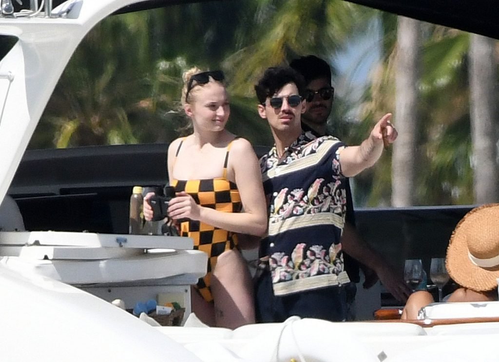 La star di “Game of Thrones” Sophie Turner indossa un costume da bagno a quadri mentre si diverte con i Jonas Brothers e Priyanka Chopra a Miami, 25/03/2019.