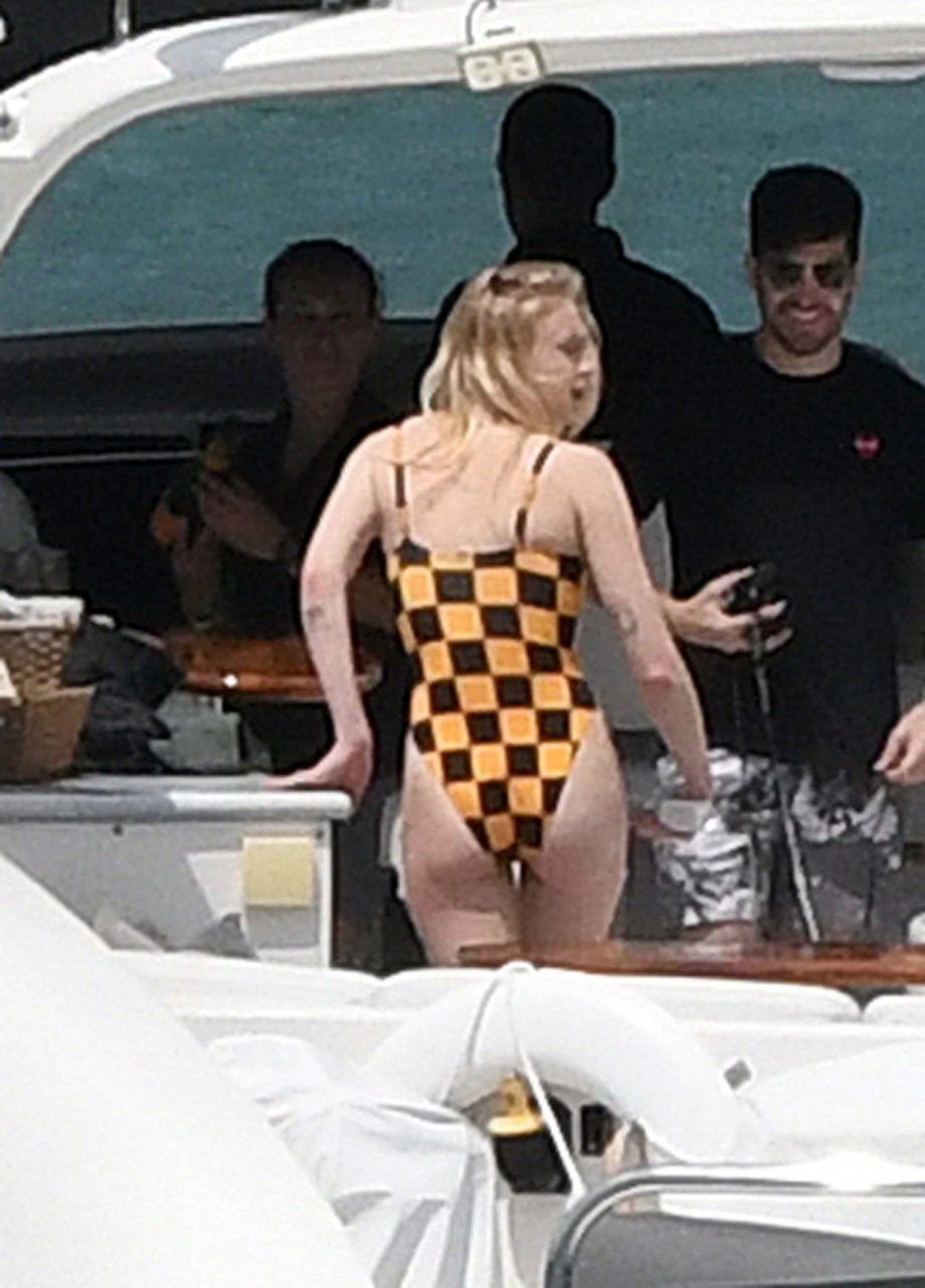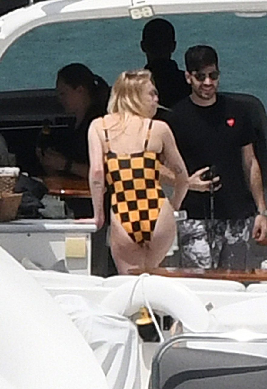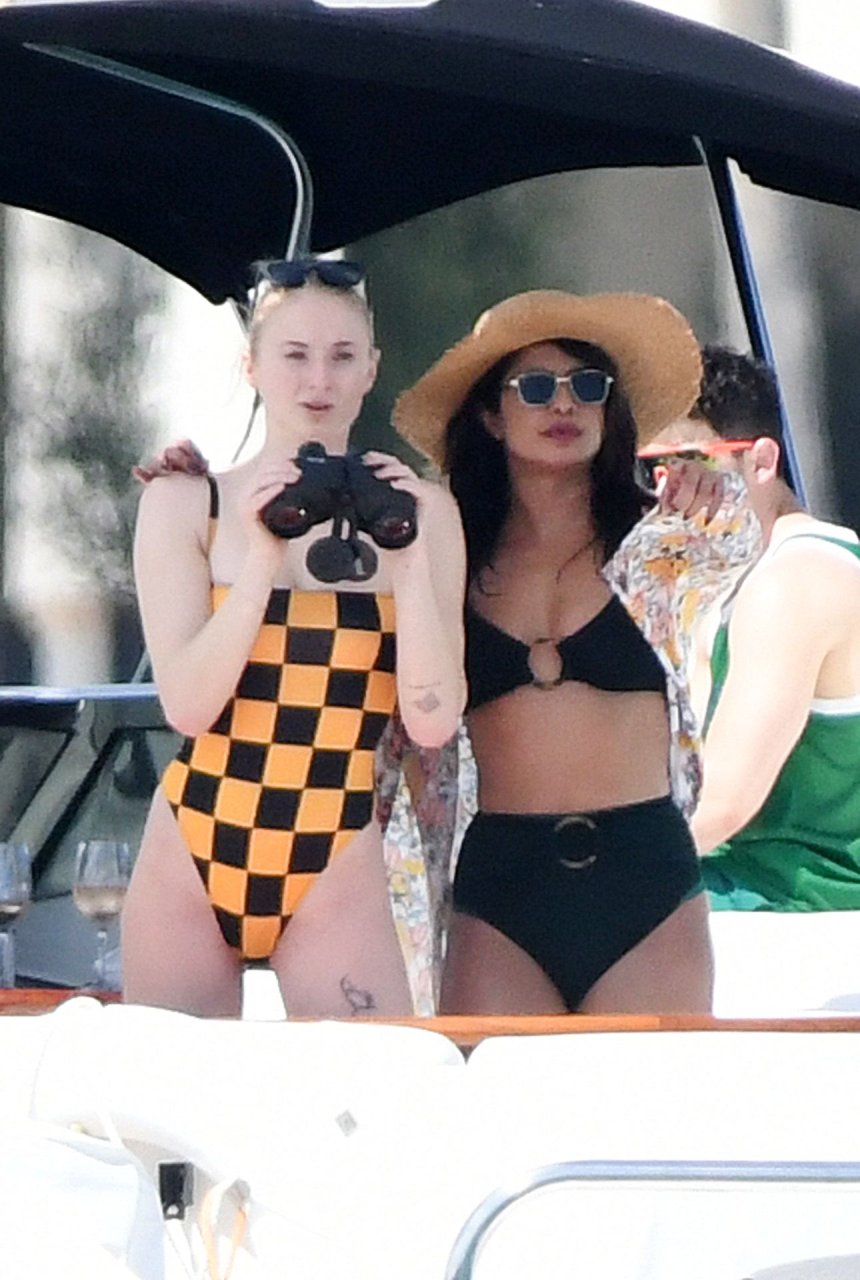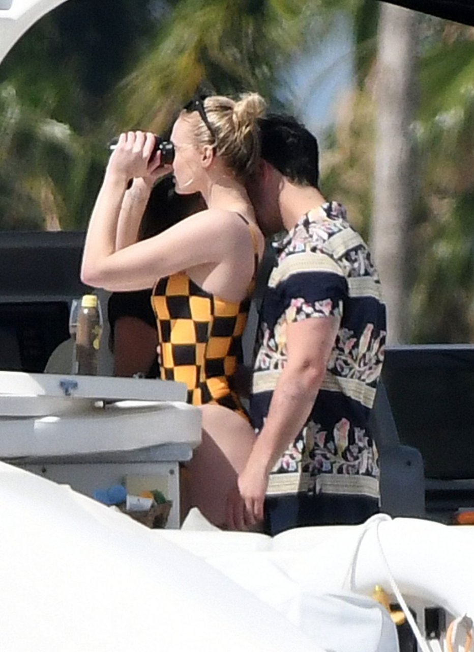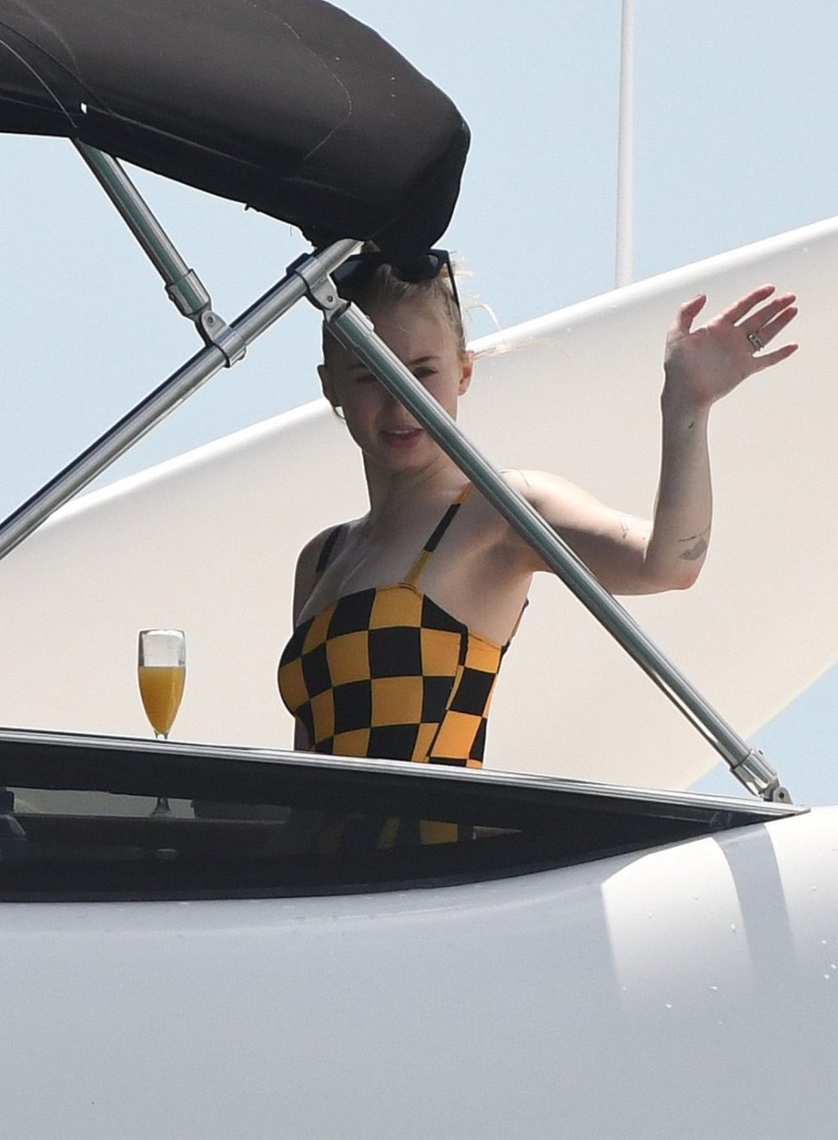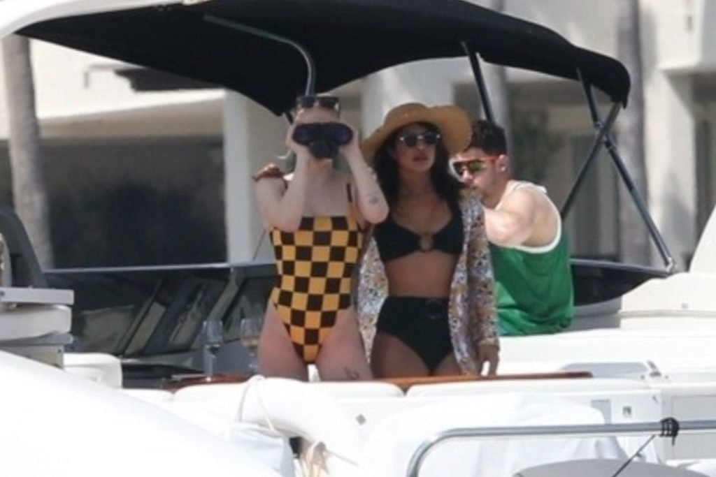 La star di “Game of Thrones” Sophie Turner indossa un costume da bagno a quadri mentre si diverte con i Jonas Brothers e Priyanka Chopra a Miami, 25/03/2019.
