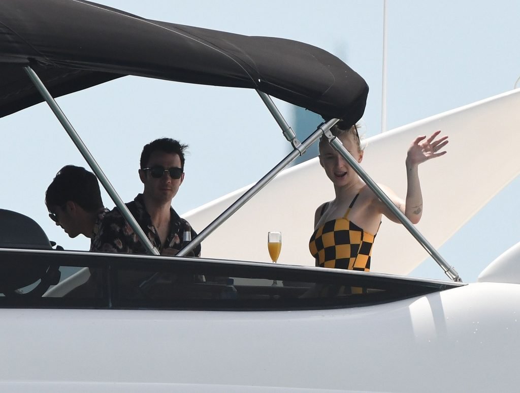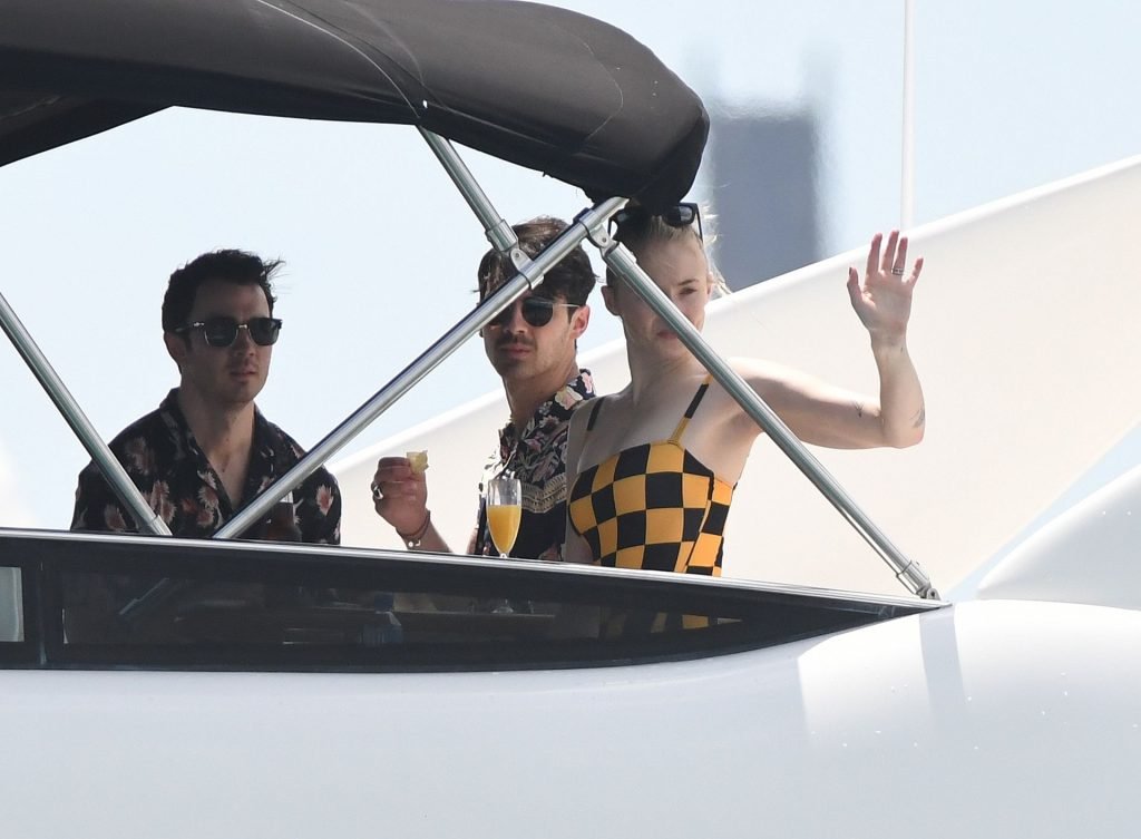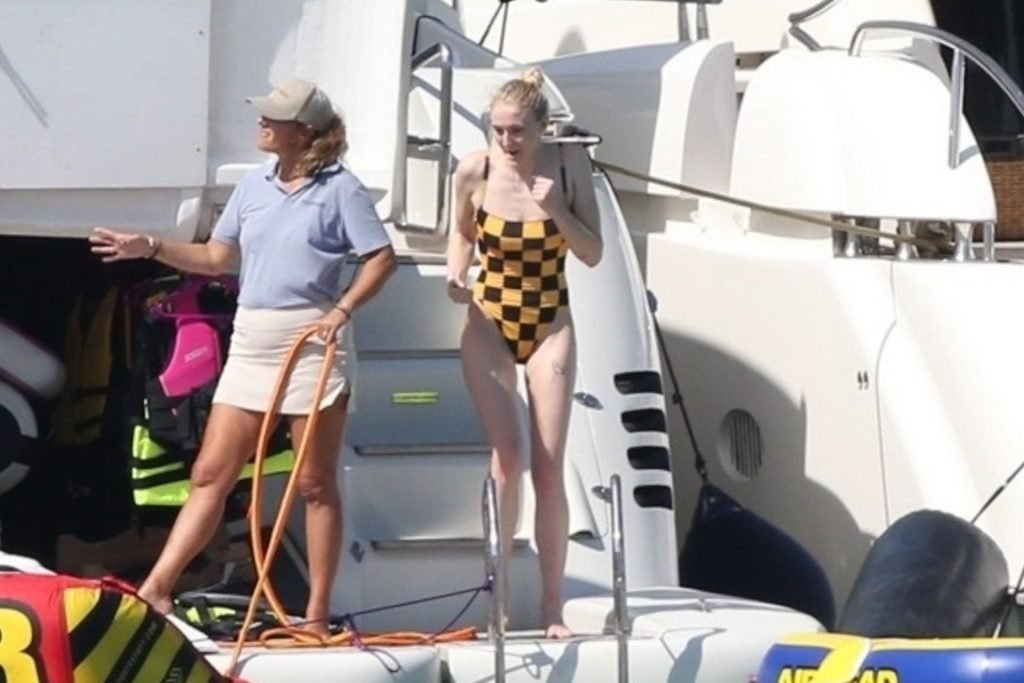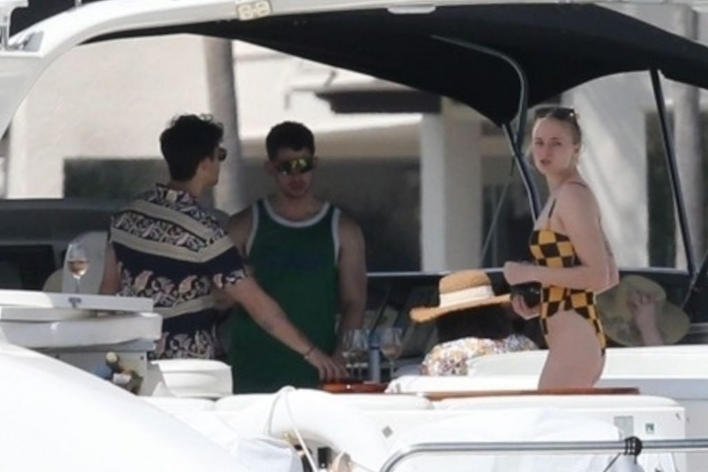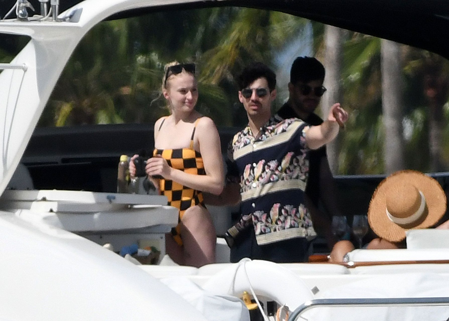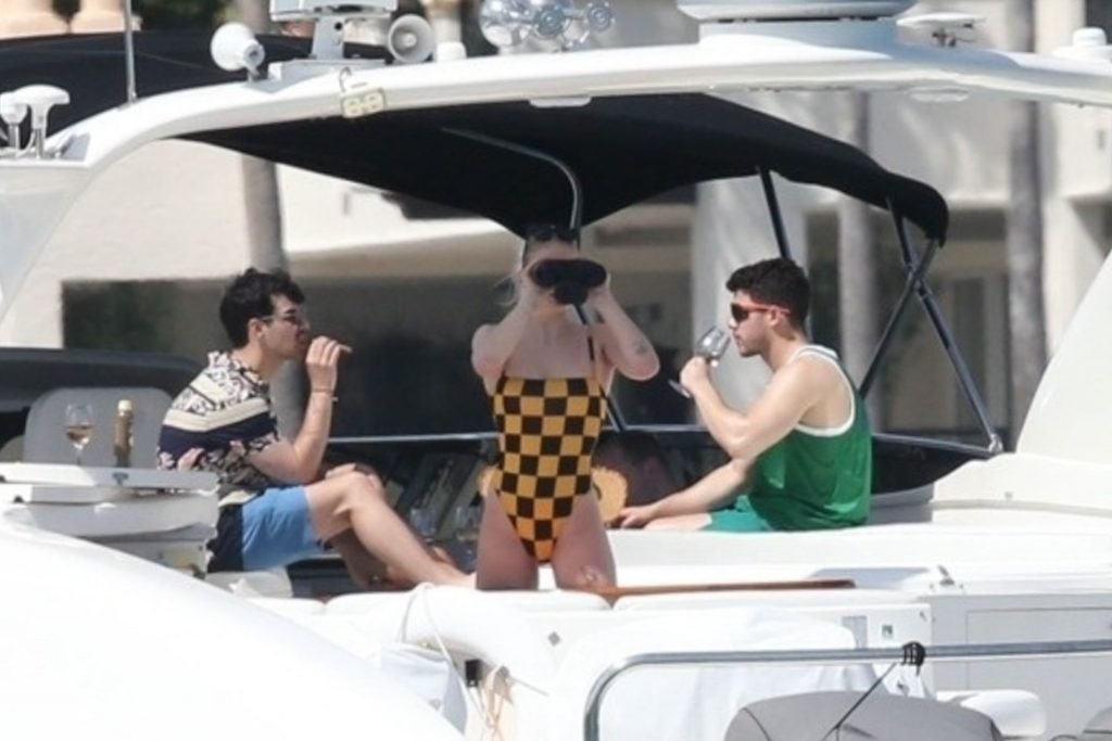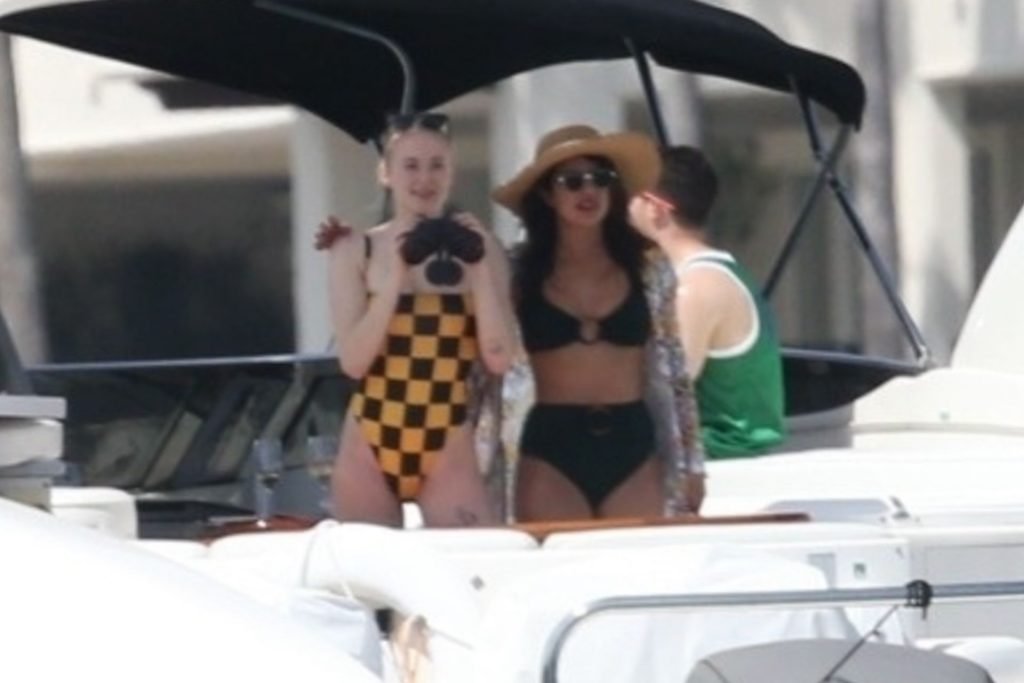 La star di “Game of Thrones” Sophie Turner indossa un costume da bagno a quadri mentre si diverte con i Jonas Brothers e Priyanka Chopra a Miami, 25/03/2019.