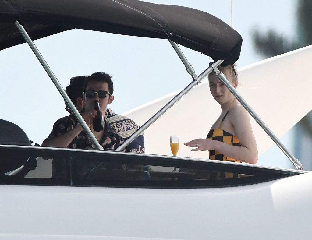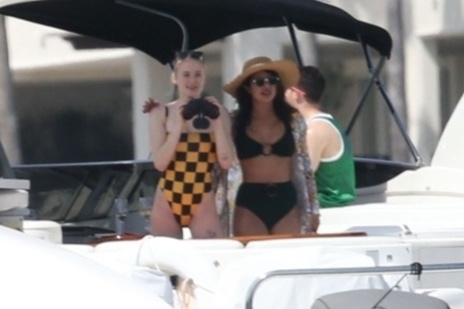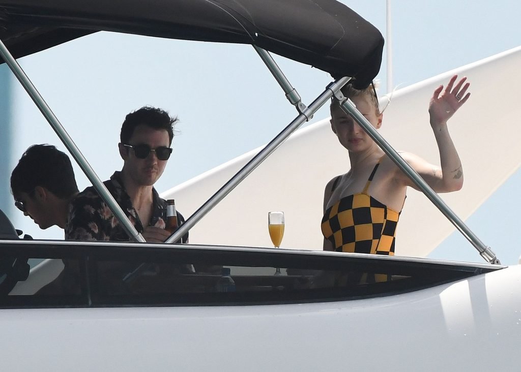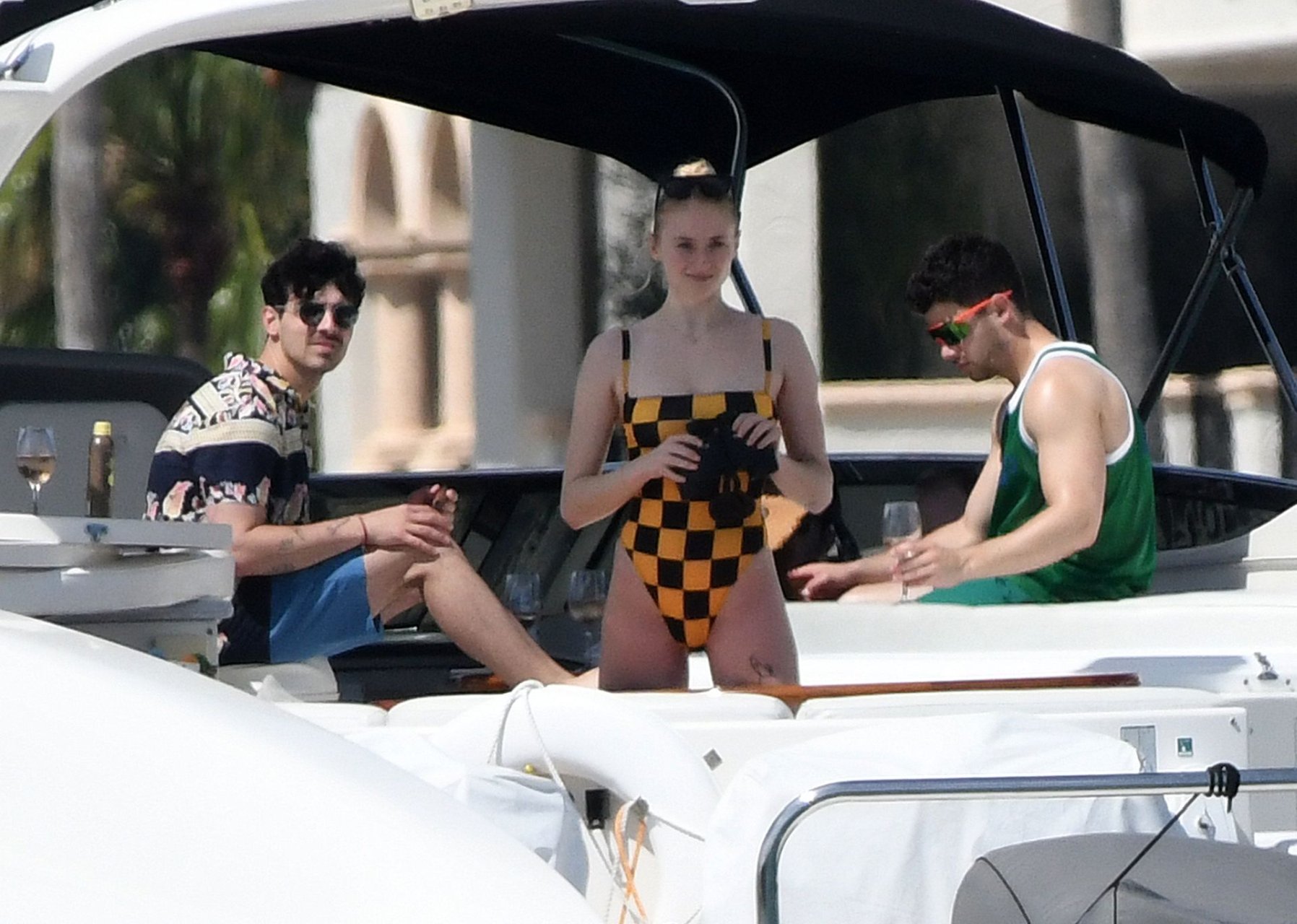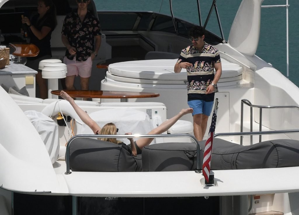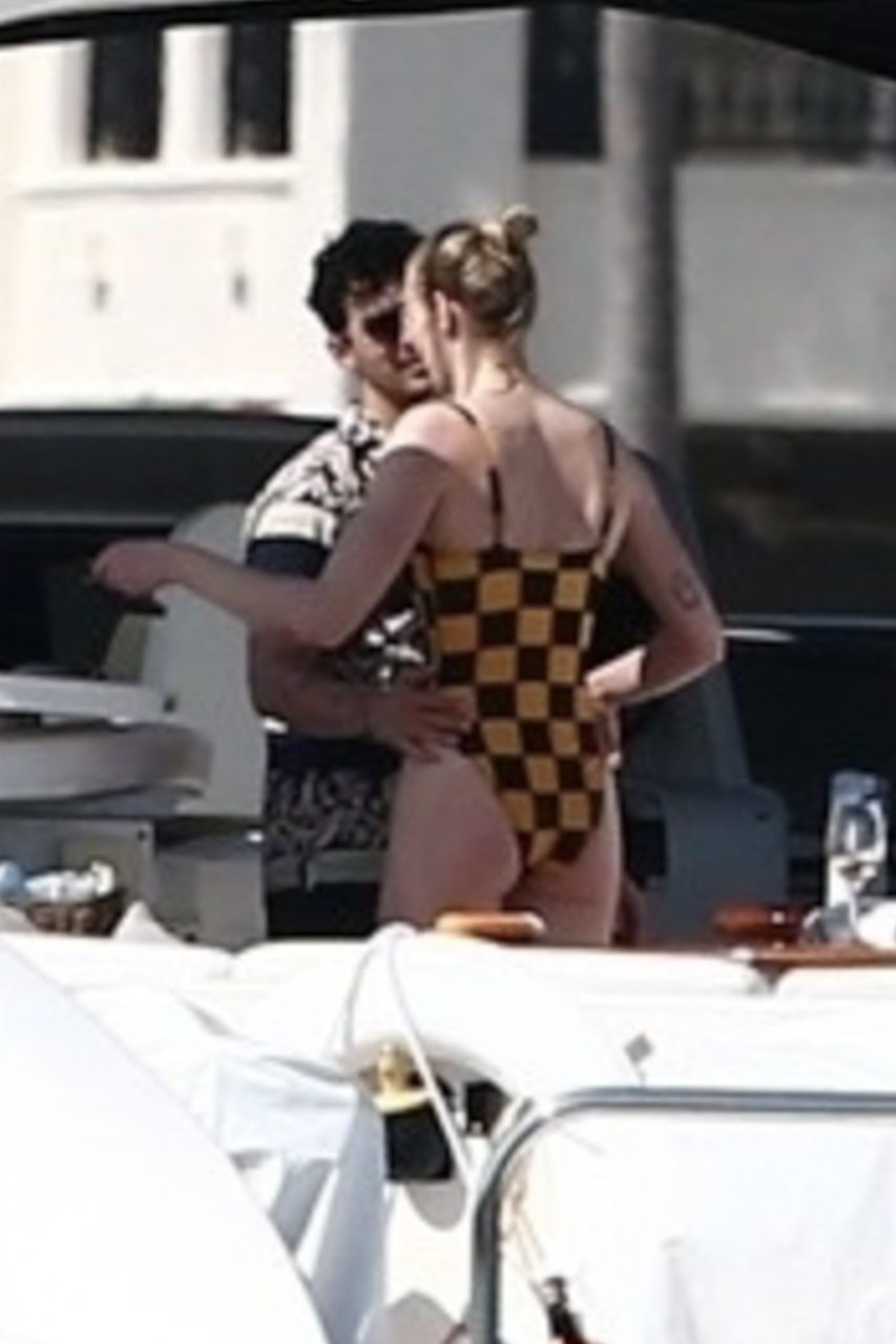 La star di “Game of Thrones” Sophie Turner indossa un costume da bagno a quadri mentre si diverte con i Jonas Brothers e Priyanka Chopra a Miami, 25/03/2019.