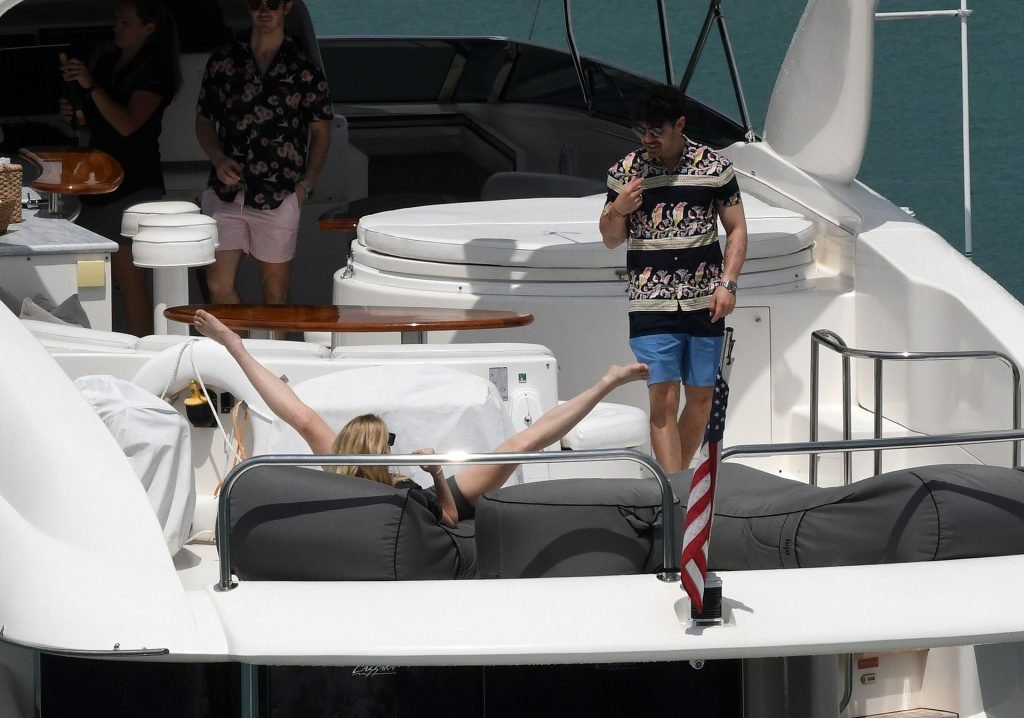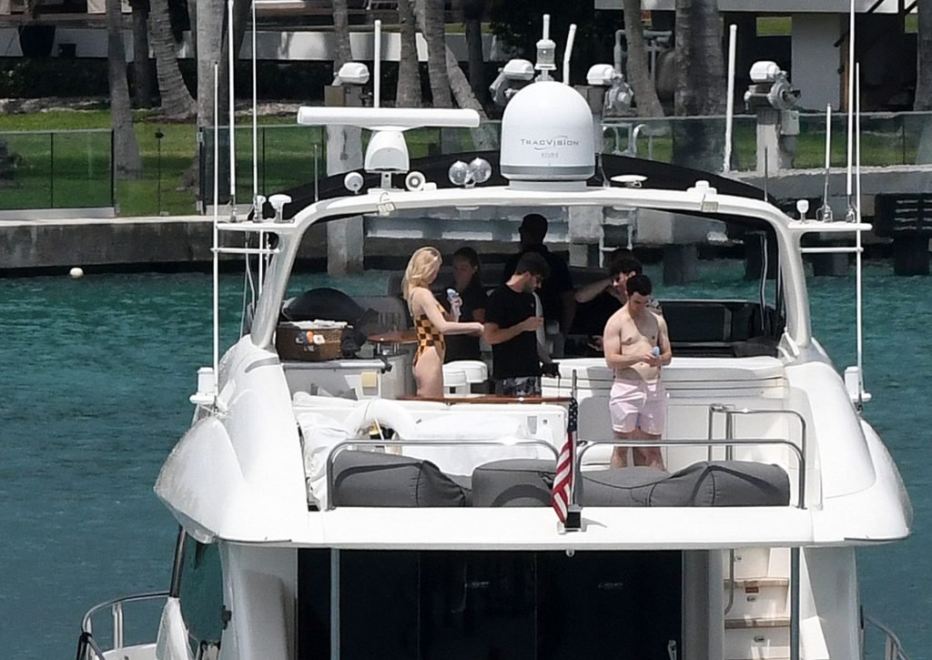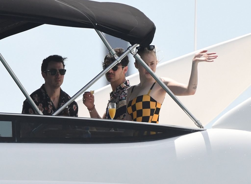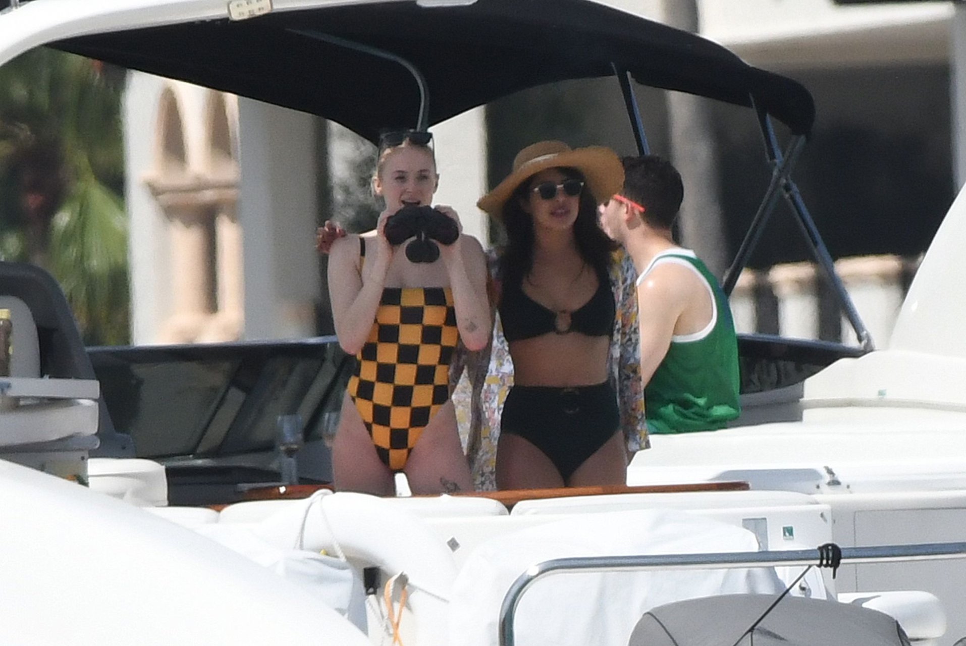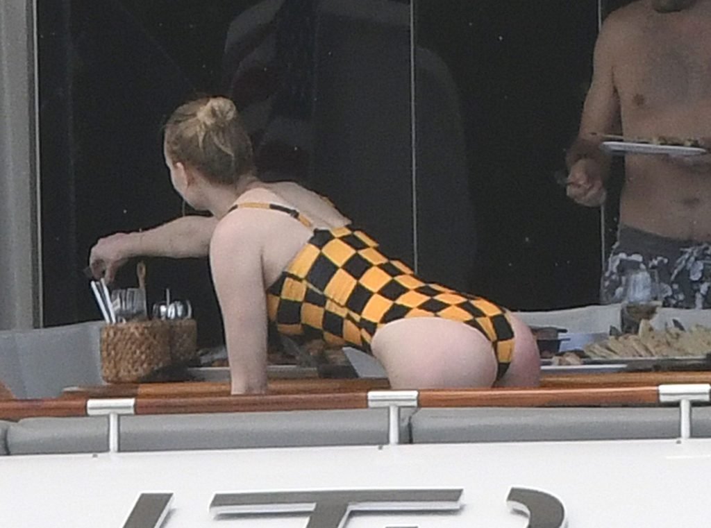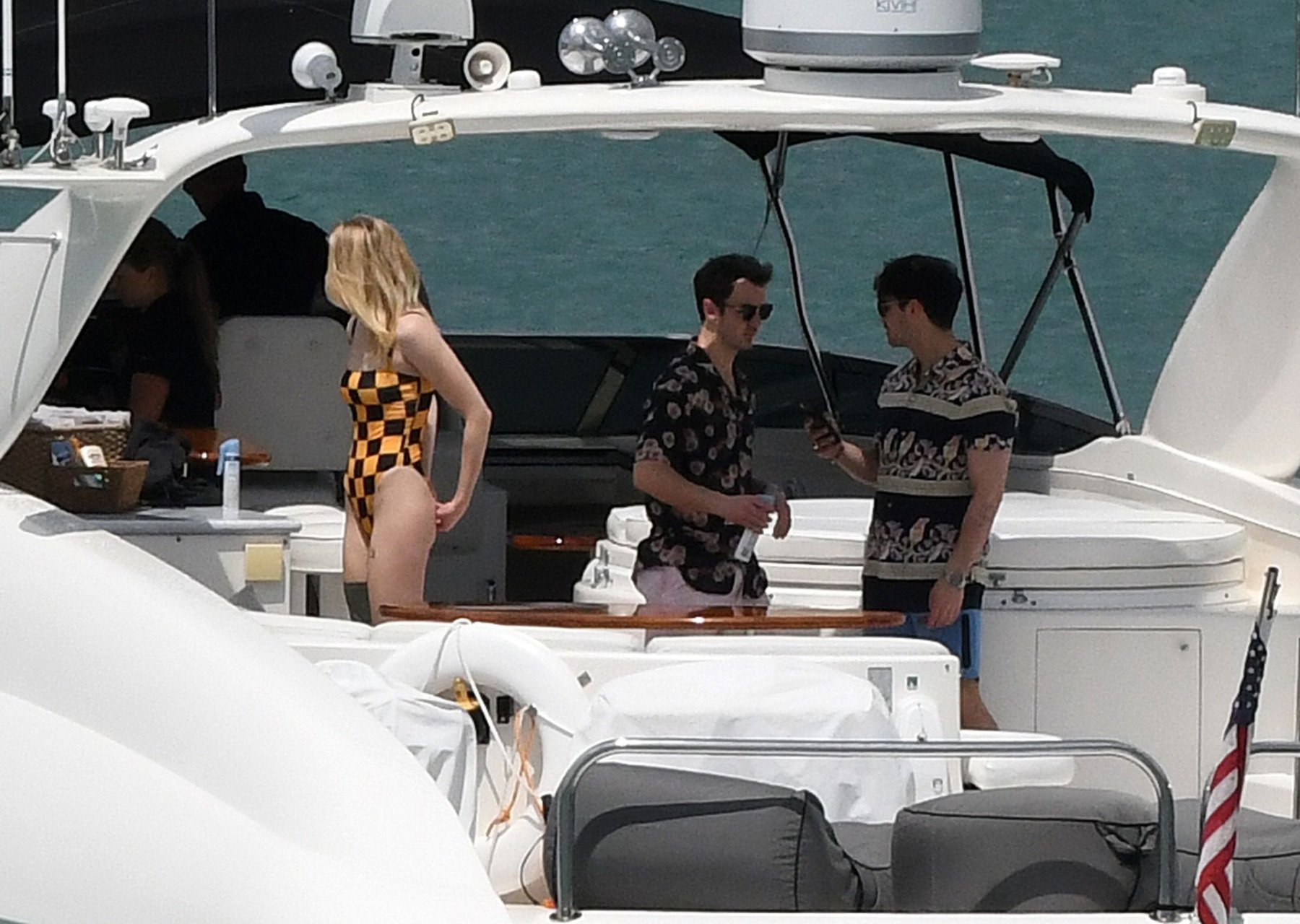 La star di “Game of Thrones” Sophie Turner indossa un costume da bagno a quadri mentre si diverte con i Jonas Brothers e Priyanka Chopra a Miami, 25/03/2019.