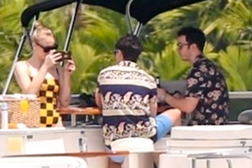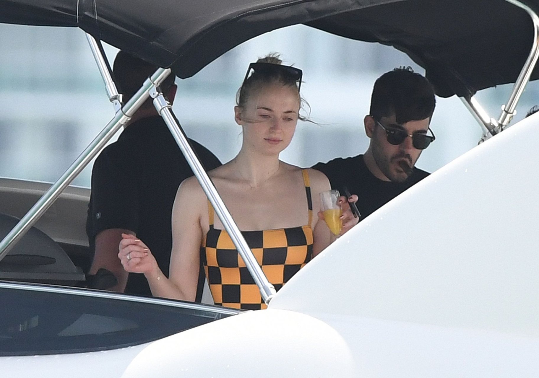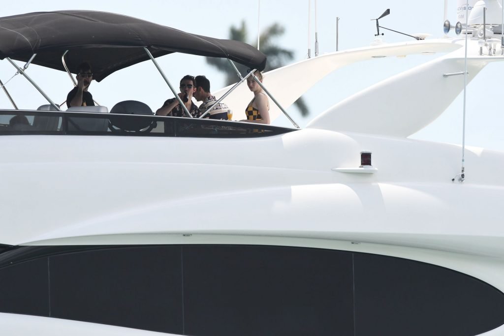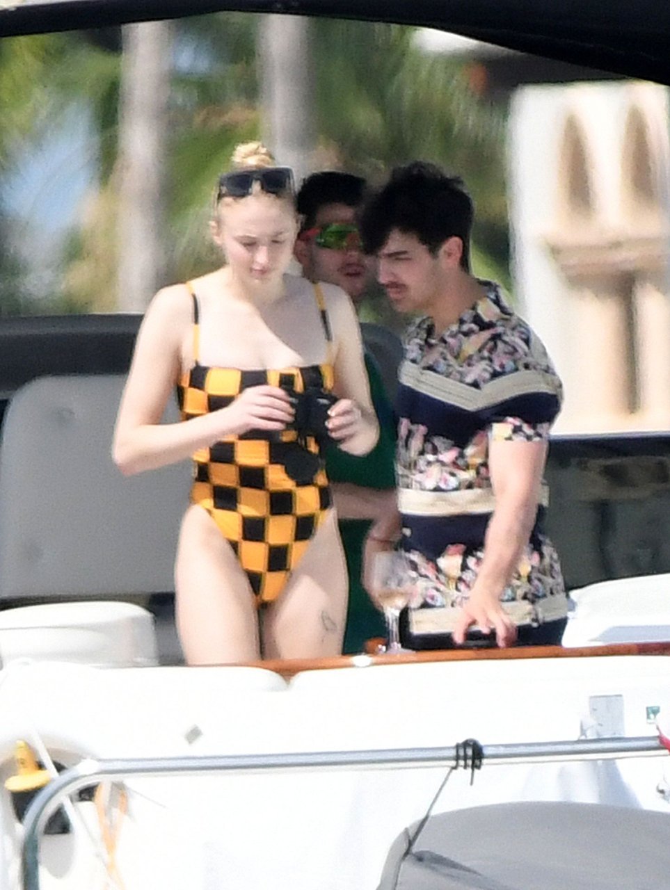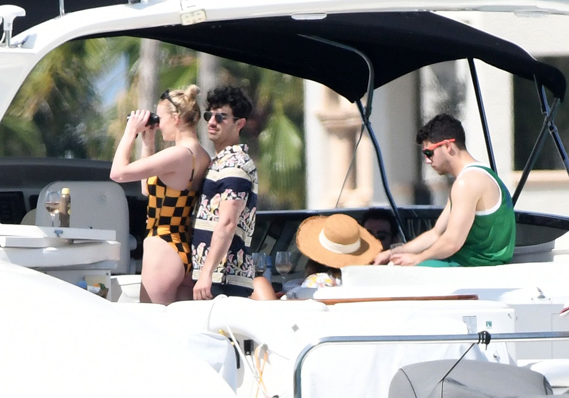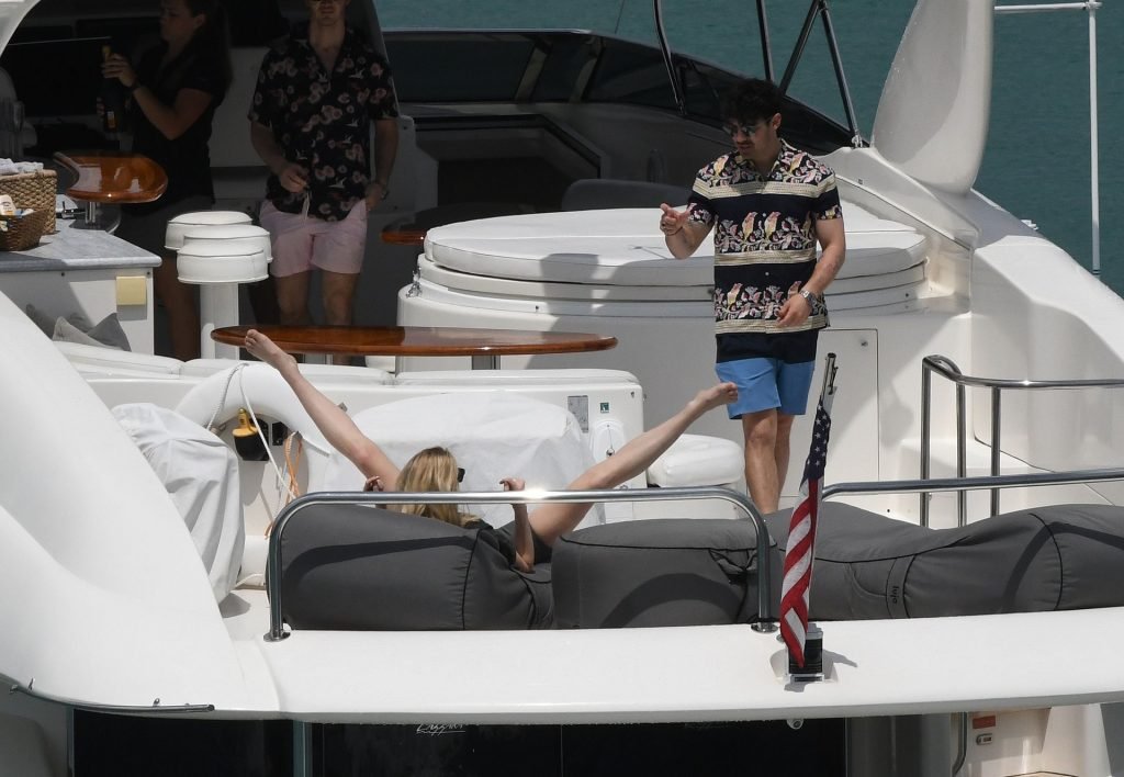La star di “Game of Thrones” Sophie Turner indossa un costume da bagno a quadri mentre si diverte con i Jonas Brothers e Priyanka Chopra a Miami, 25/03/2019.