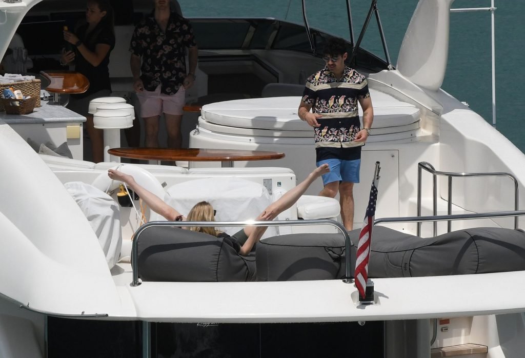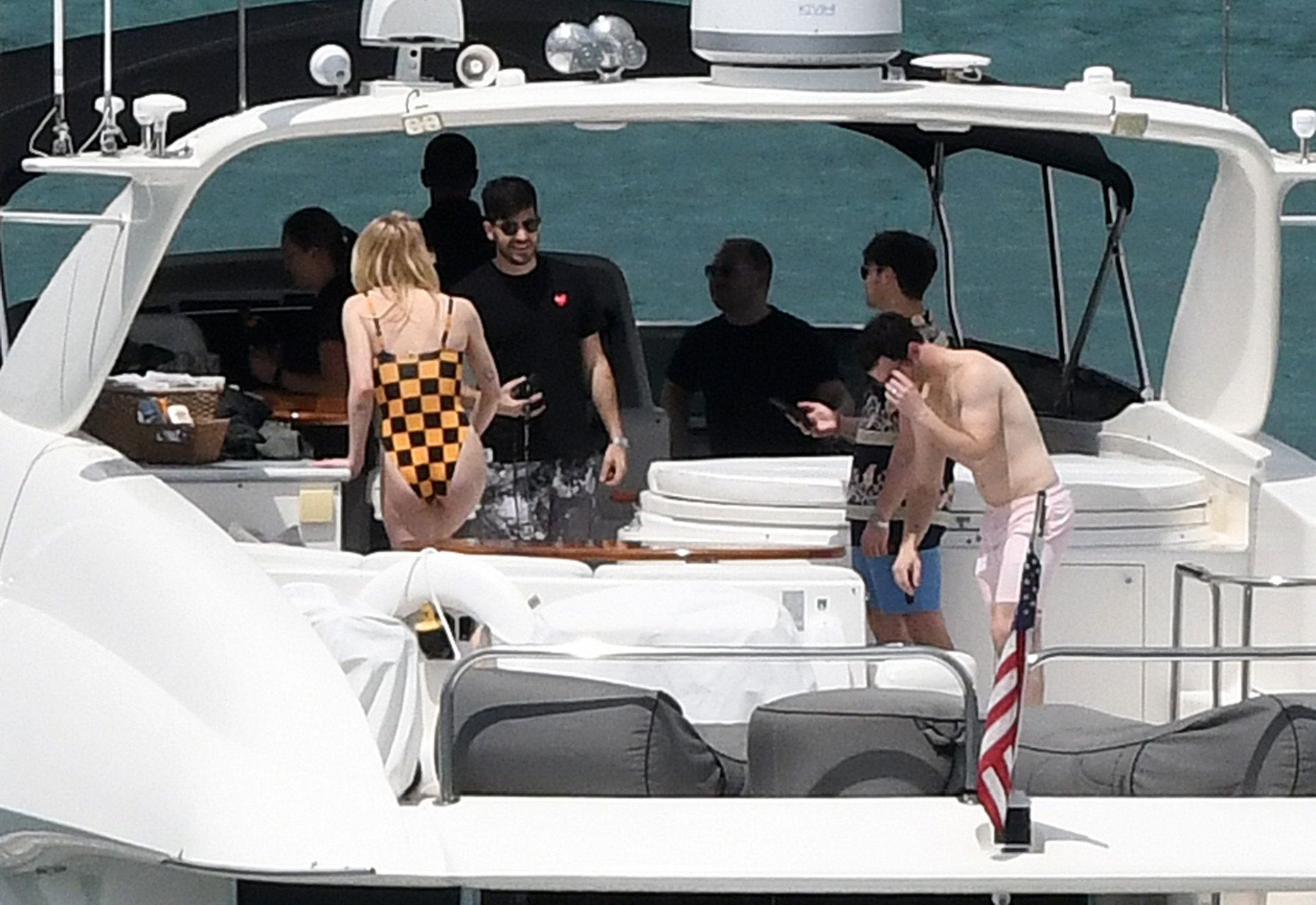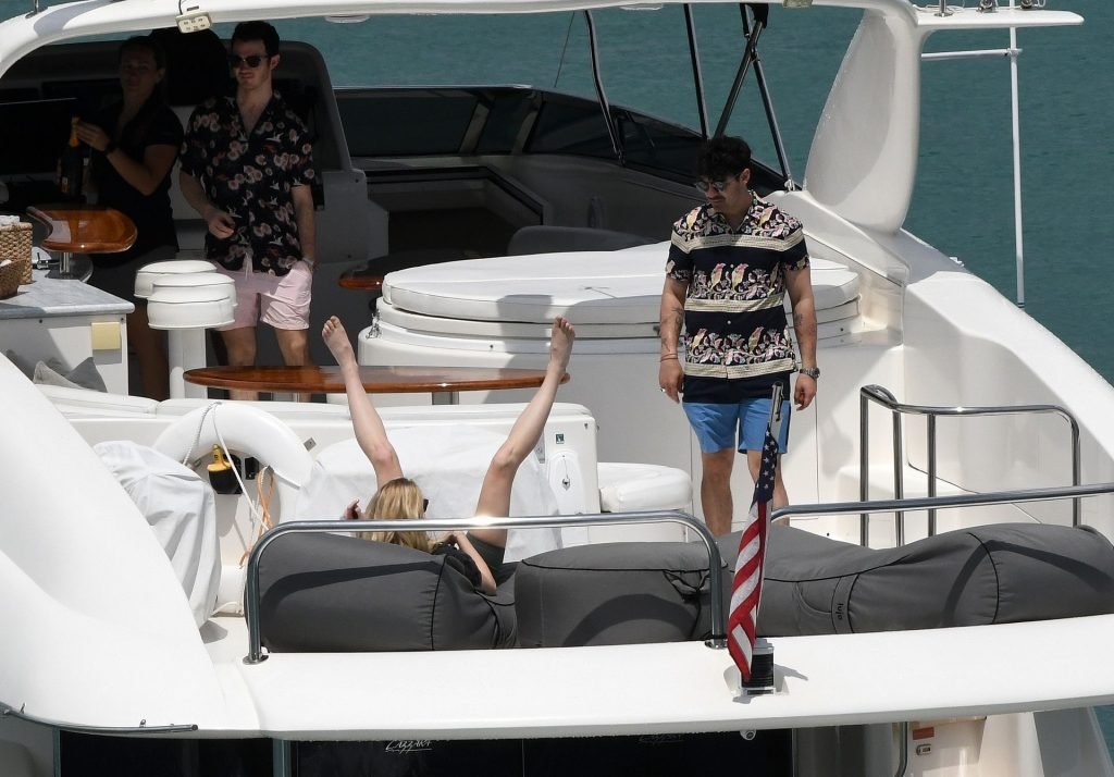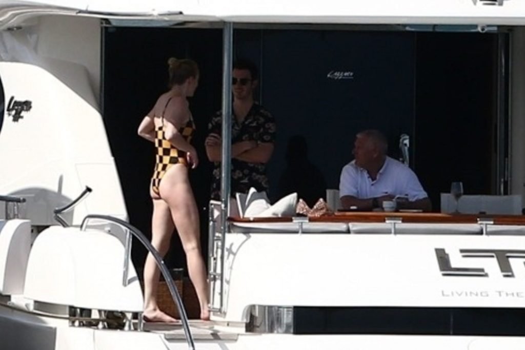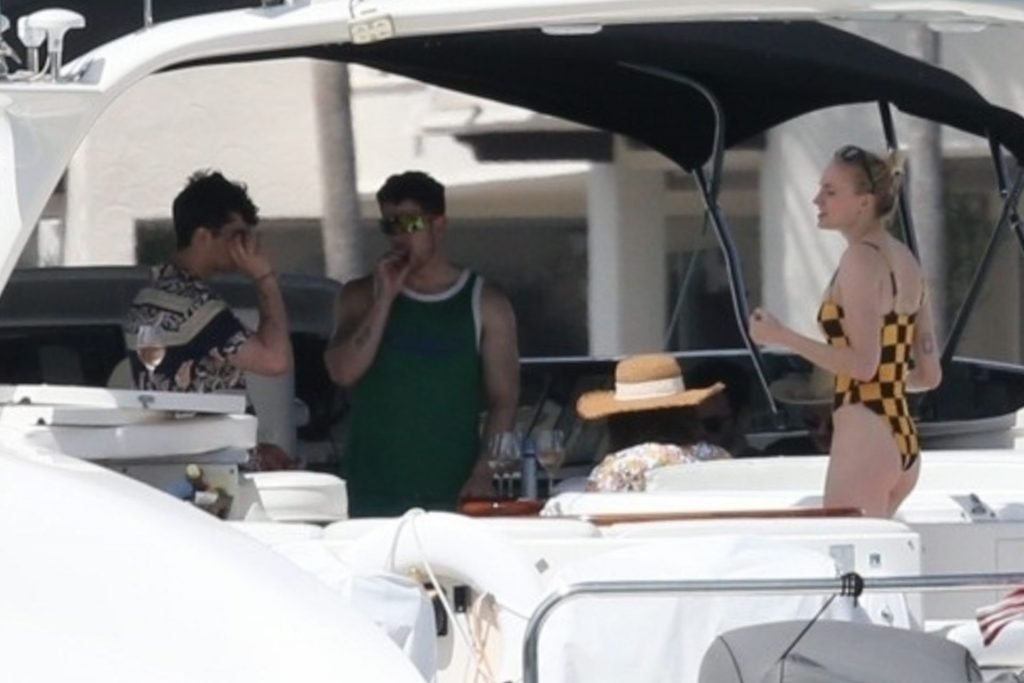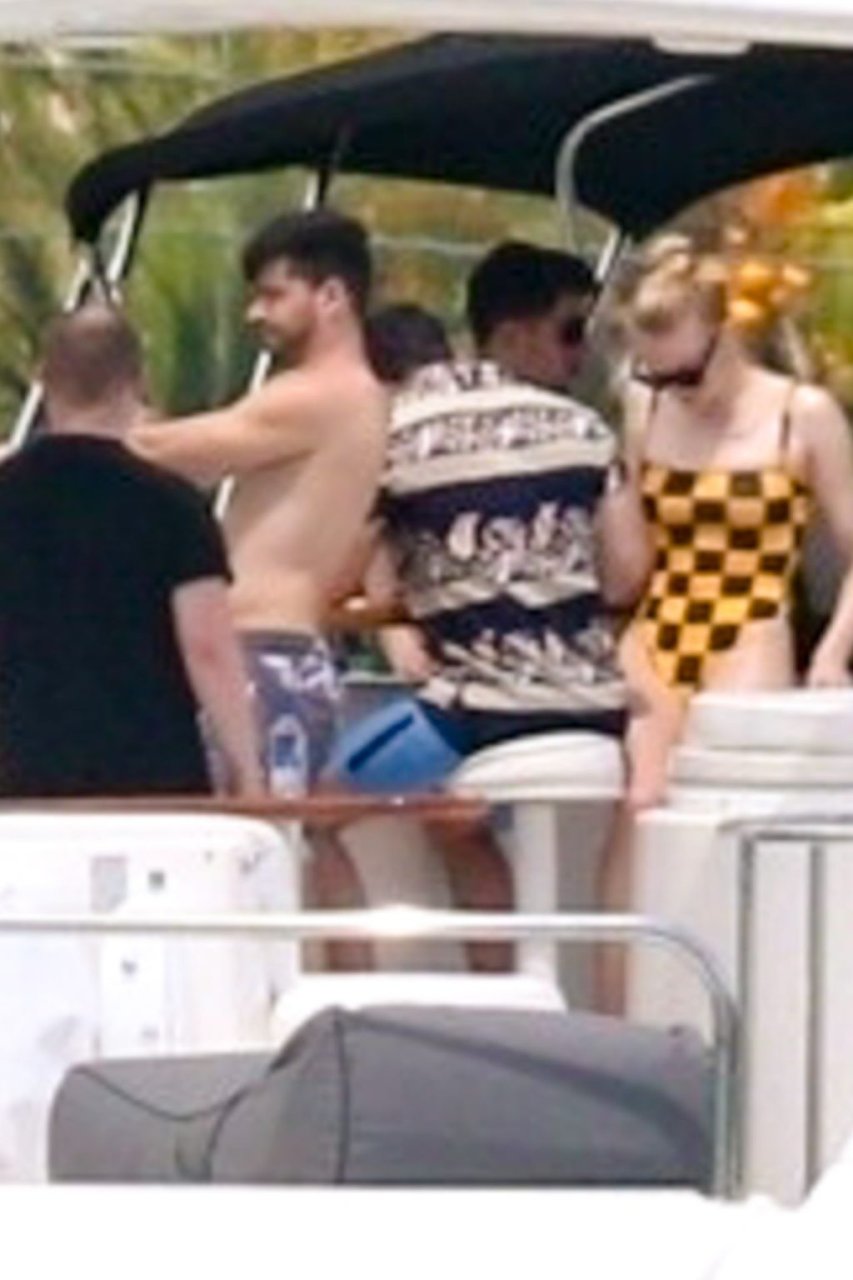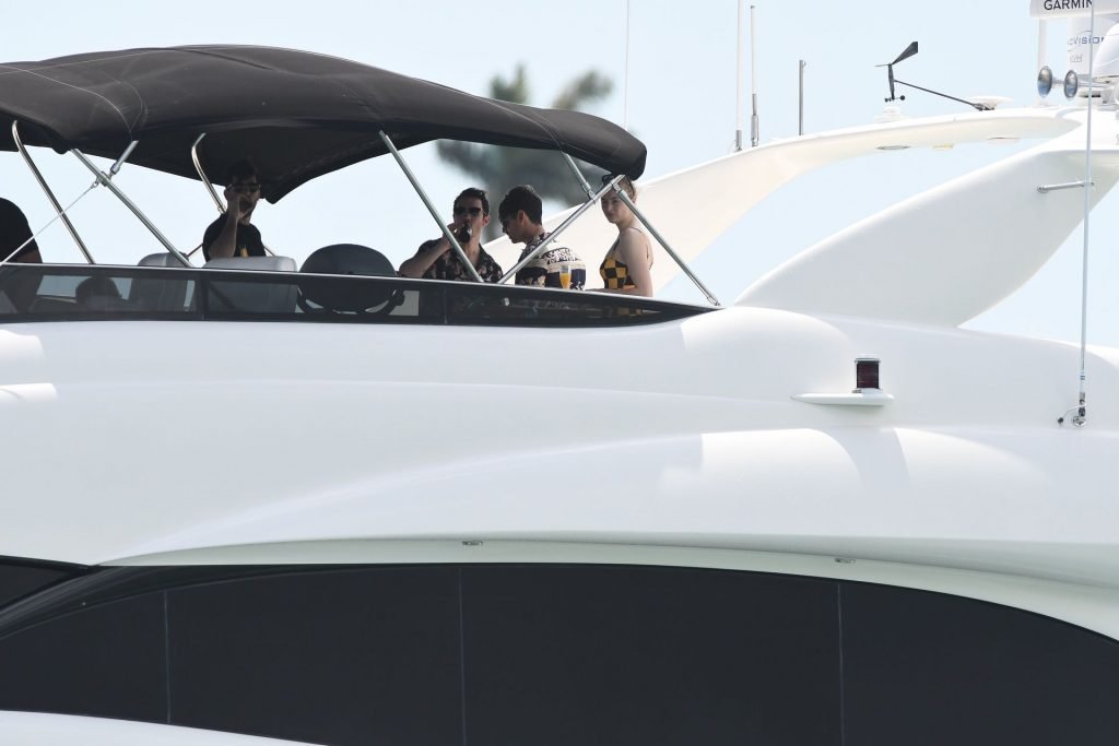 La star di “Game of Thrones” Sophie Turner indossa un costume da bagno a quadri mentre si diverte con i Jonas Brothers e Priyanka Chopra a Miami, 25/03/2019.