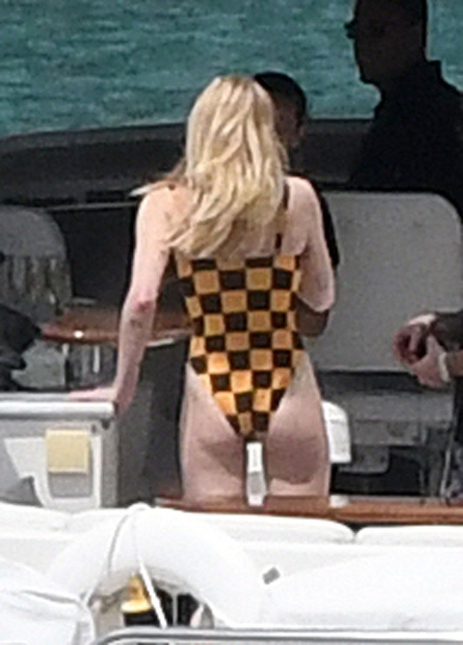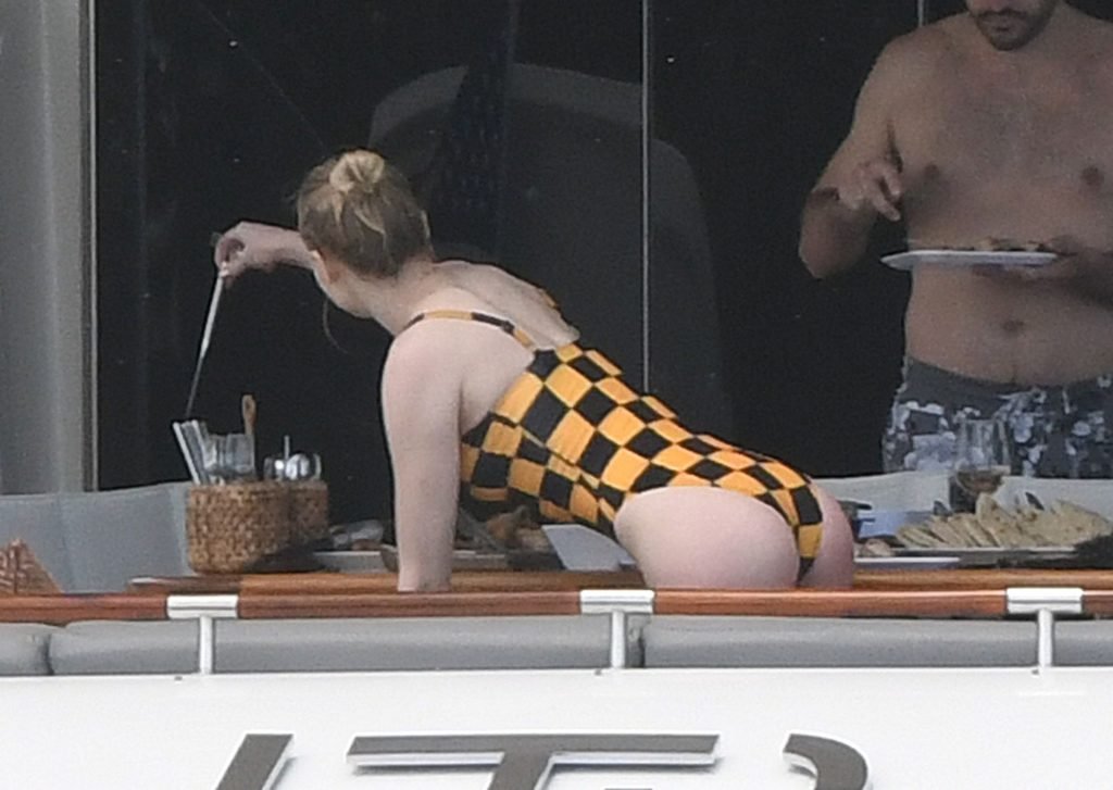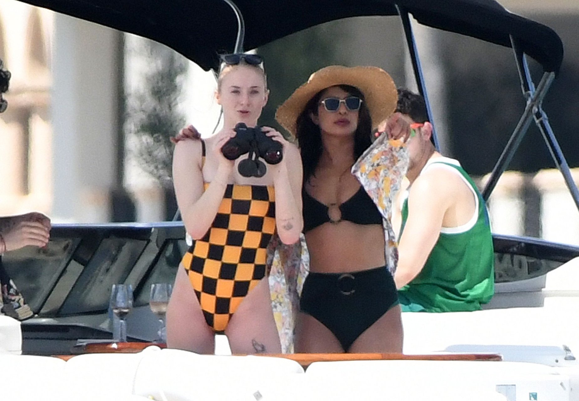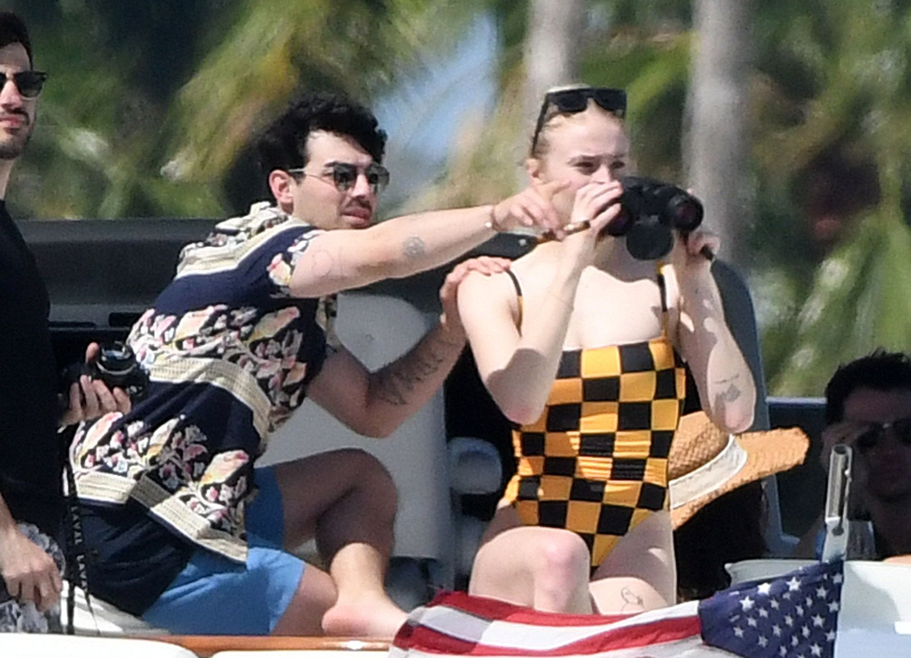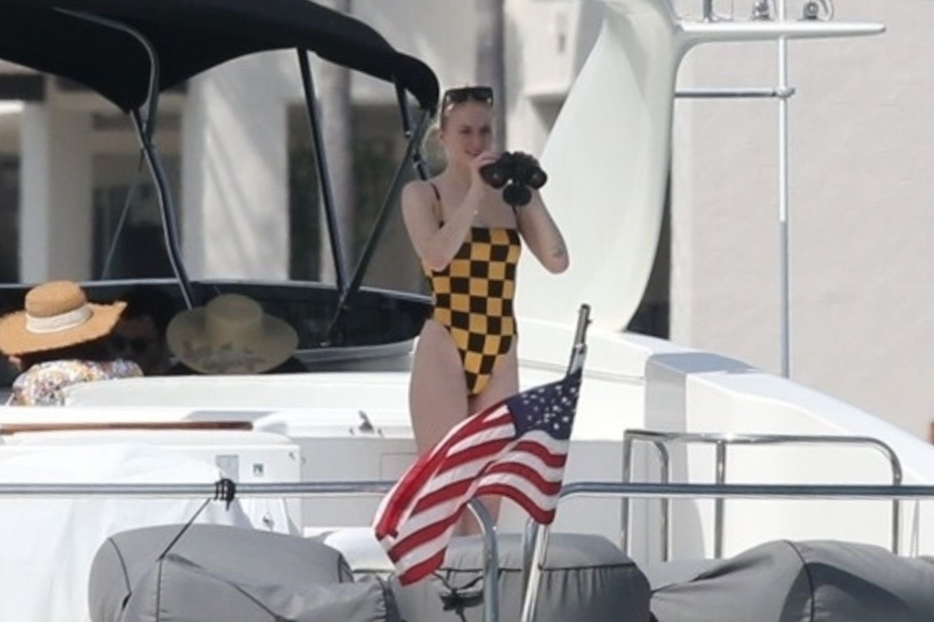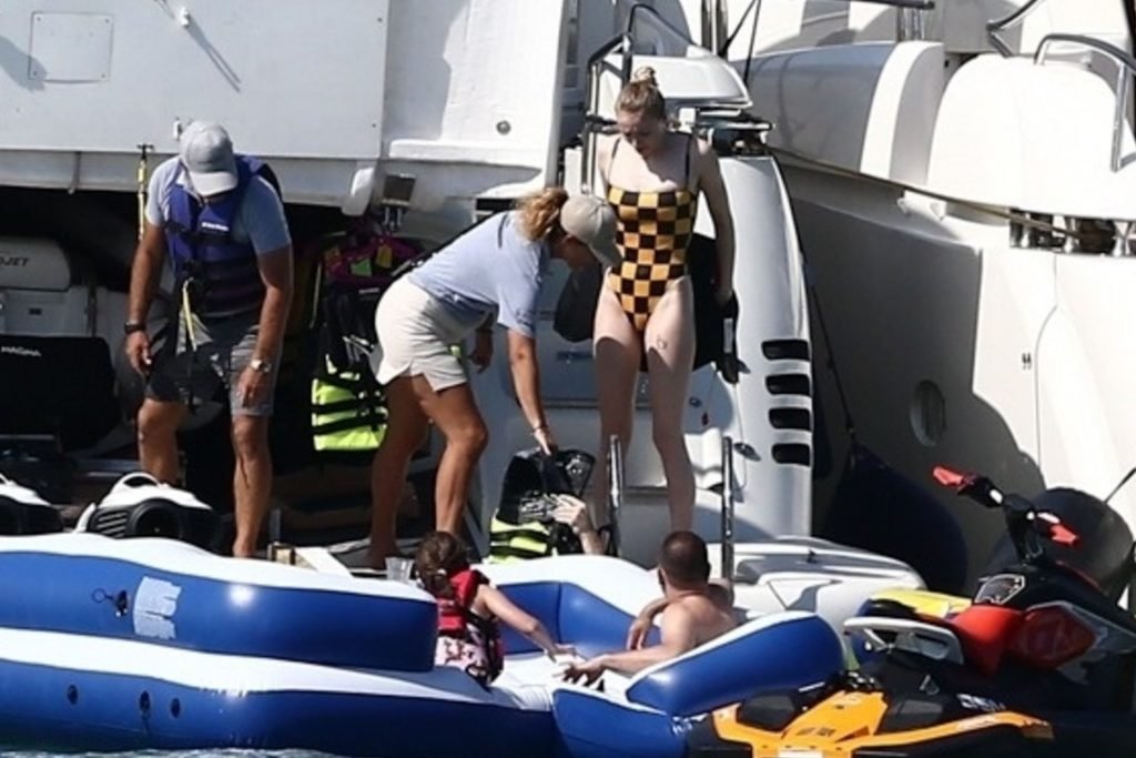 La star di “Game of Thrones” Sophie Turner indossa un costume da bagno a quadri mentre si diverte con i Jonas Brothers e Priyanka Chopra a Miami, 25/03/2019.