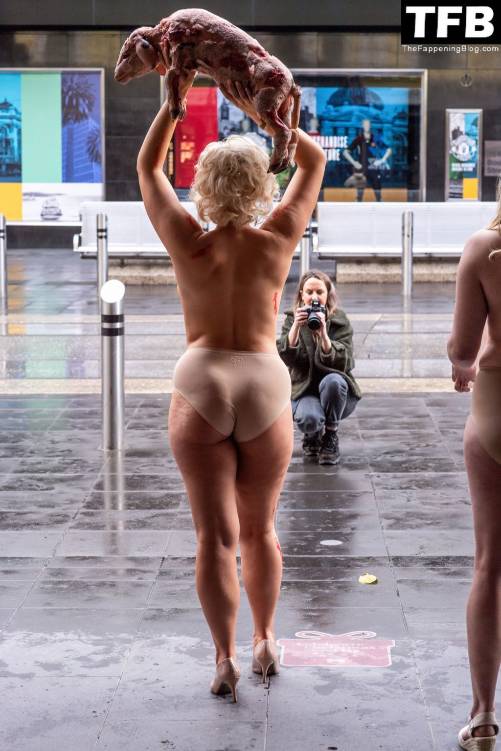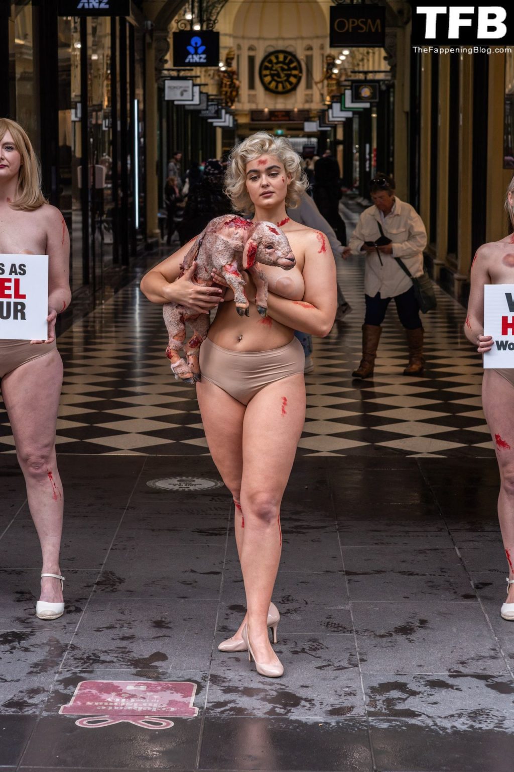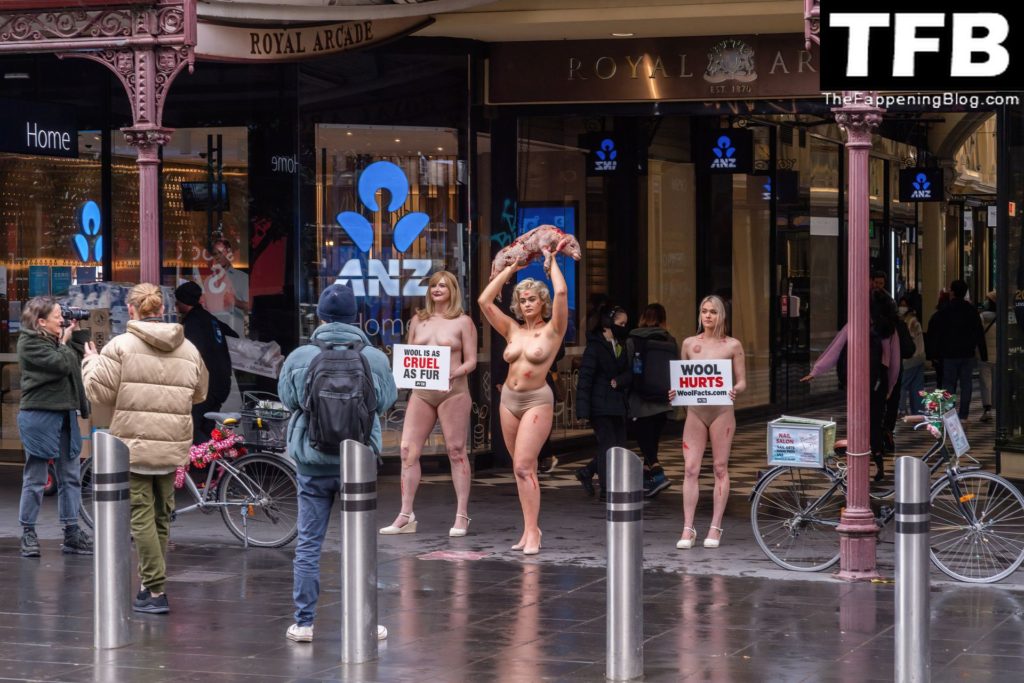 La modella influencer Stefania Ferrario organizza una protesta semi-nuda sul trattamento delle pecore da parte dell’industria della lana fuori dal Royal Arcade nel mezzo del Bourke Street Mall a Melbourne come parte di un gruppo di PETA.