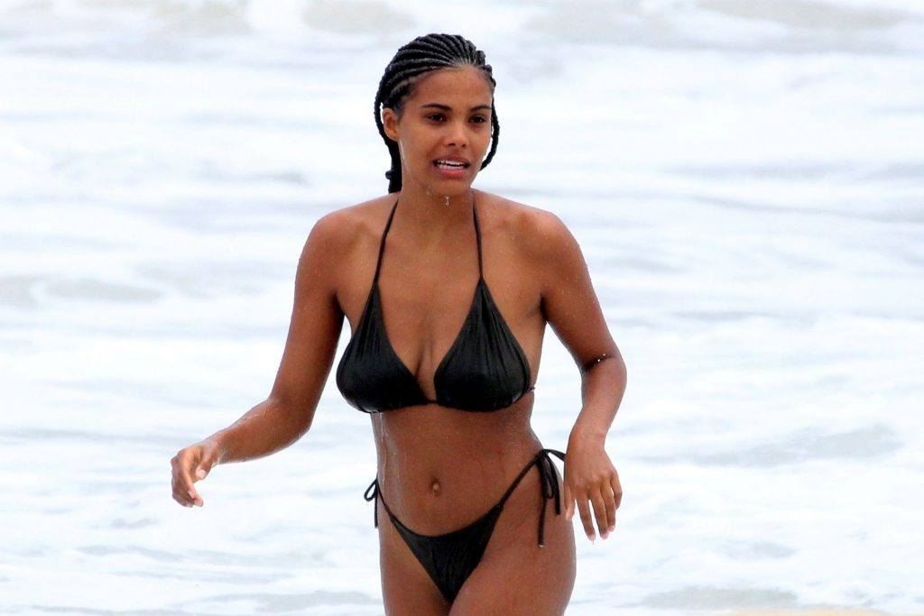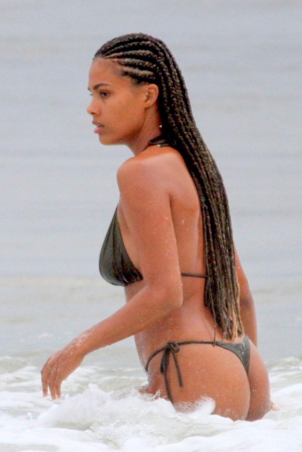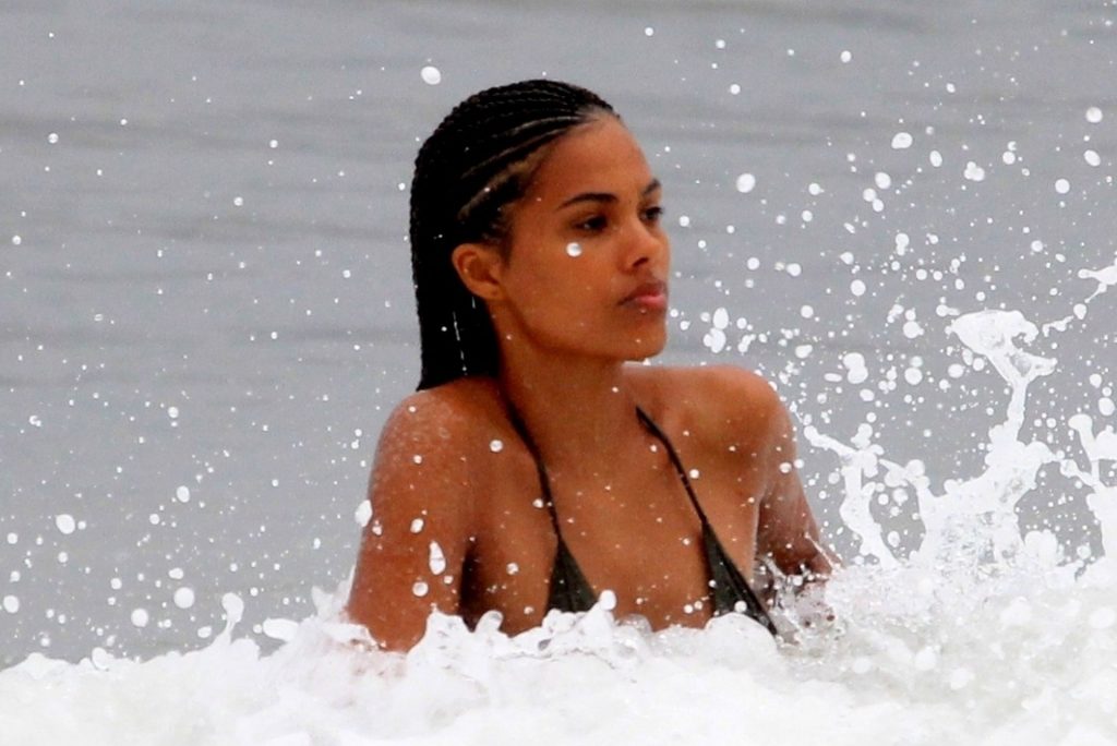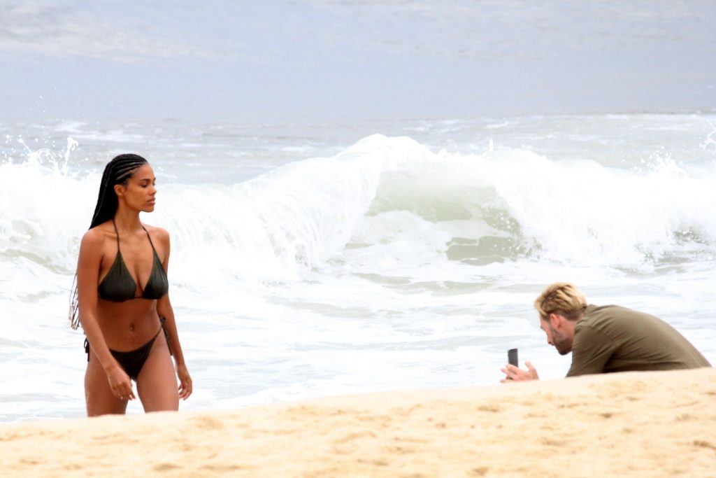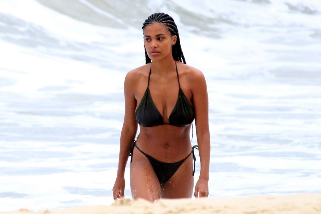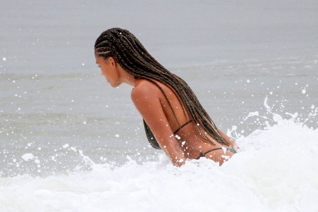 La moglie di Vincent Cassel, Tina Kunakey, è accompagnata da un’amica per una giornata in spiaggia a Rio de Janeiro, 21/02/2020. La modella, indossando un bikini nero, si è tuffata mostrando le sue nuove trecce.