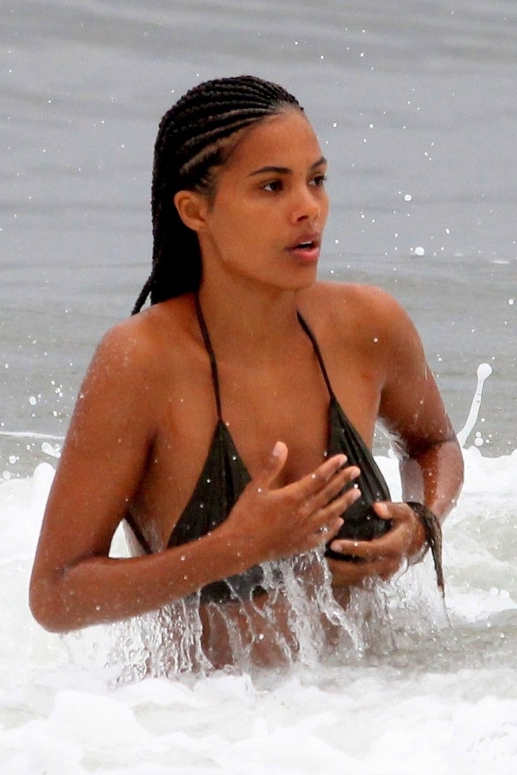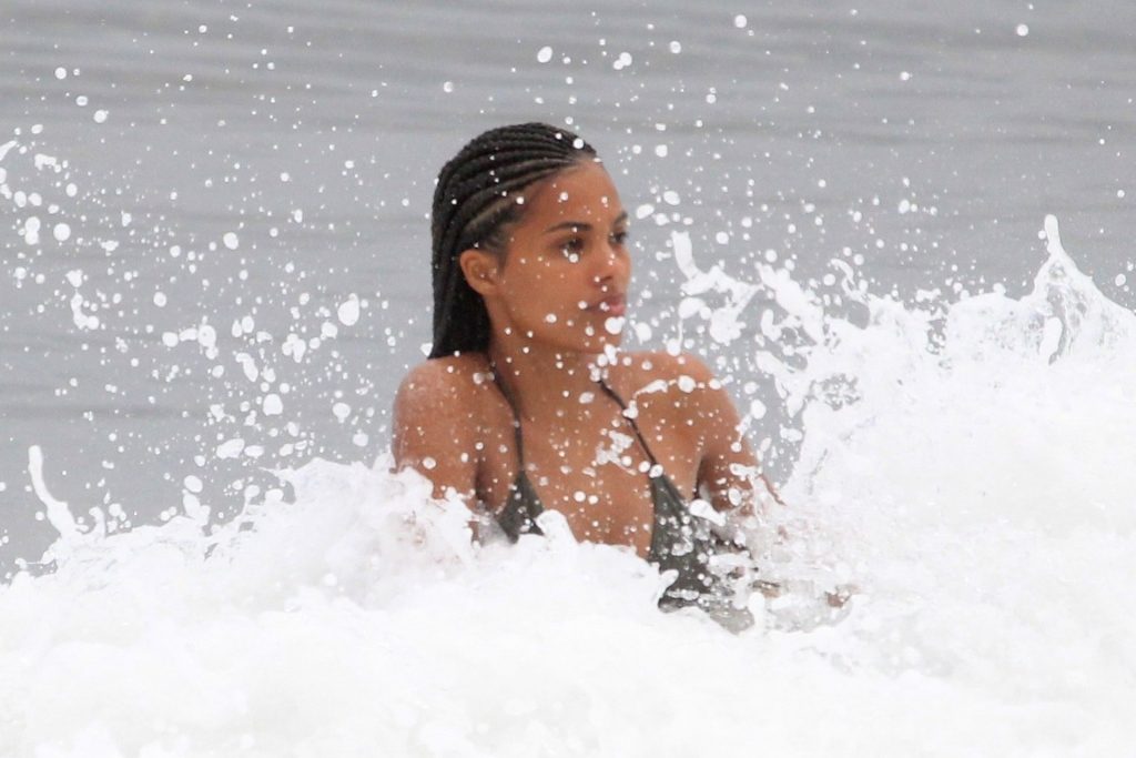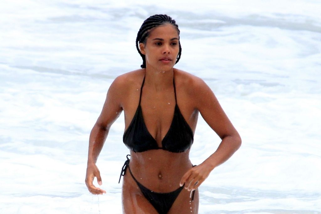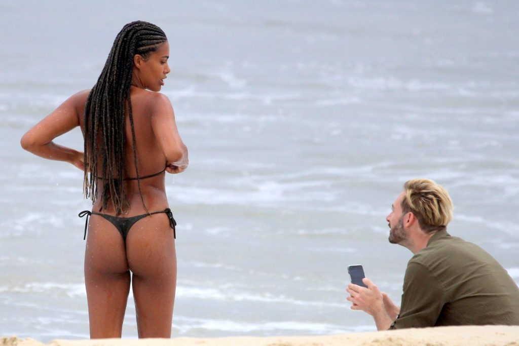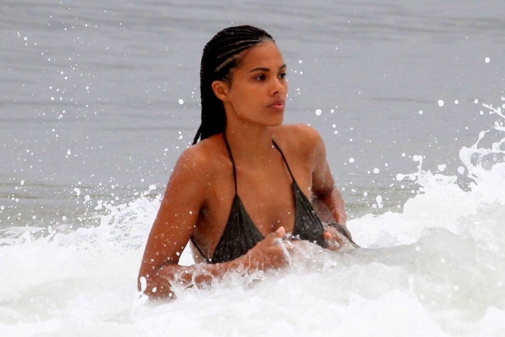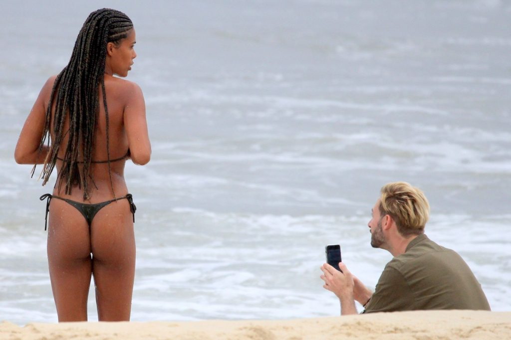 La moglie di Vincent Cassel, Tina Kunakey, è accompagnata da un’amica per una giornata in spiaggia a Rio de Janeiro, 21/02/2020. La modella, indossando un bikini nero, si è tuffata mostrando le sue nuove trecce.