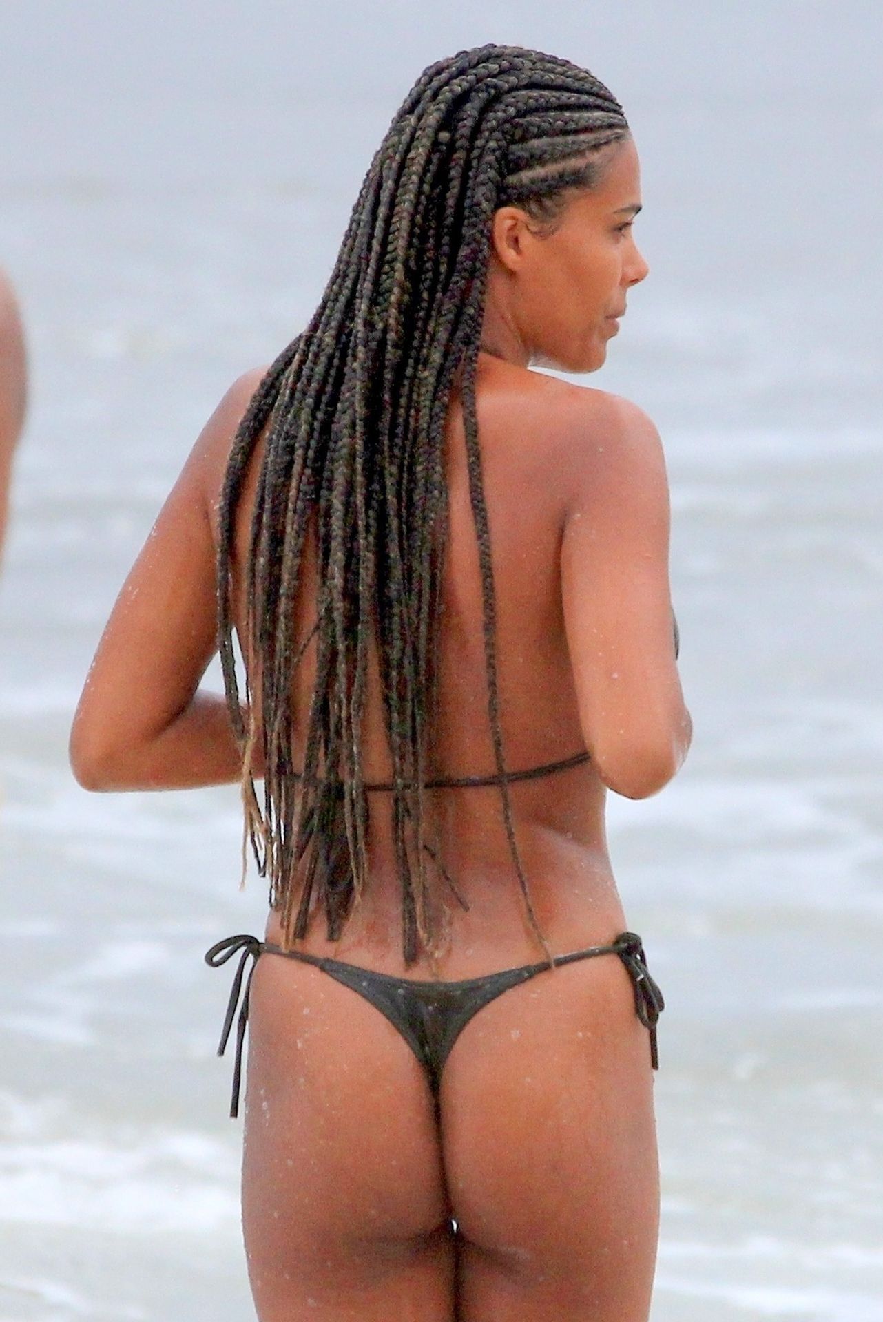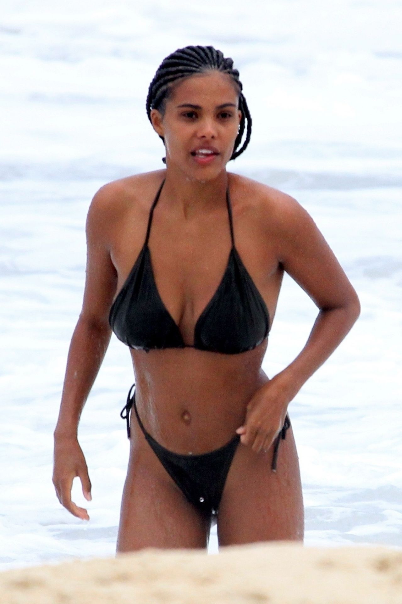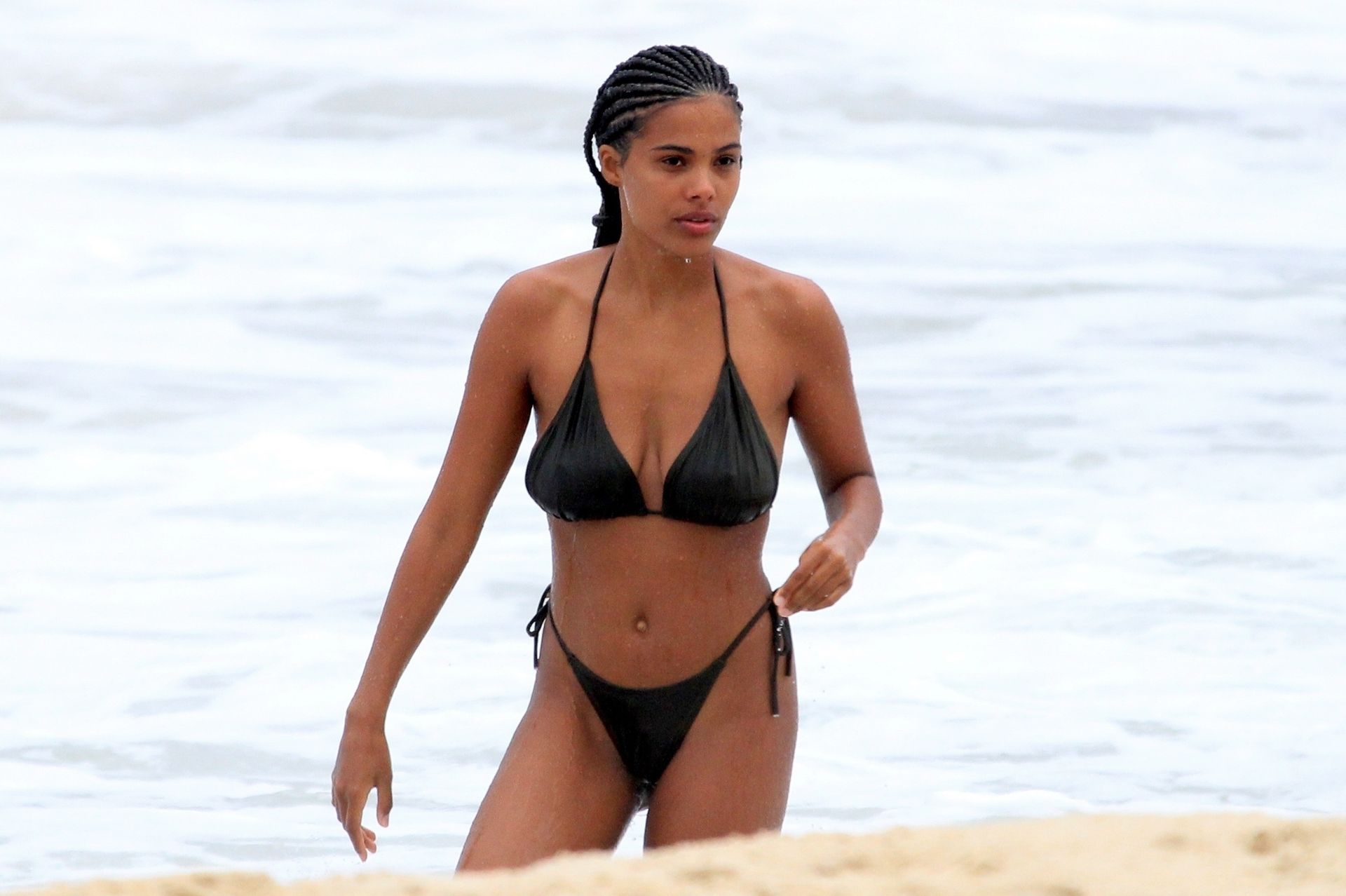 La moglie di Vincent Cassel, Tina Kunakey, è accompagnata da un’amica per una giornata in spiaggia a Rio de Janeiro, 21/02/2020. La modella, indossando un bikini nero, si è tuffata mostrando le sue nuove trecce.