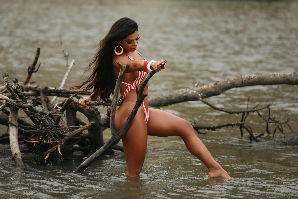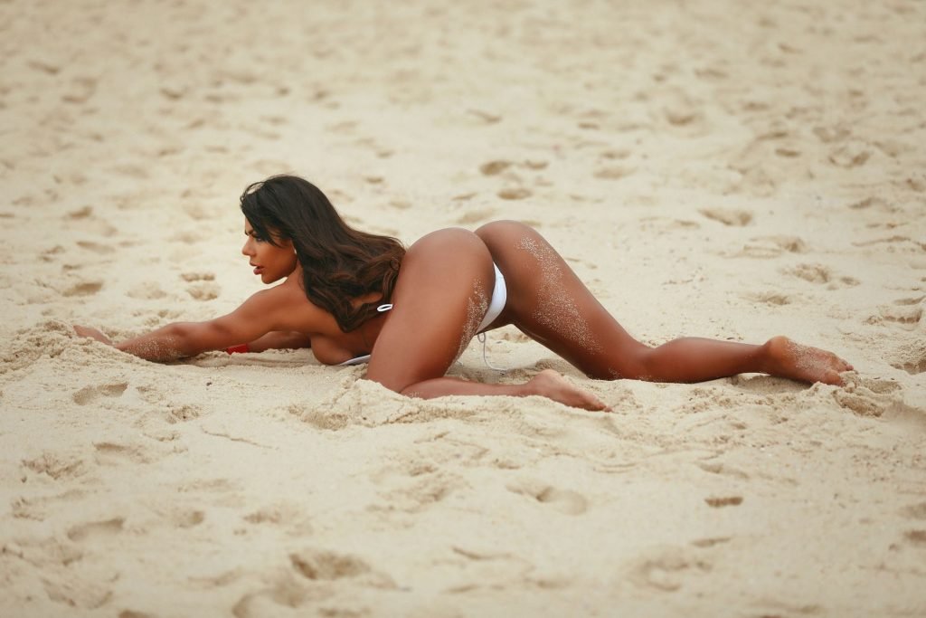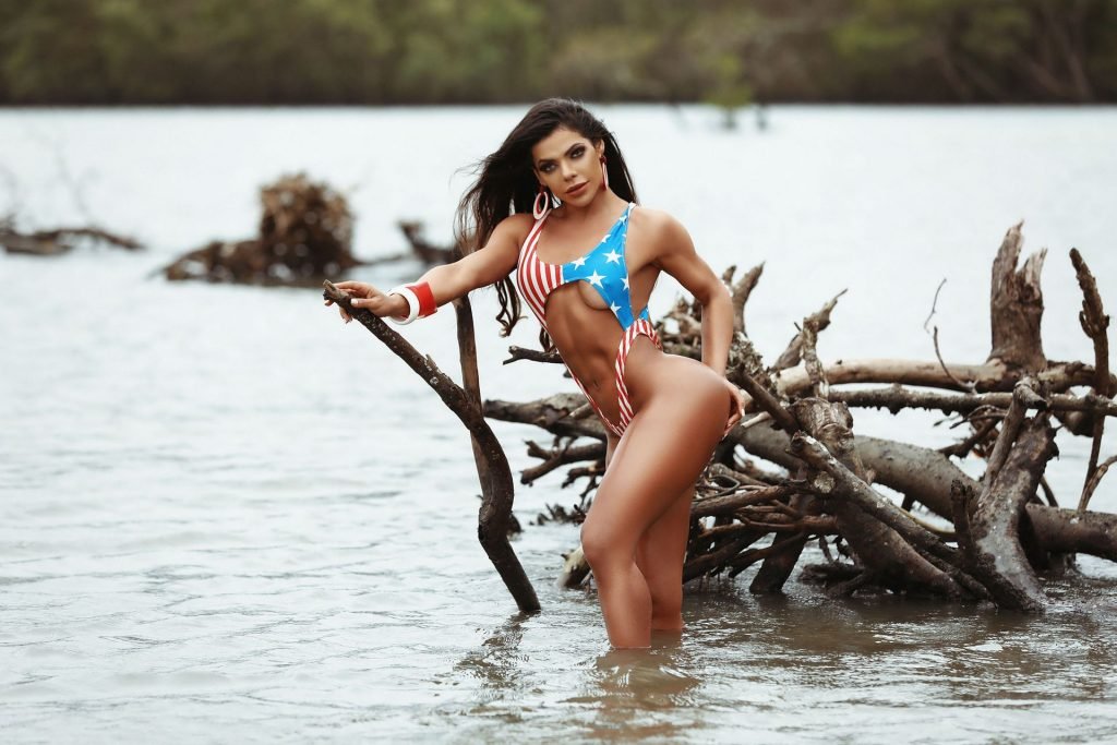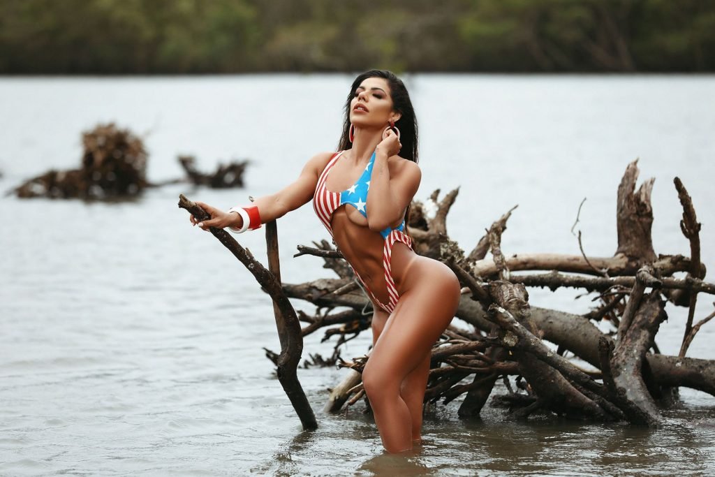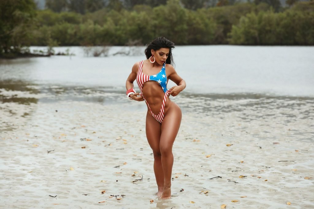 La neo incoronata Miss BumBum World Suzy Cortez mostra il suo amore per gli USA in questo infuocato servizio fotografico in spiaggia (2019).