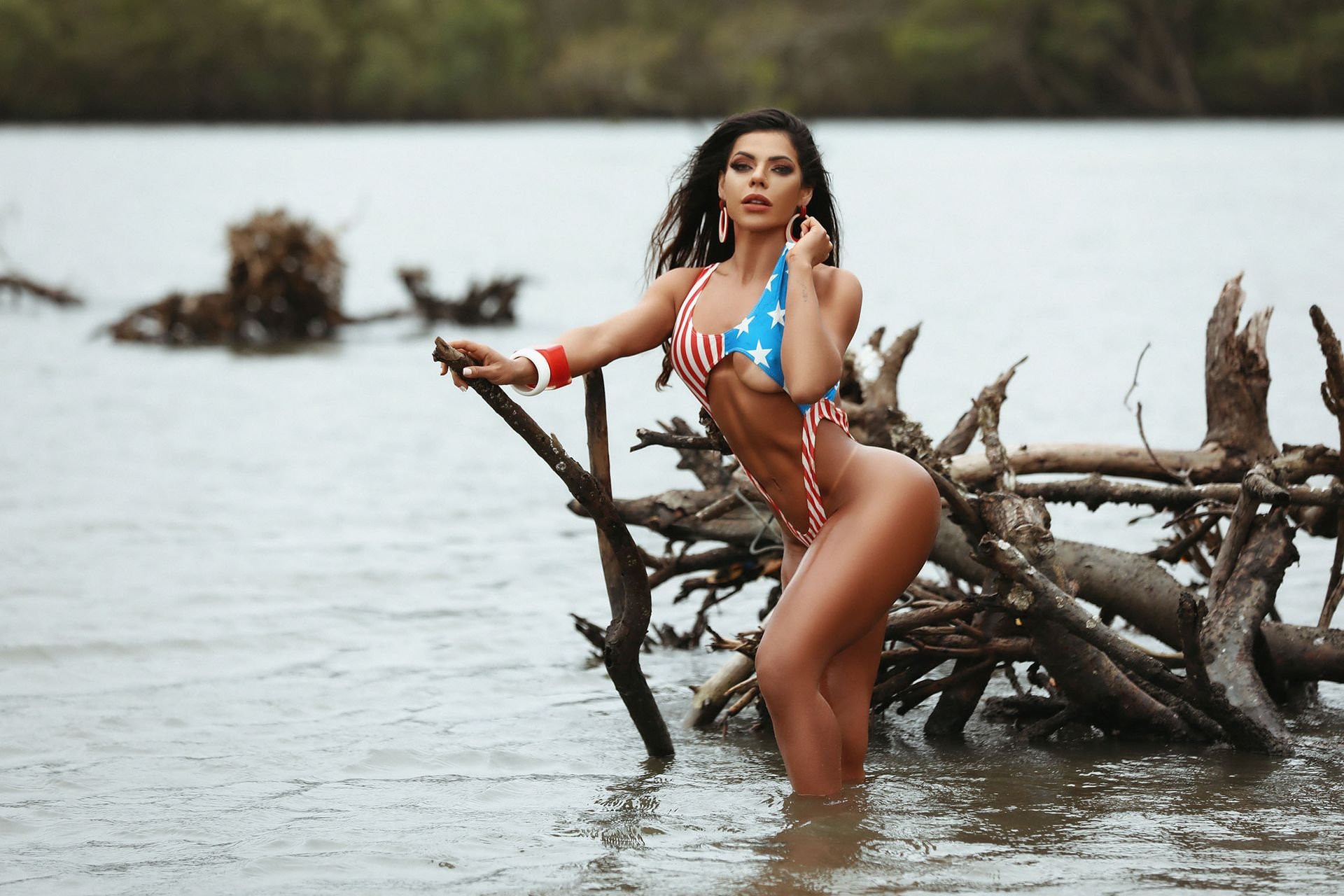 La neo incoronata Miss BumBum World Suzy Cortez mostra il suo amore per gli USA in questo infuocato servizio fotografico in spiaggia (2019).