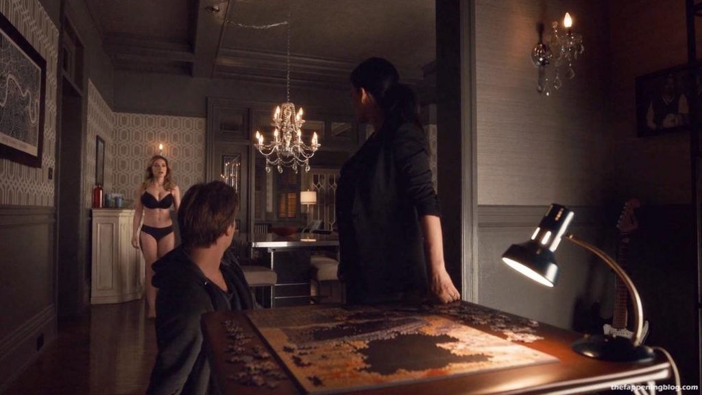 Sydney Meyer is walking into a room in her bra and panties, showing cleavage as she then realizes she is interrupting and backs out of the room.