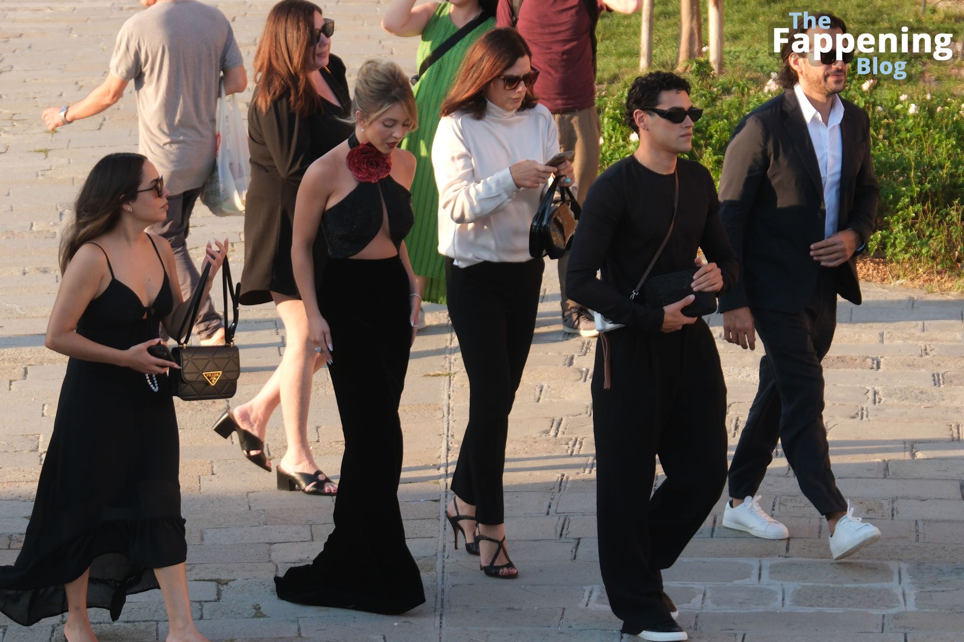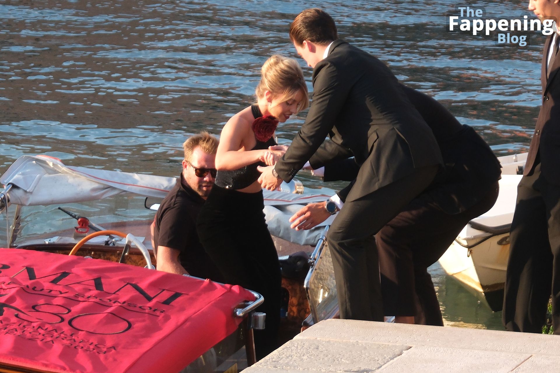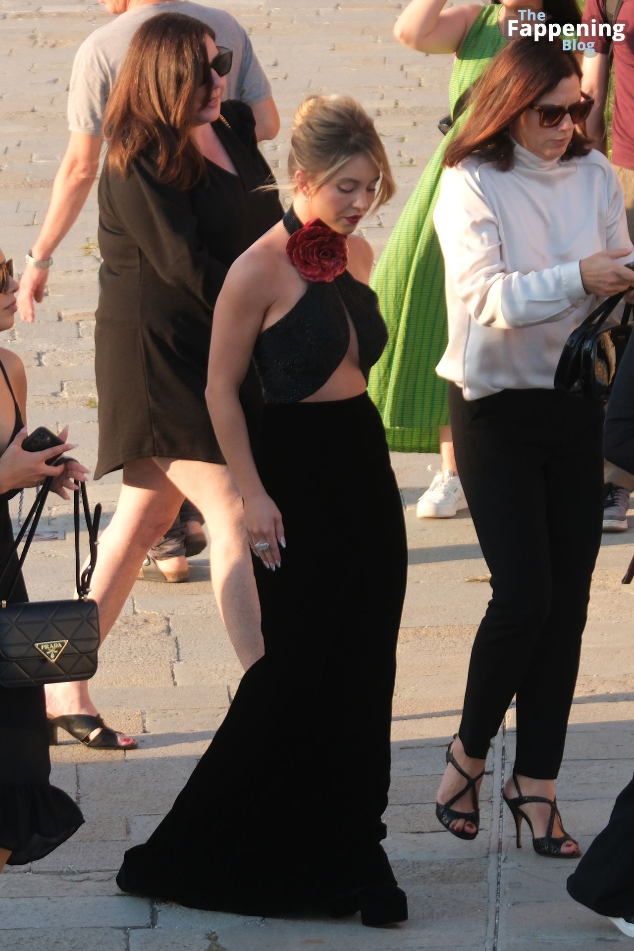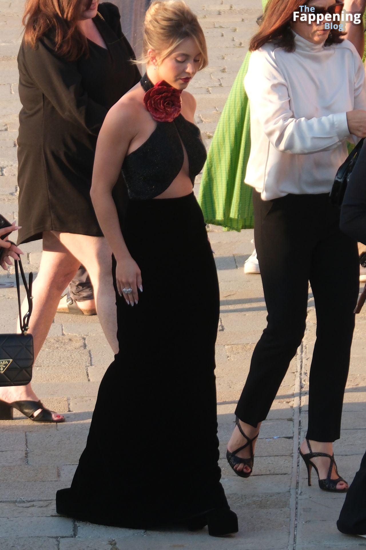 L’ingresso di Sydney a Venezia è semplicemente indimenticabile! Preparati a immergerti nel fascino sensuale del suo look con abito nero.