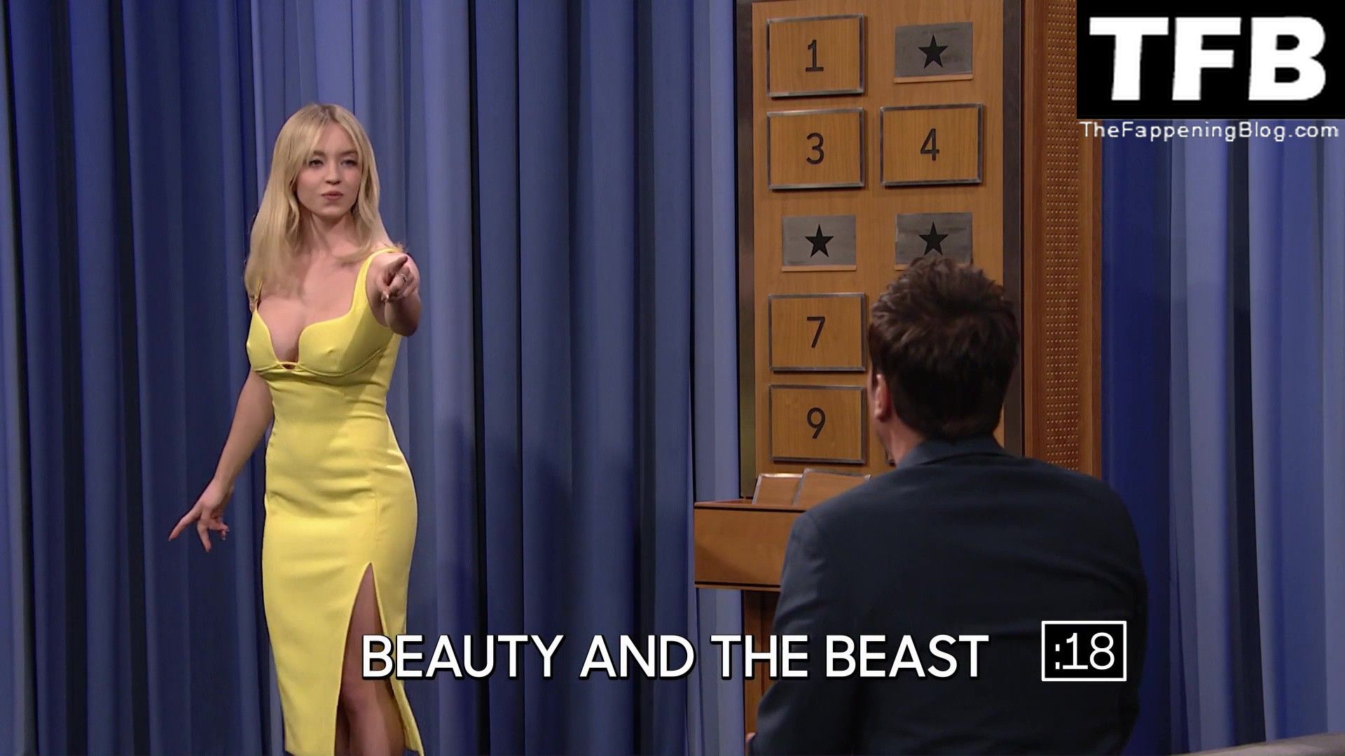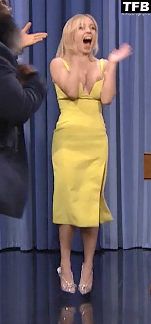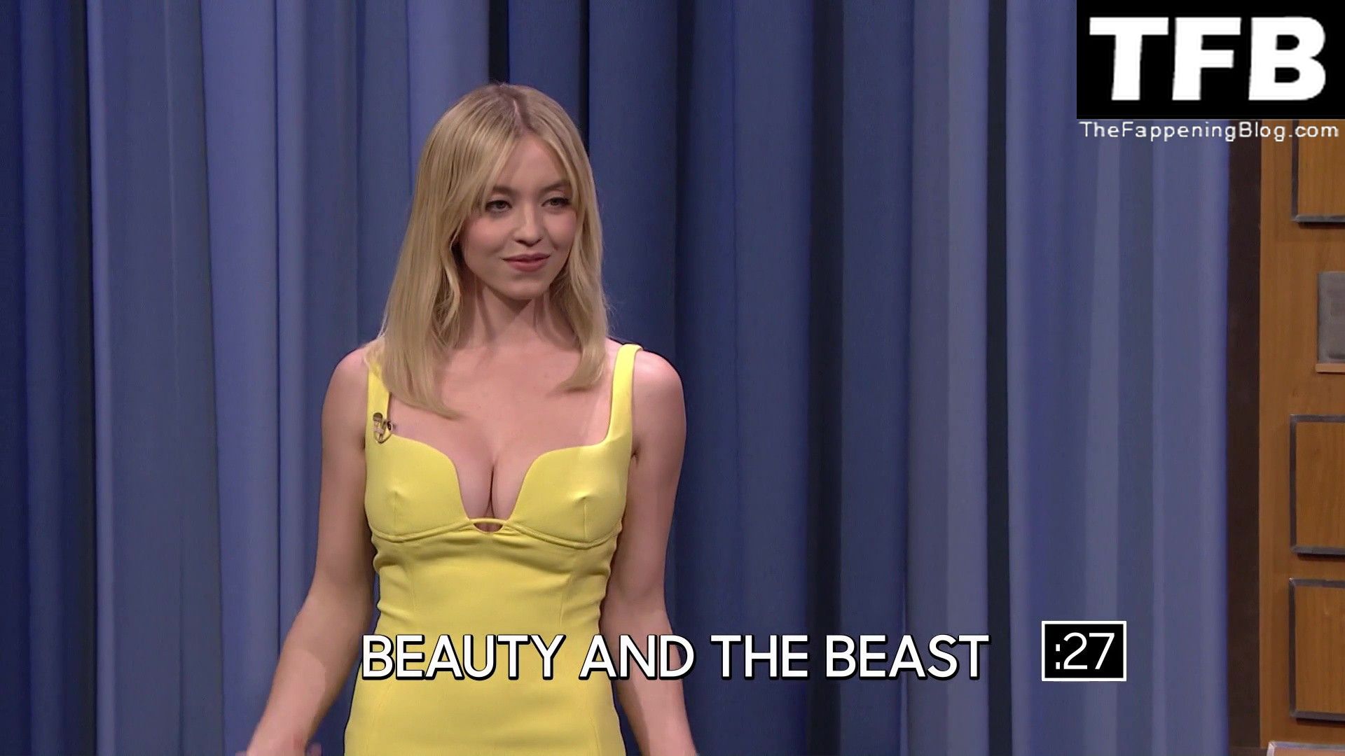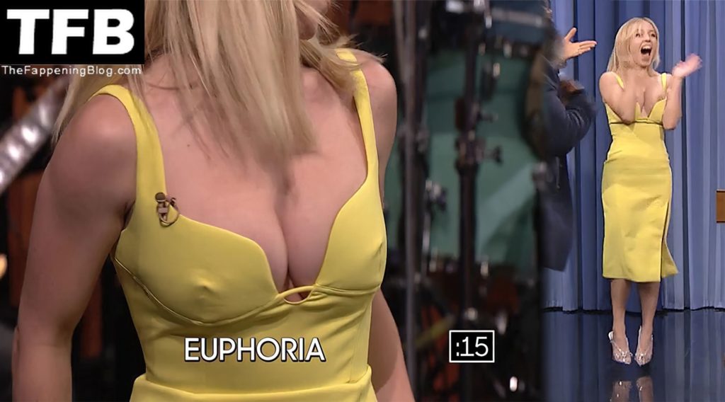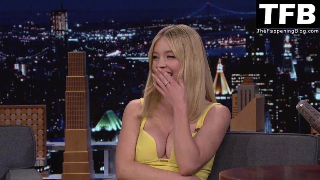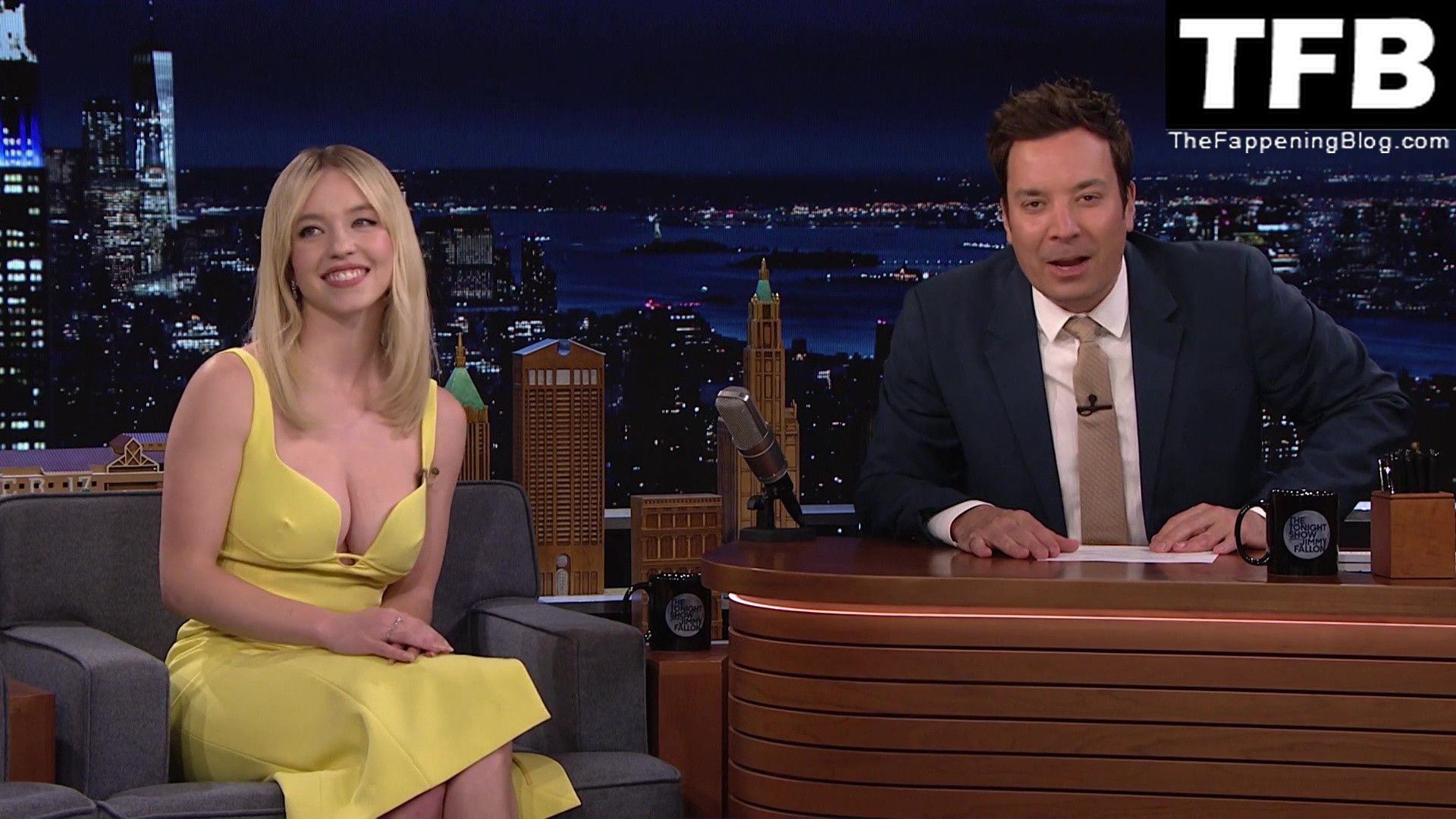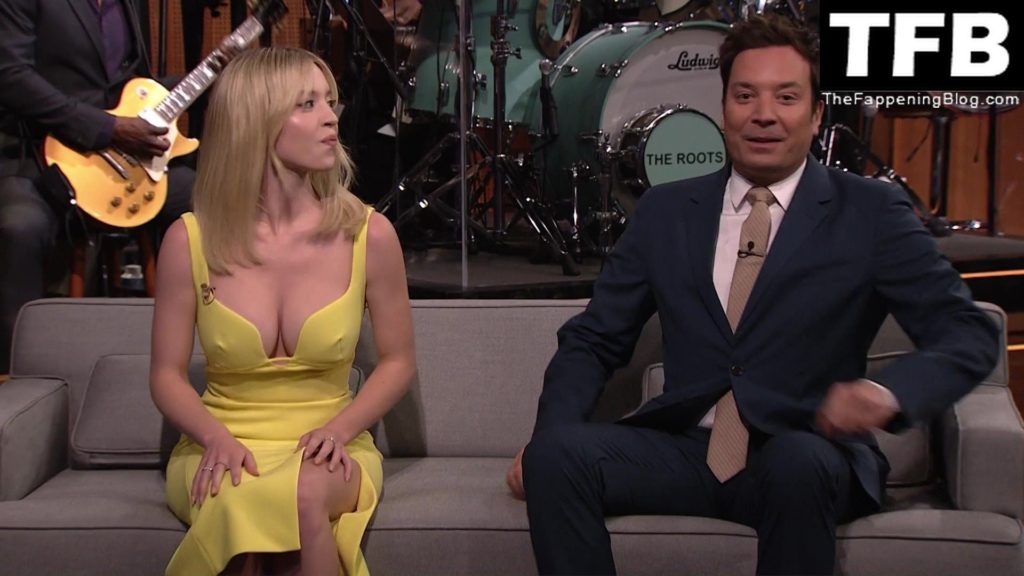 Sydney Sweeney mostra il suo sexy décolleté e lascia intravedere il capezzolo nello show “The Tonight Show with Jimmy Fallon” (maggio 2022).
