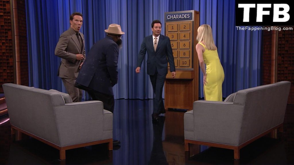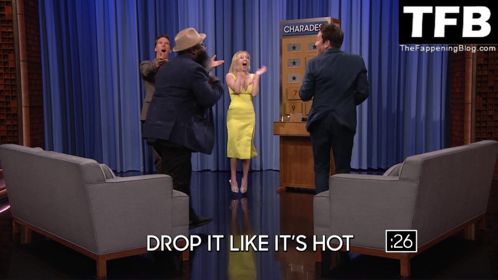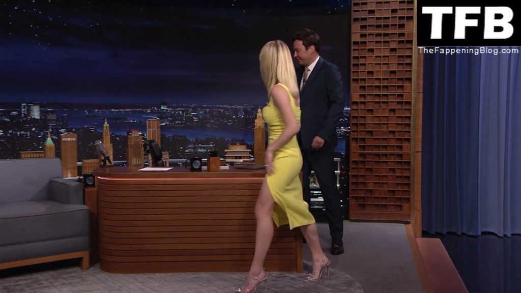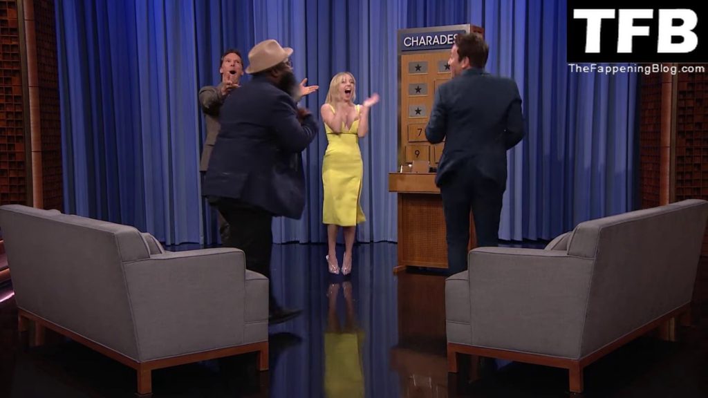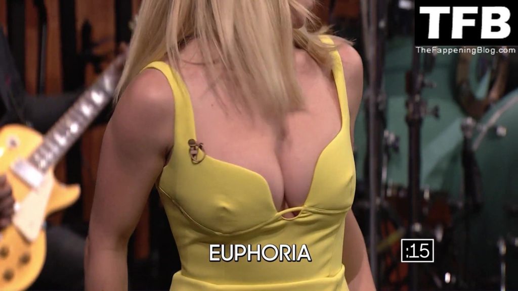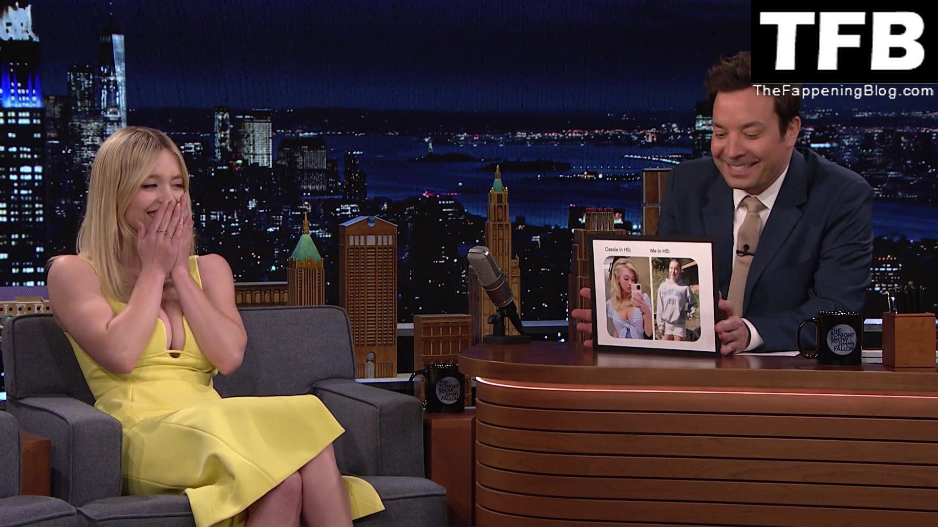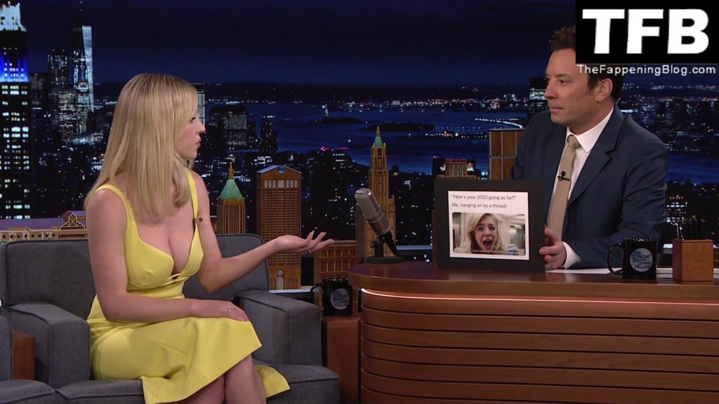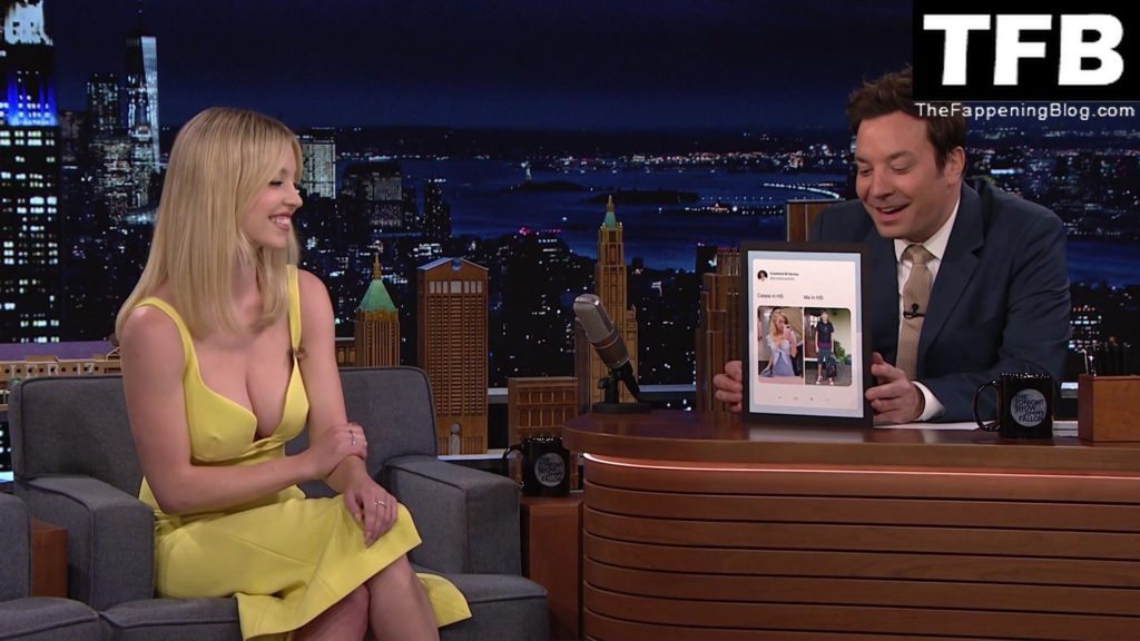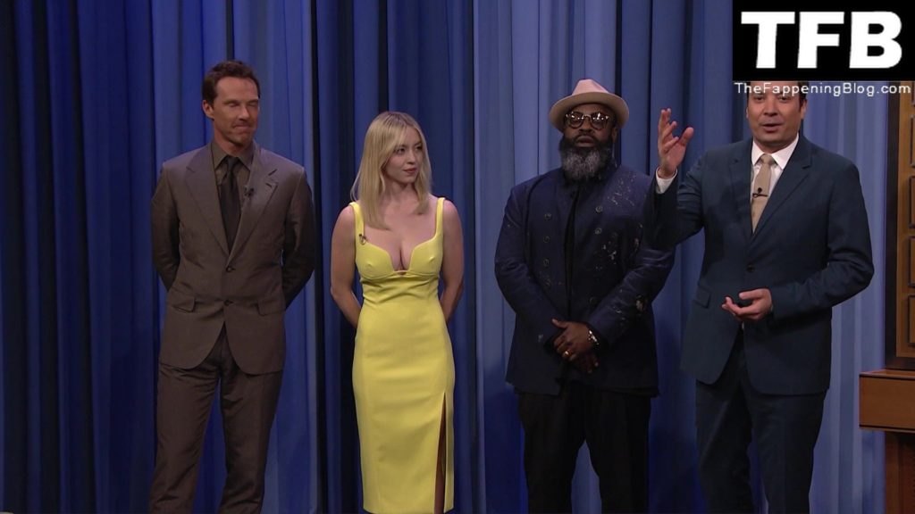Sydney Sweeney mostra il suo sexy décolleté e lascia intravedere il capezzolo nello show “The Tonight Show with Jimmy Fallon” (maggio 2022).