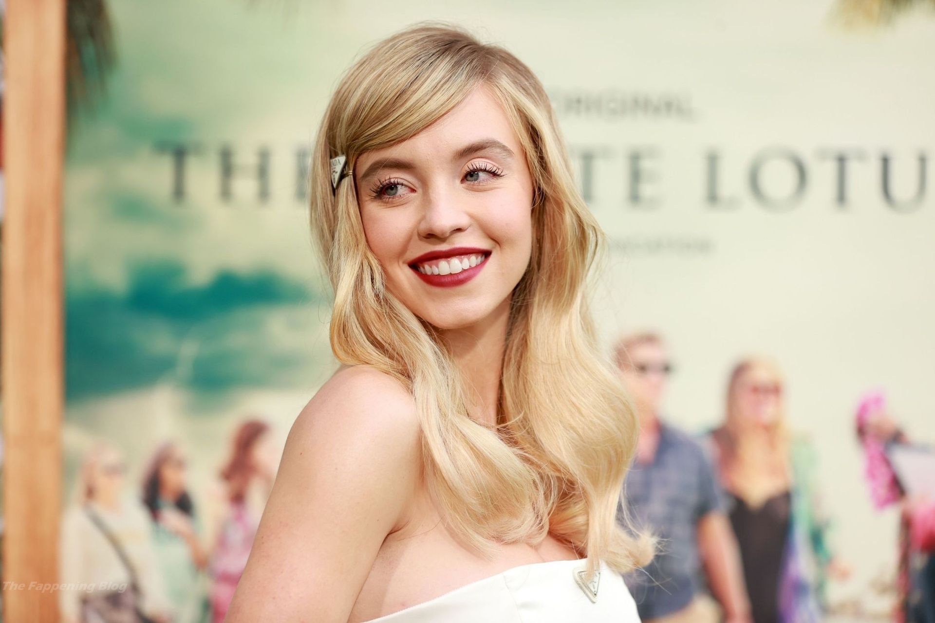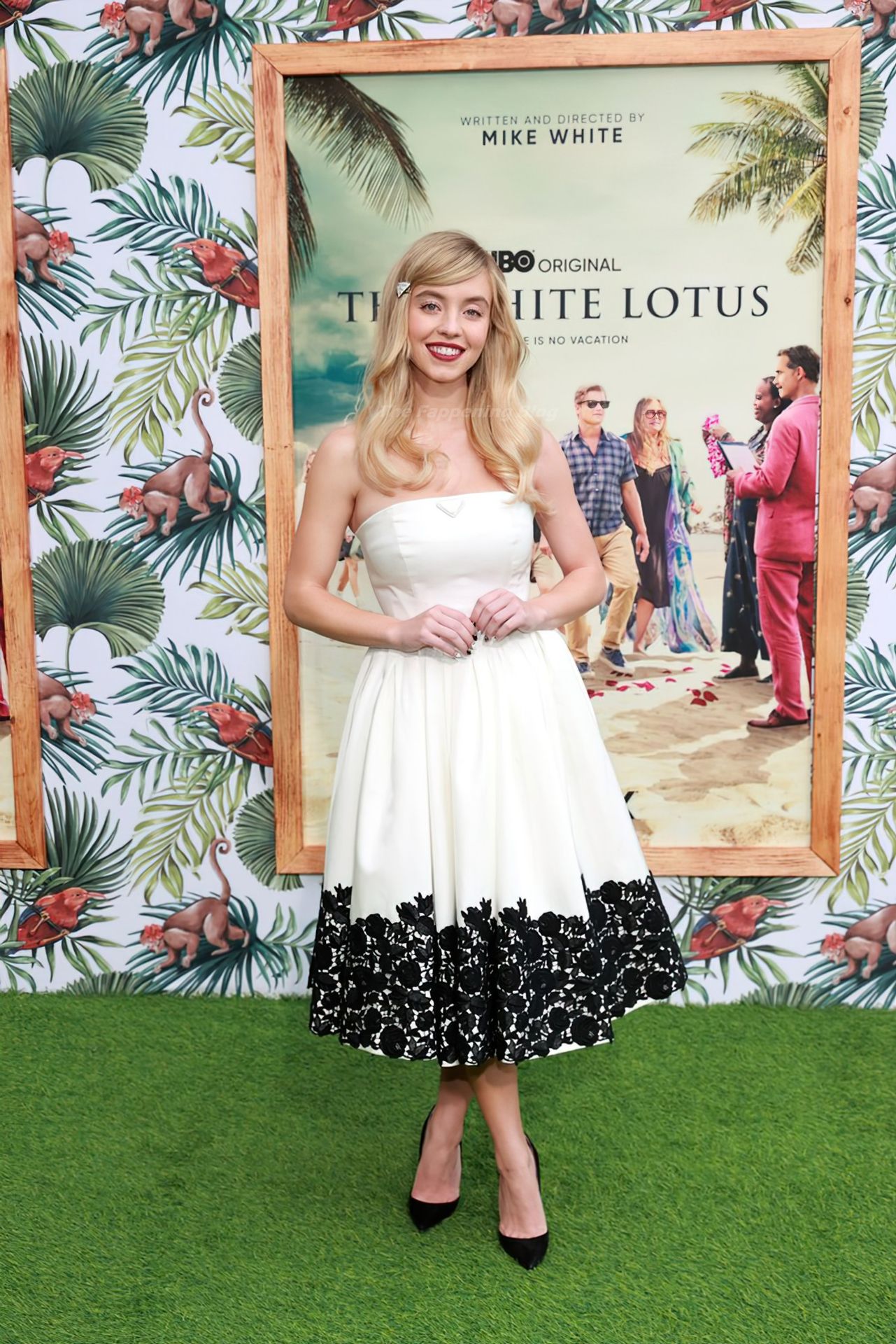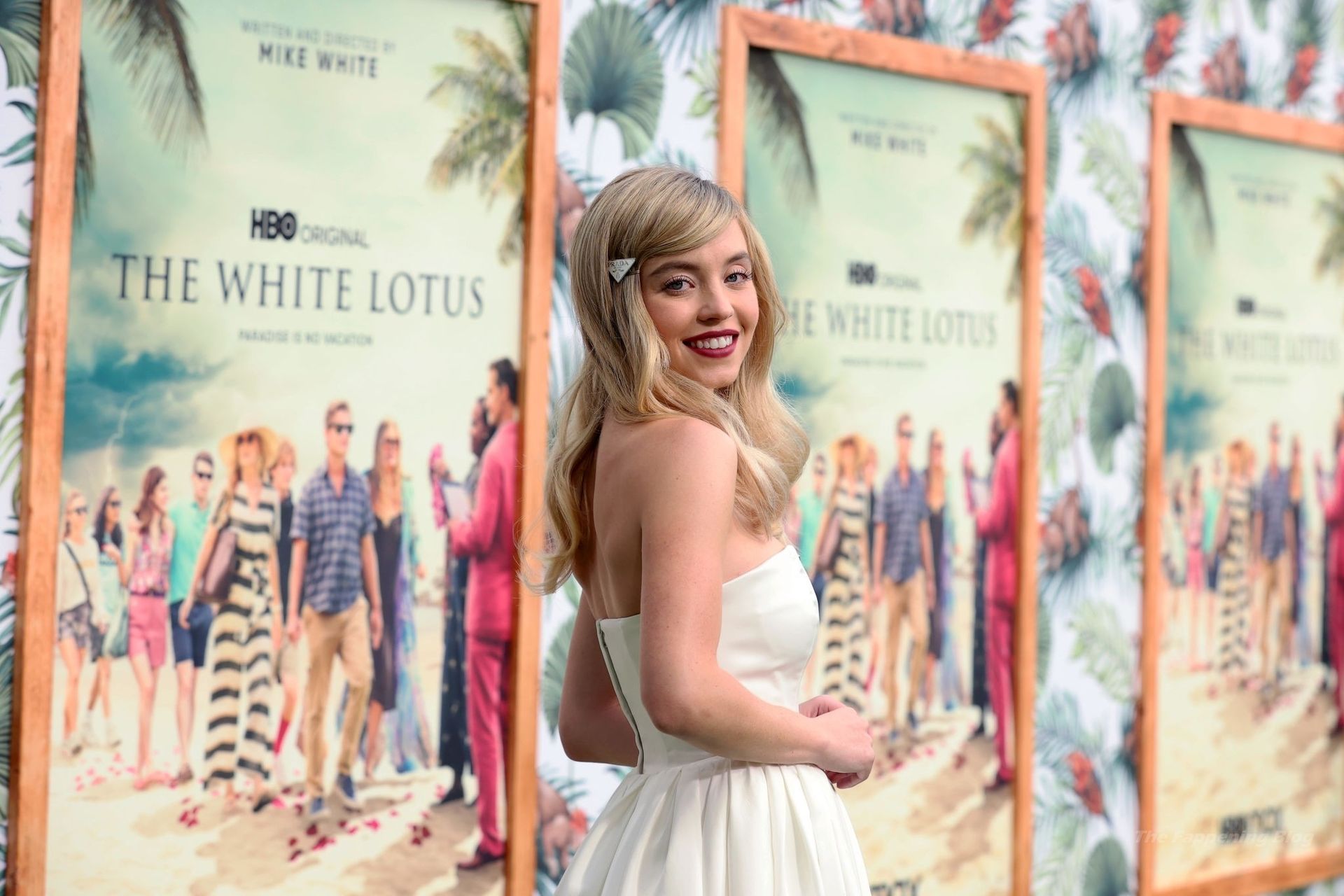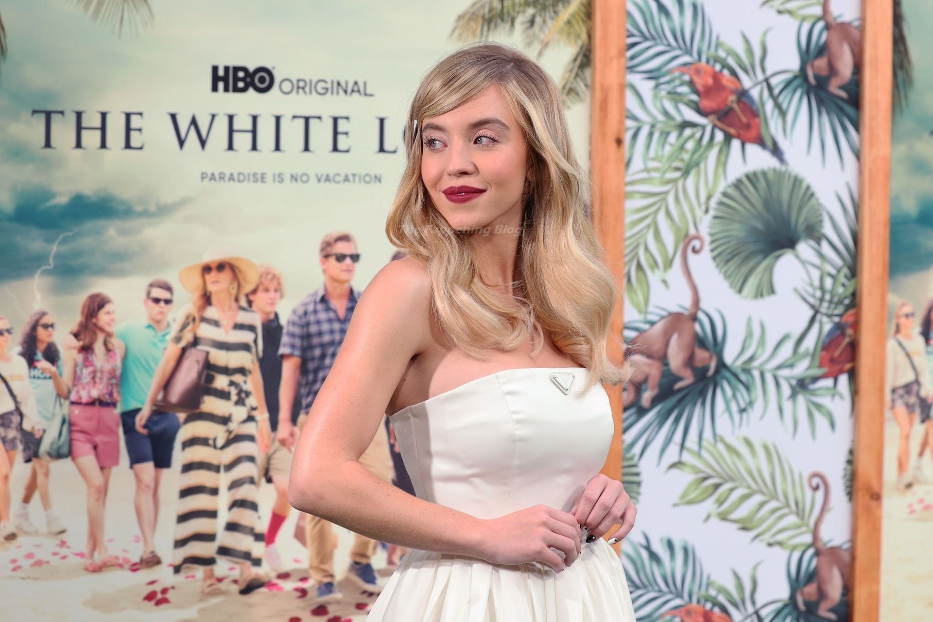 L’attrice Sydney Sweeney appare sensazionale mentre sfoggia un décolleté in un abito bianco alla prima di The White Lotus a Pacific Palisades, 07/07/2021.