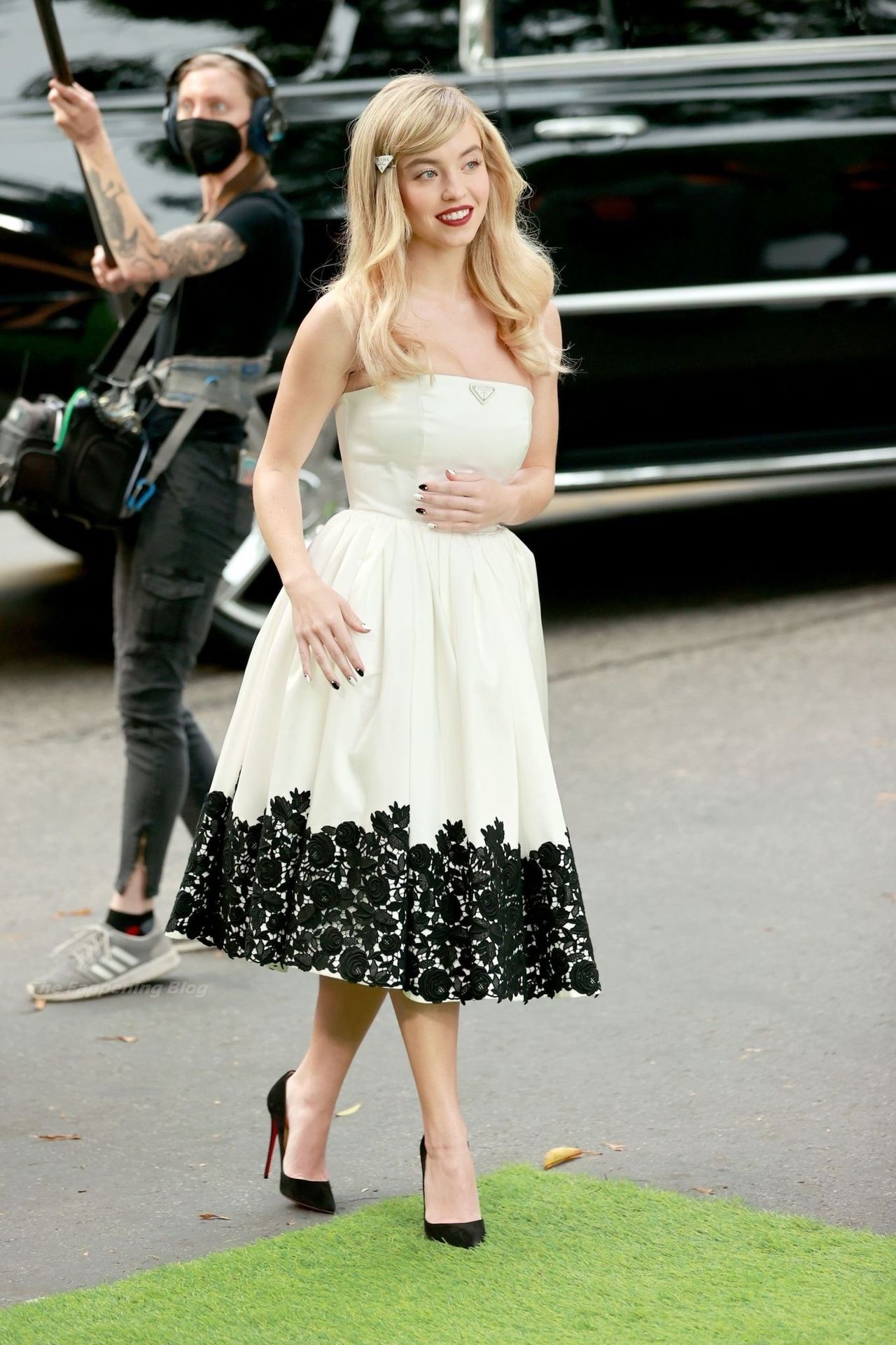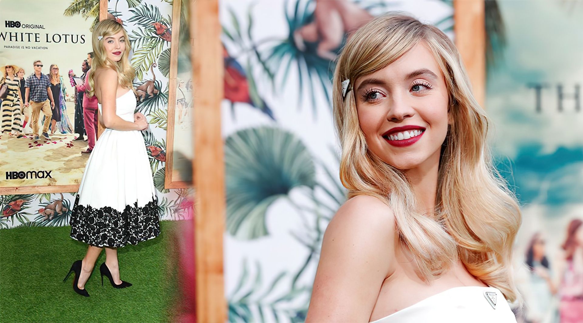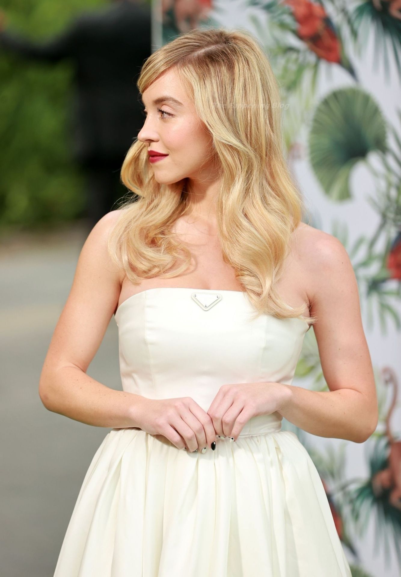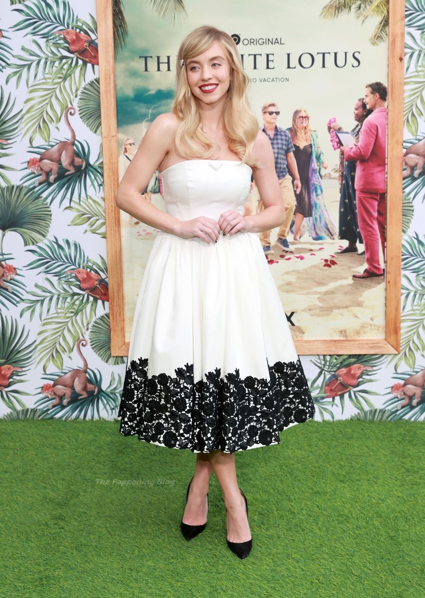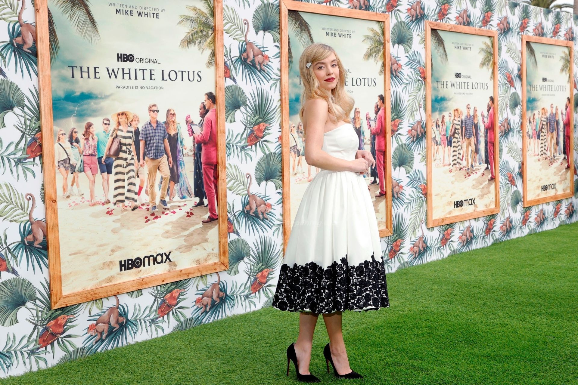 L’attrice Sydney Sweeney appare sensazionale mentre sfoggia un décolleté in un abito bianco alla prima di The White Lotus a Pacific Palisades, 07/07/2021.