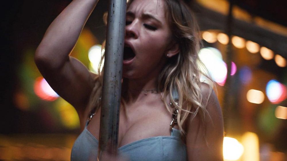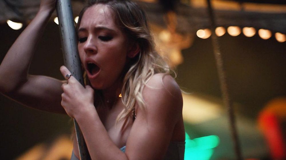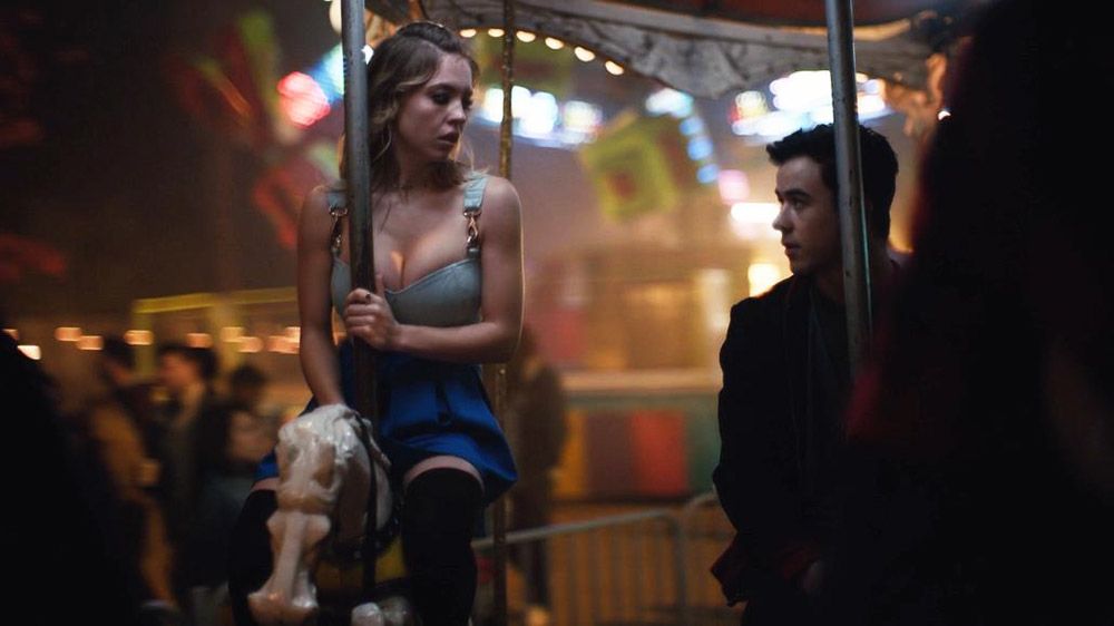 Again Sydney Sweeney is showing cleavage in a low-cut dress. She rides a carousel with a guy next to her, leaning over to kiss her. The babe then begins to grind against her carousel horse and pole. Sydney is moaning and breathing heavily as she masturbates to orgasm. Then she notices the crowd around the carousel watching her as she goes by.