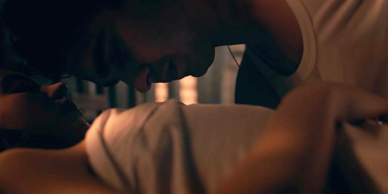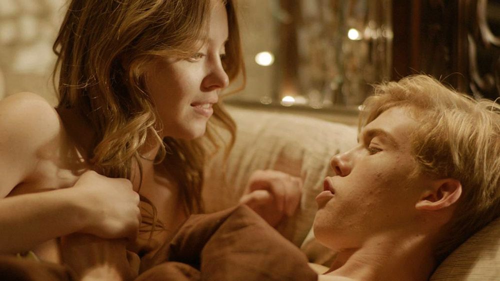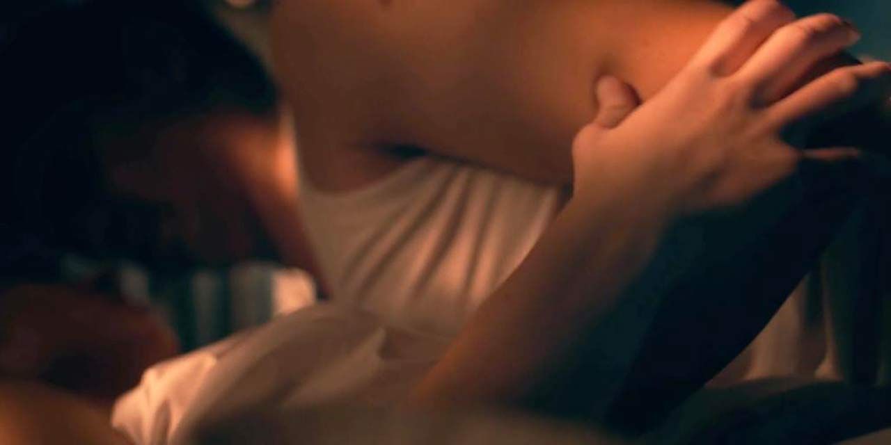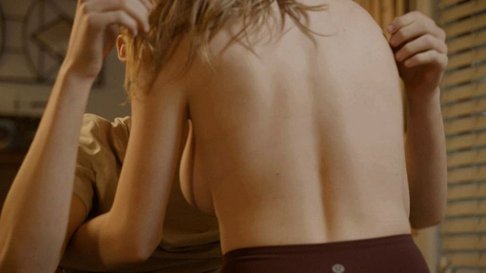 Sexy Sydney Sweeney is sitting facing a guy as he lifts her shirt off over her head. Then we see quite a bit of side boob from behind. She kisses the guy before we see her lying in bed with him – his hand on her right breast before she draws the covers up.