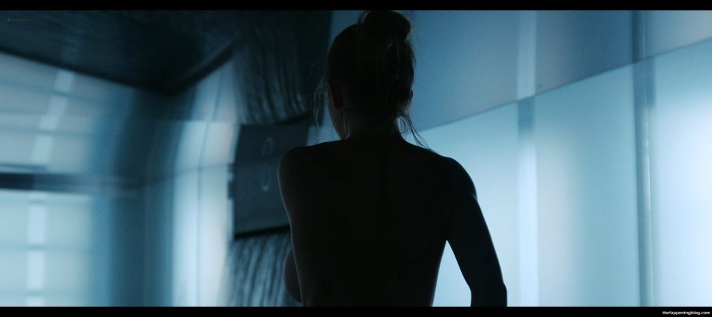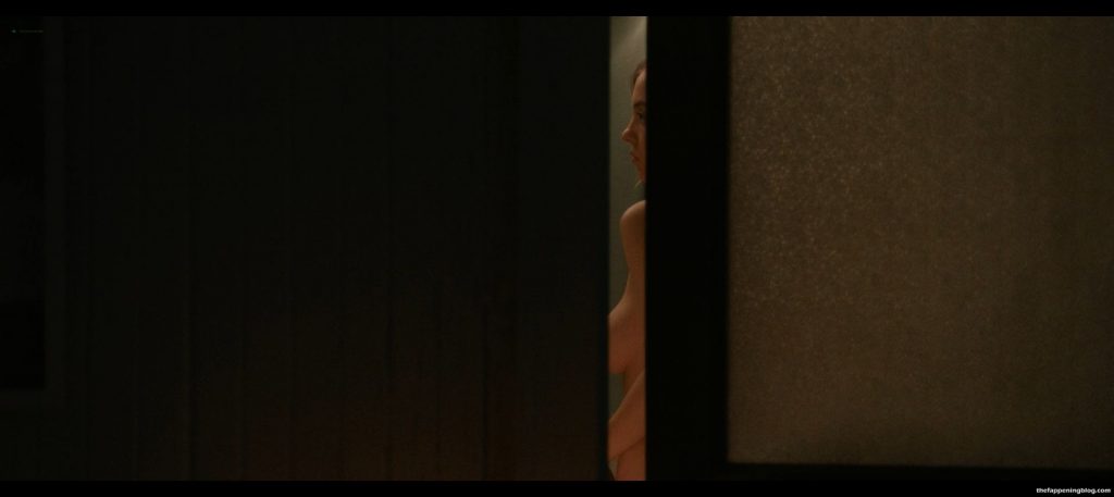 Sydney is getting out of bed naked, showing her bare back and some side boob as she sits up. She then walks into another room, showing even more side boob from behind as she bends over slightly when stepping on some glass and looking at her foot.