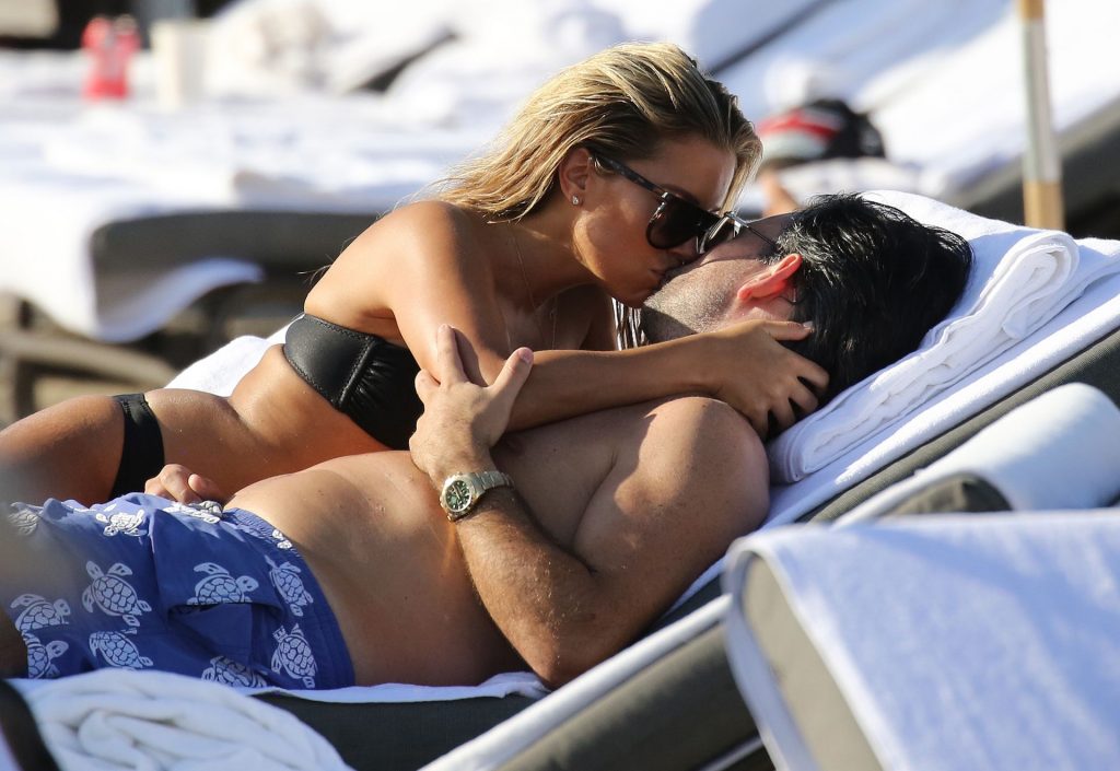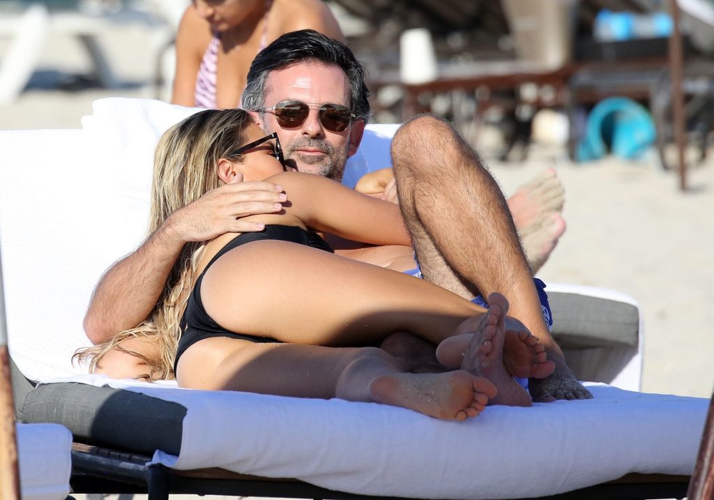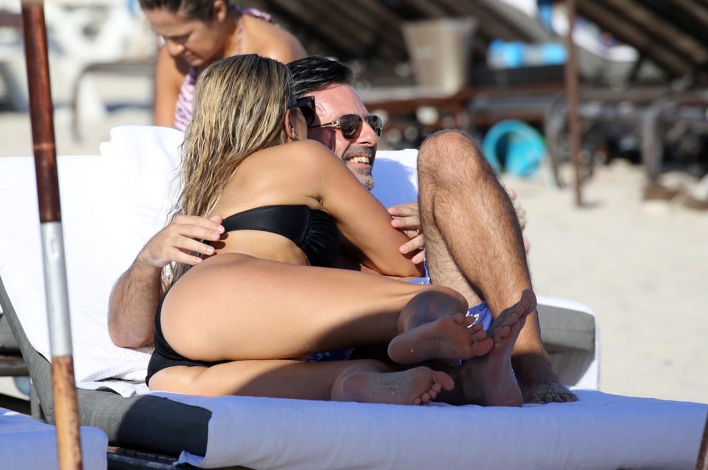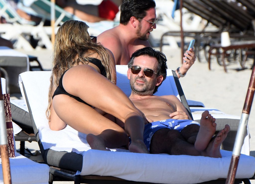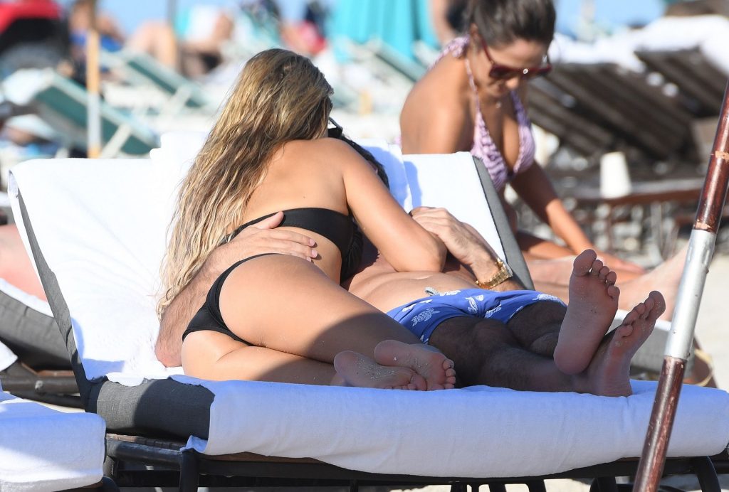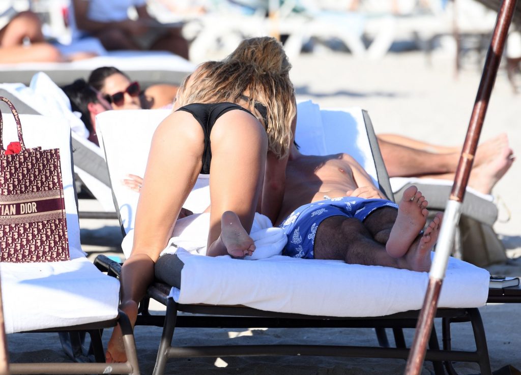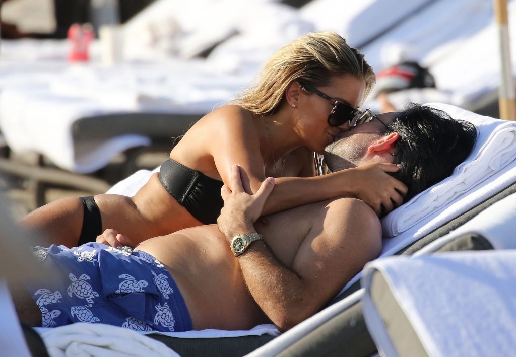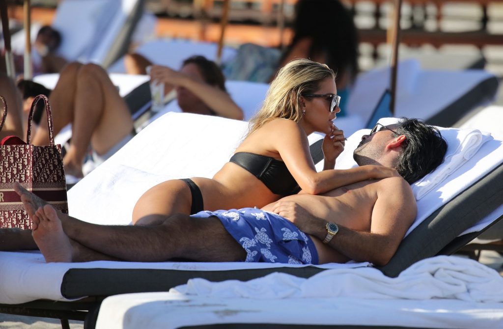 La celebrità olandese Sylvie Meis (41) indossa un bikini nero e mostra un anello di fidanzamento mentre bacia Niclas Castello sulla spiaggia di Miami, 30/11/2019.