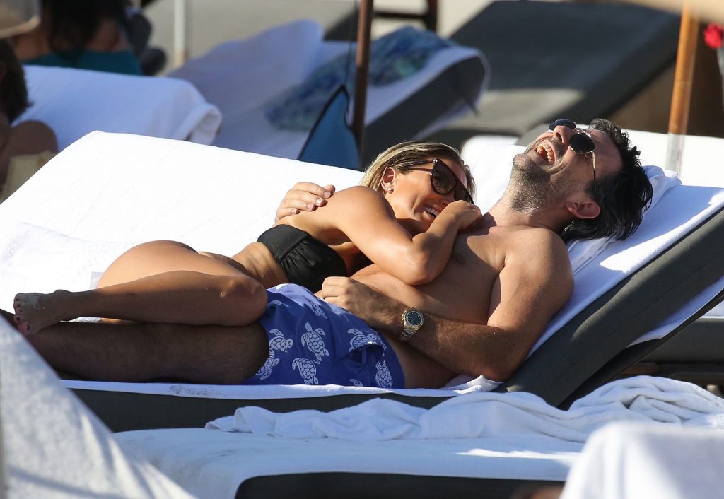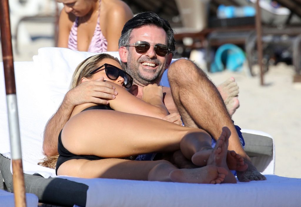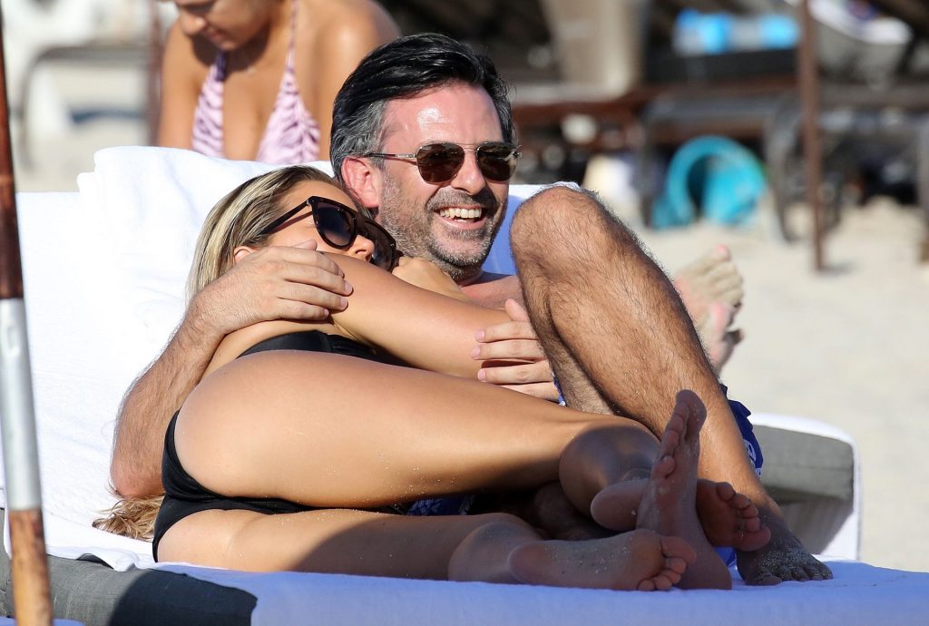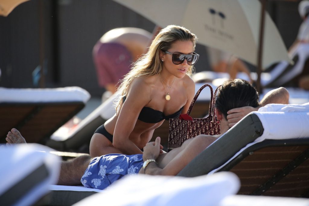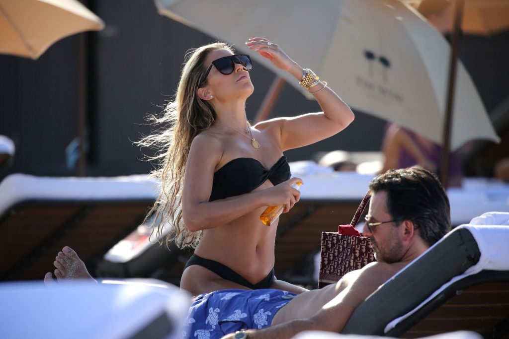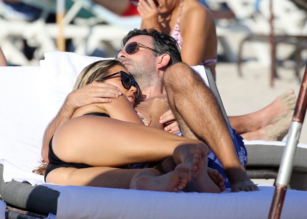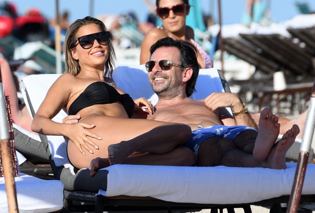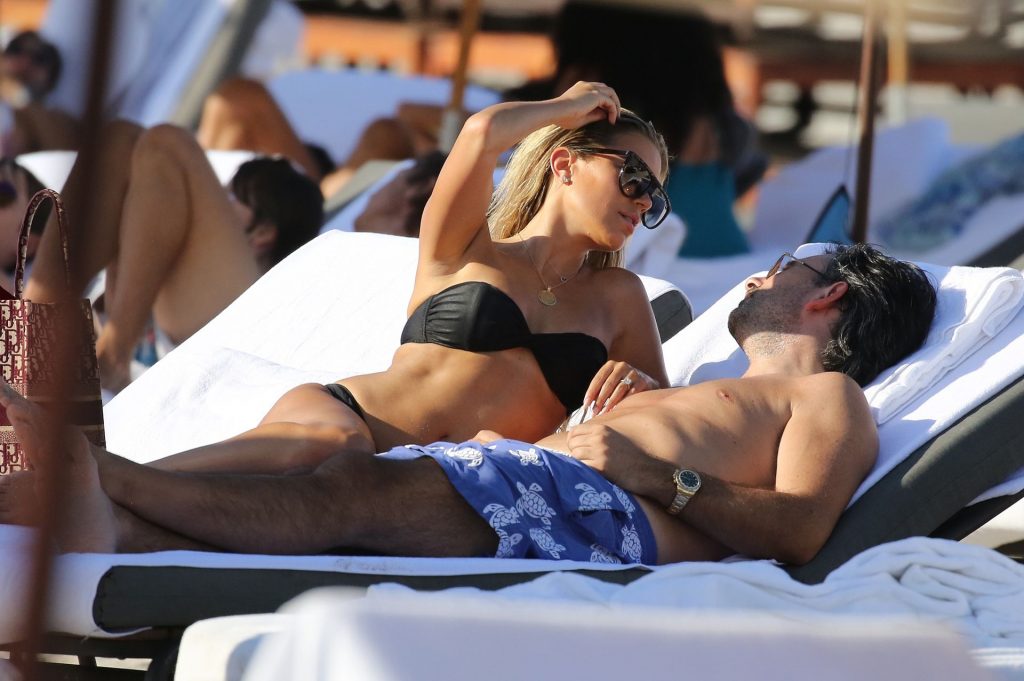 La celebrità olandese Sylvie Meis (41) indossa un bikini nero e mostra un anello di fidanzamento mentre bacia Niclas Castello sulla spiaggia di Miami, 30/11/2019.
