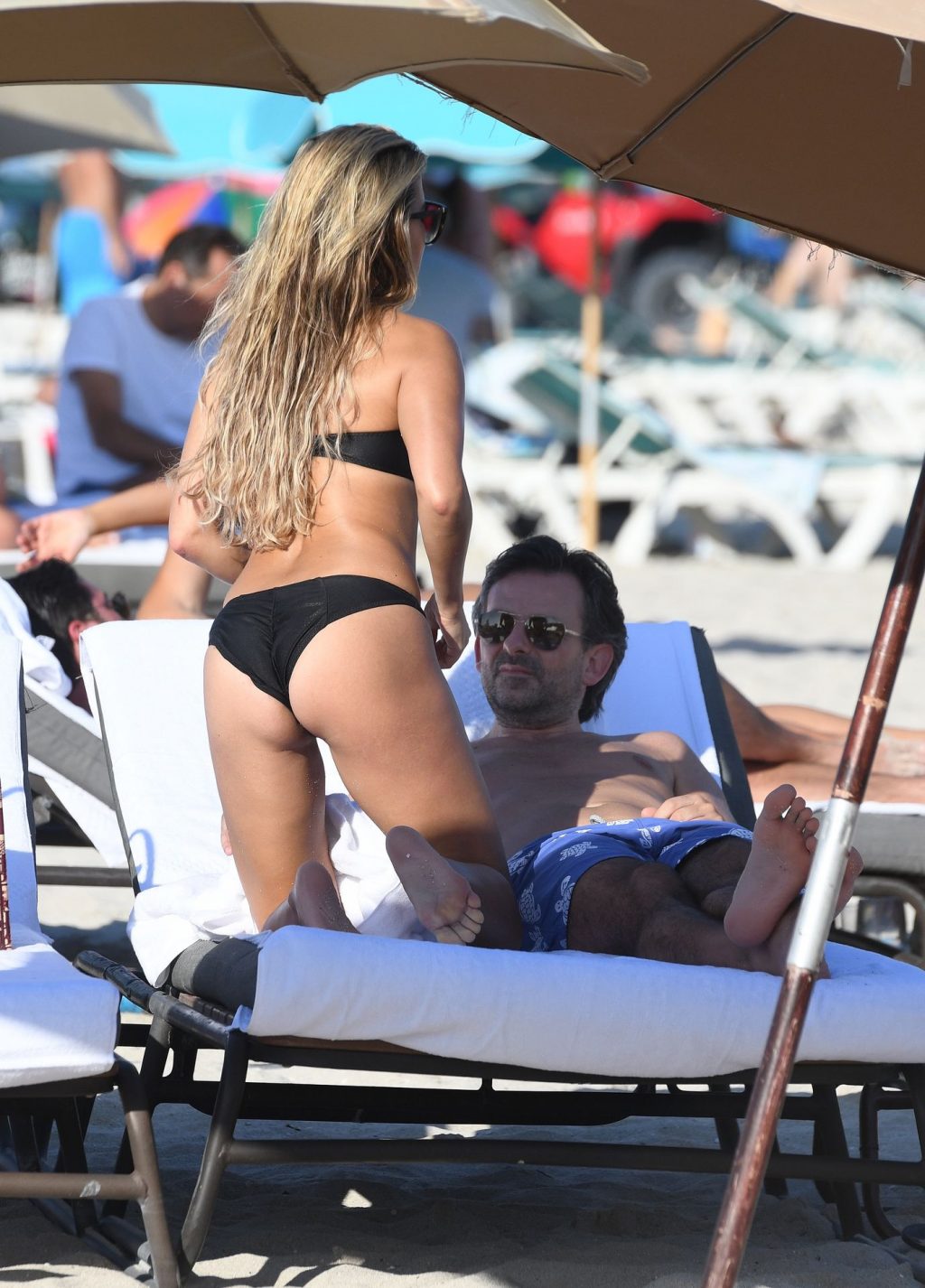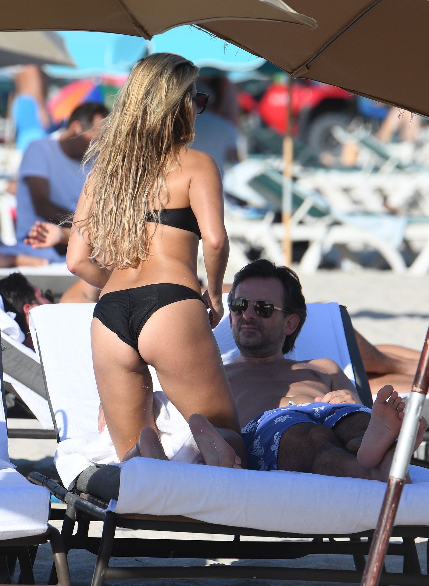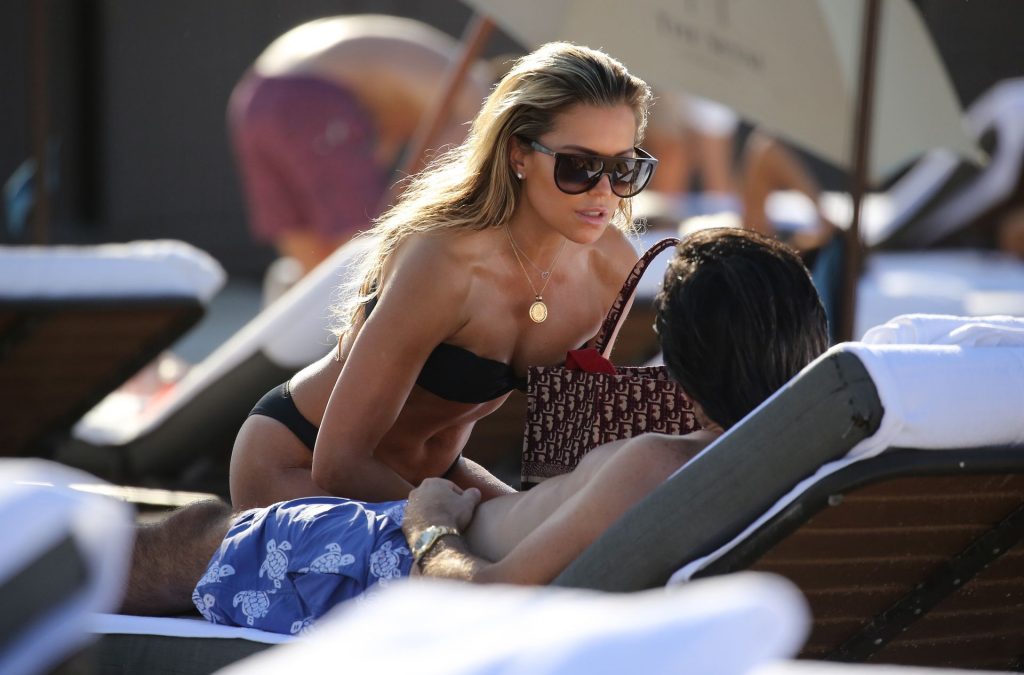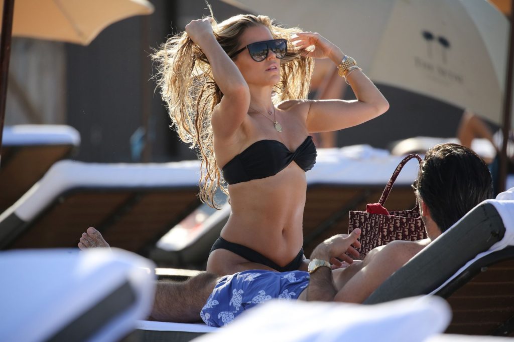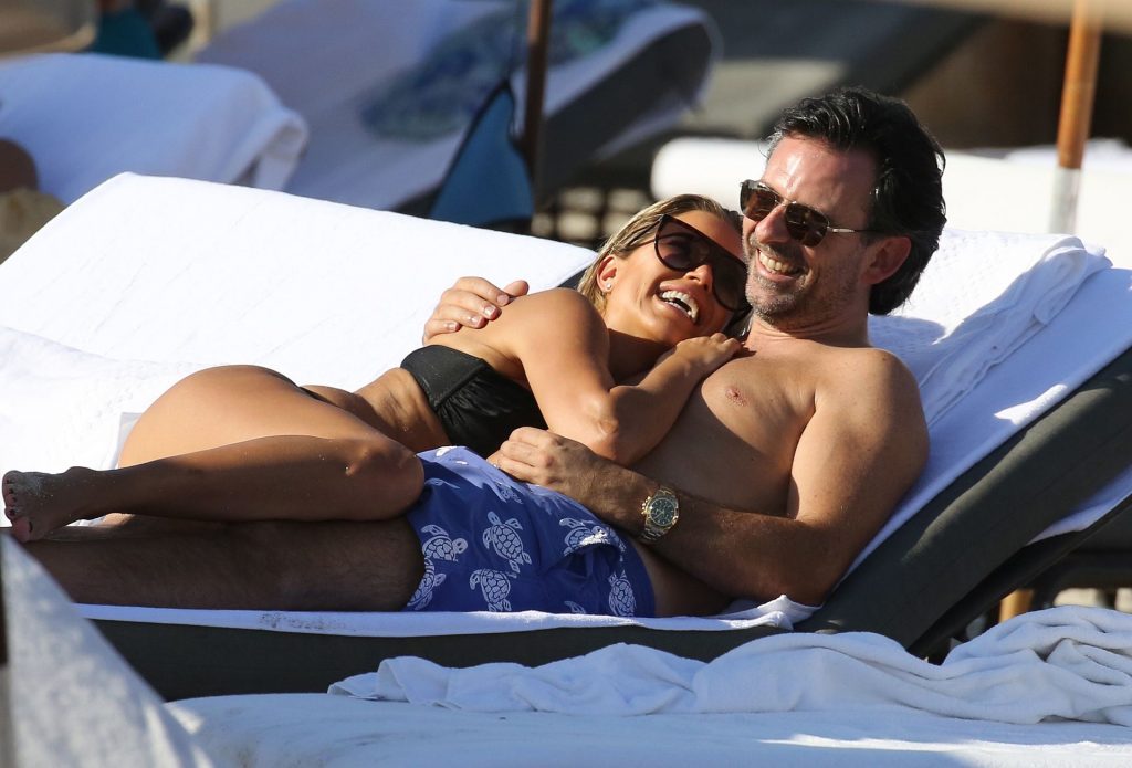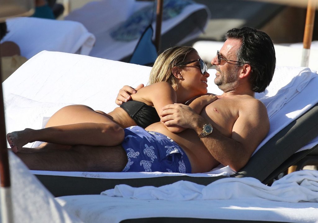 La celebrità olandese Sylvie Meis (41) indossa un bikini nero e mostra un anello di fidanzamento mentre bacia Niclas Castello sulla spiaggia di Miami, 30/11/2019.