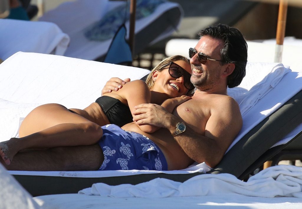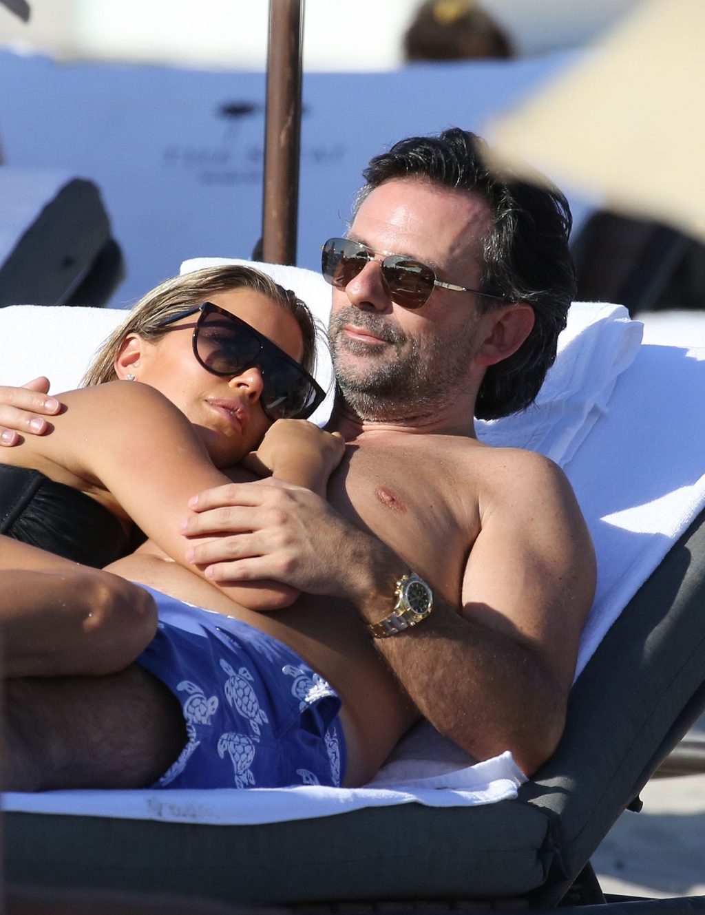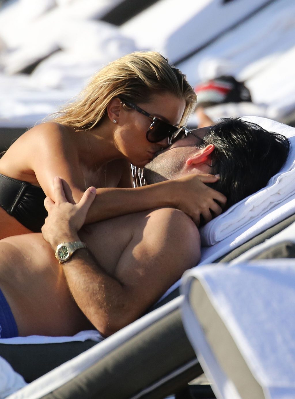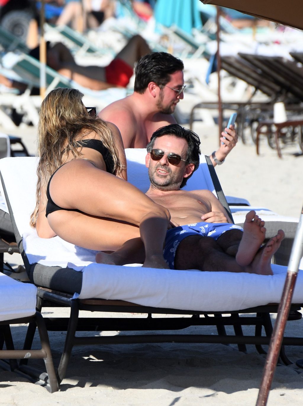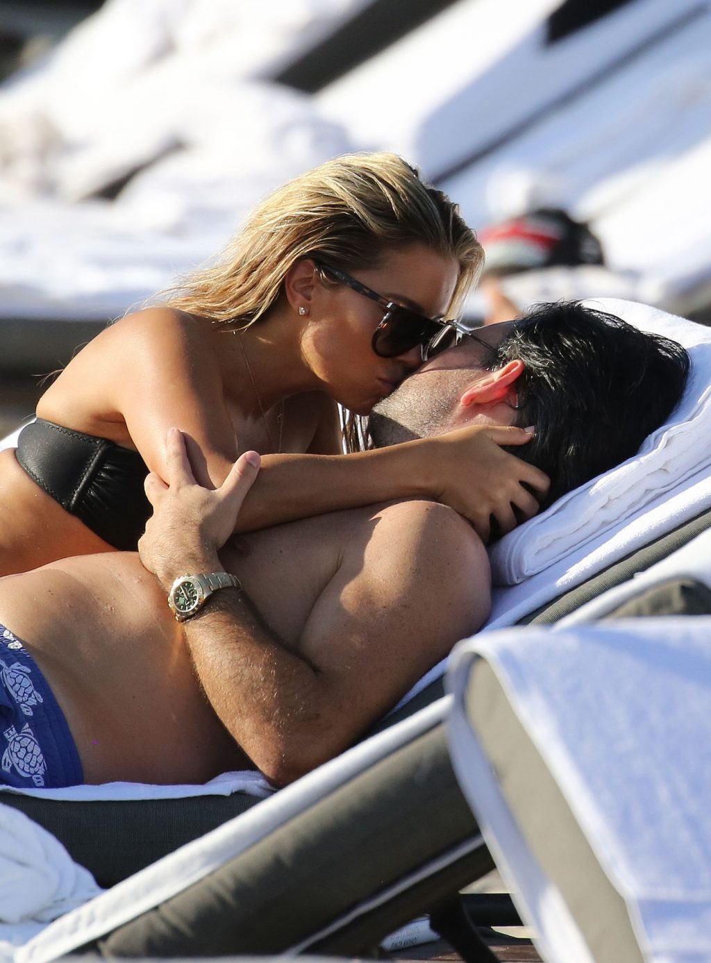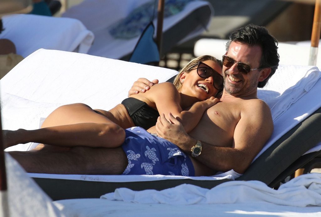 La celebrità olandese Sylvie Meis (41) indossa un bikini nero e mostra un anello di fidanzamento mentre bacia Niclas Castello sulla spiaggia di Miami, 30/11/2019.
