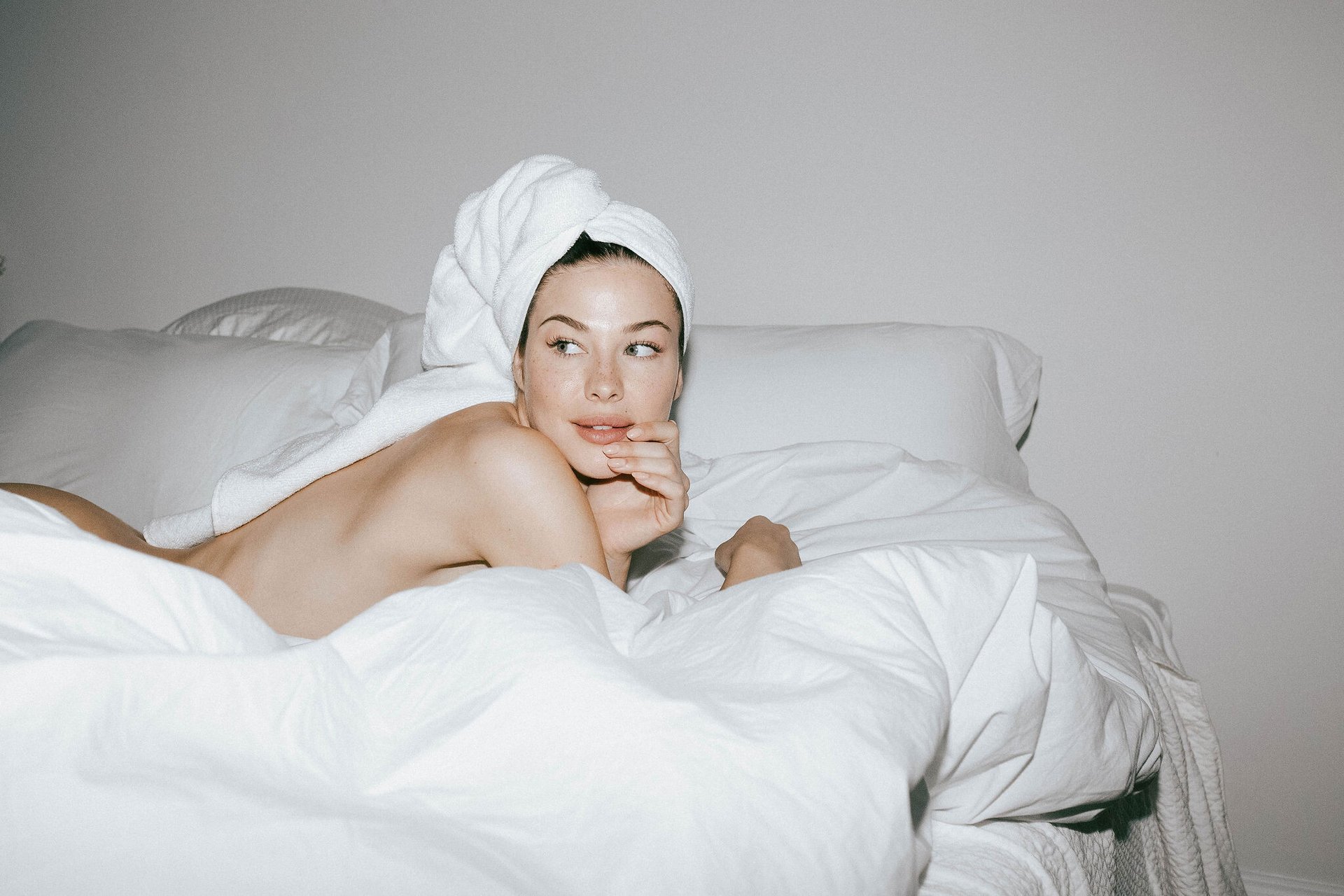 Foto nude della modella americana Jenny Watwood scattate da Brooke Hanmer (2019). La ragazza di 29 anni è stata fotografata sdraiata a letto completamente nuda con un asciugamano sulla testa e coperta da una coperta.