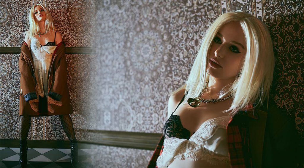 La bionda glamour Maria Avtakhova mostra la sua figura perfetta, posando in lingerie nera in un servizio fotografico hot (2021).