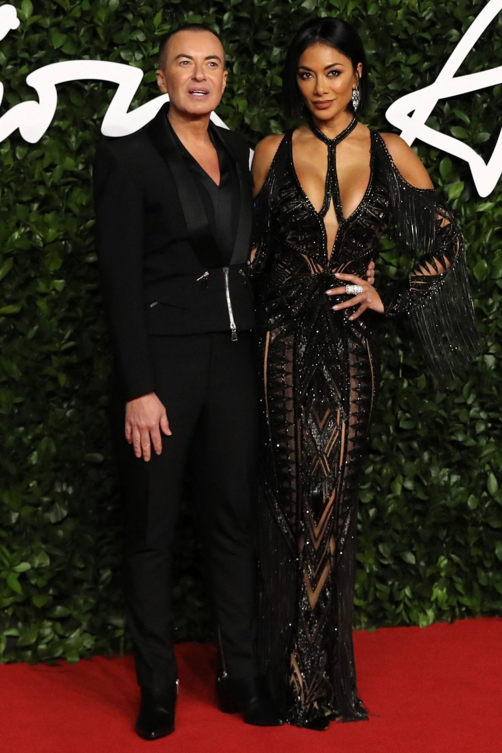 Il stilista gallese Julien MacDonald e la cantante statunitense Nicole Scherzinger posano sul red carpet all’arrivo ai The Fashion Awards 2019 a Londra, 12/01/2019