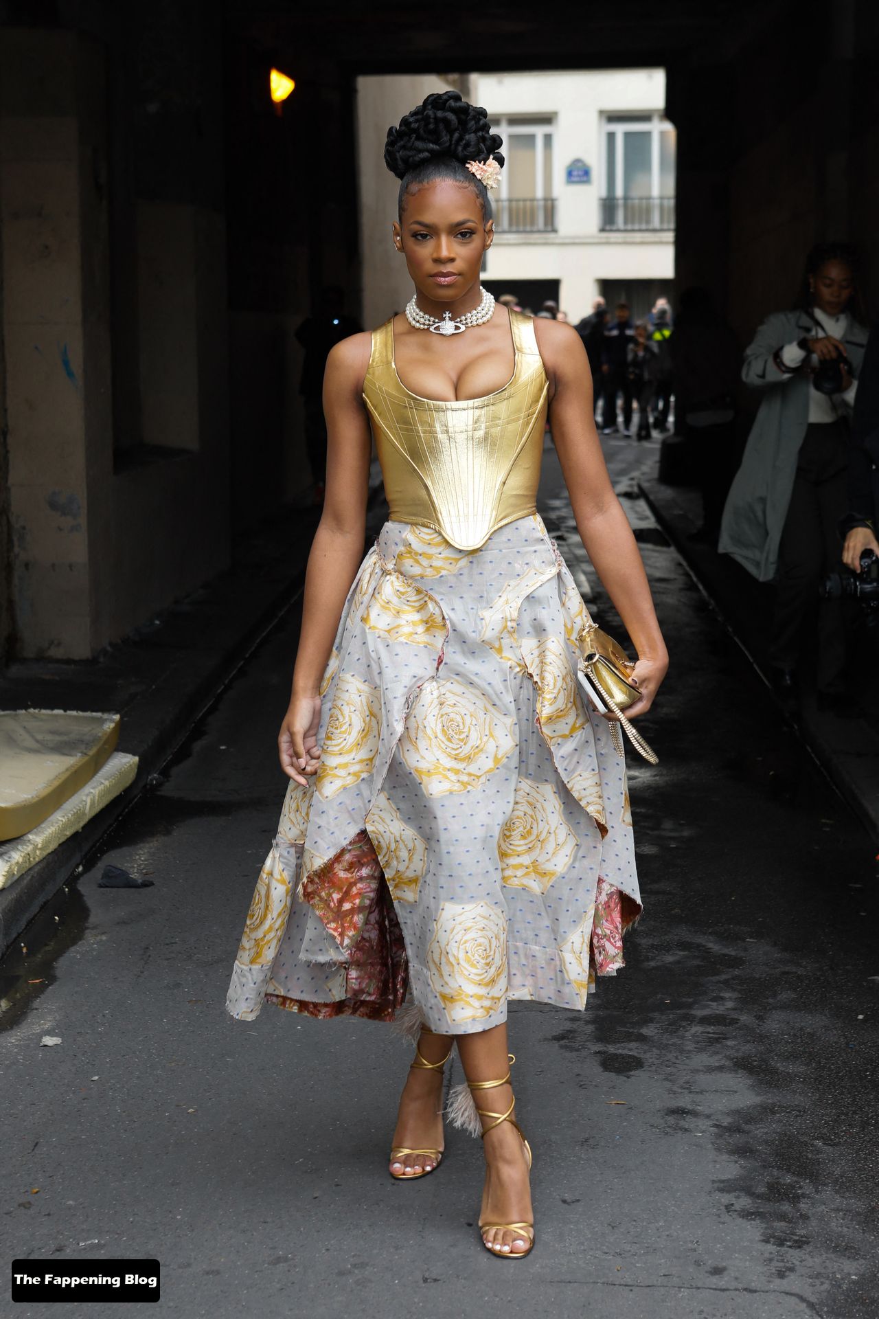YouTuber Lena Mahfouf (Situation) posa senza reggiseno alla sfilata Balmain Primavera/Estate 2022 durante la Paris Fashion Week, 29/09/2021.