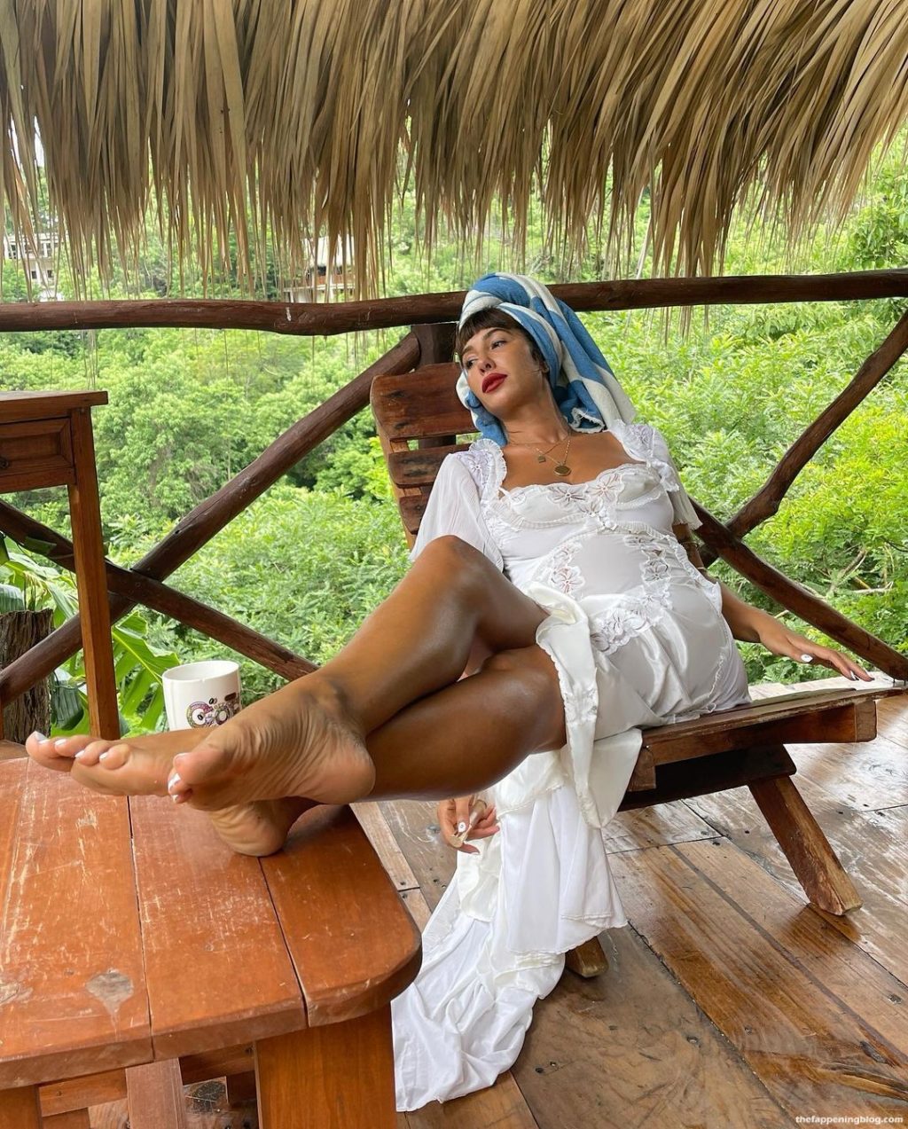 Attrice e star di The Fappening Jackie Cruz mostra i suoi piedi e il décolleté, posando in un vestito bianco in un nuovo servizio sui social media, 07/10/2021.