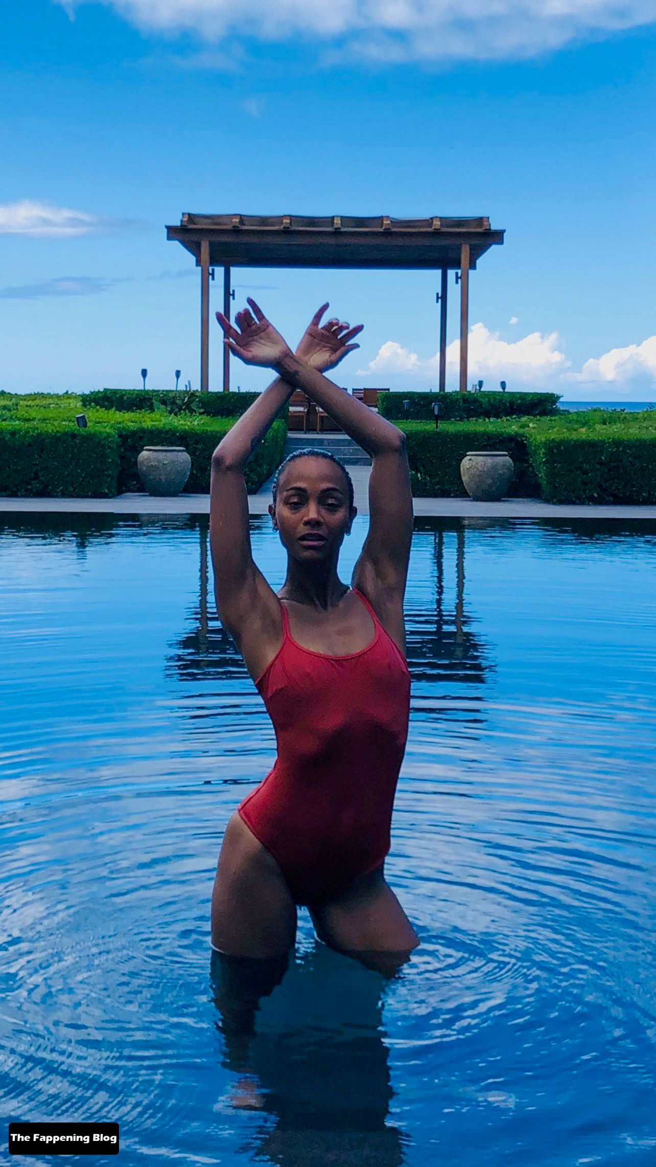 L’attrice Zoe Saldana mostra la sua figura snella e sexy e le sue curve in un bikini rosso, godendosi la sua vacanza (2021).