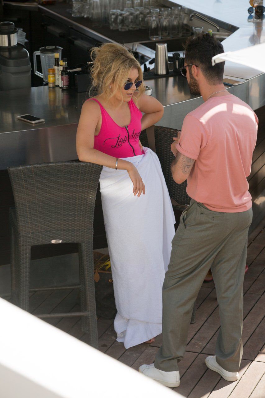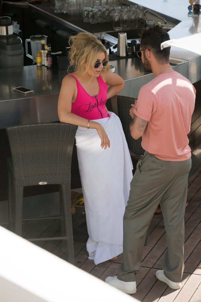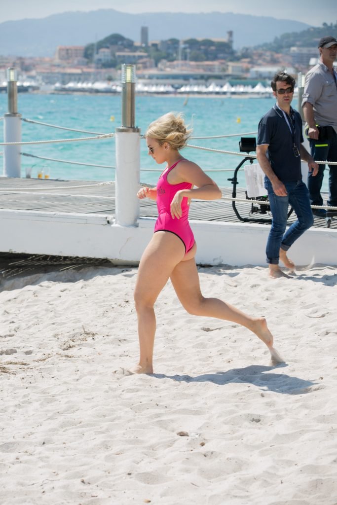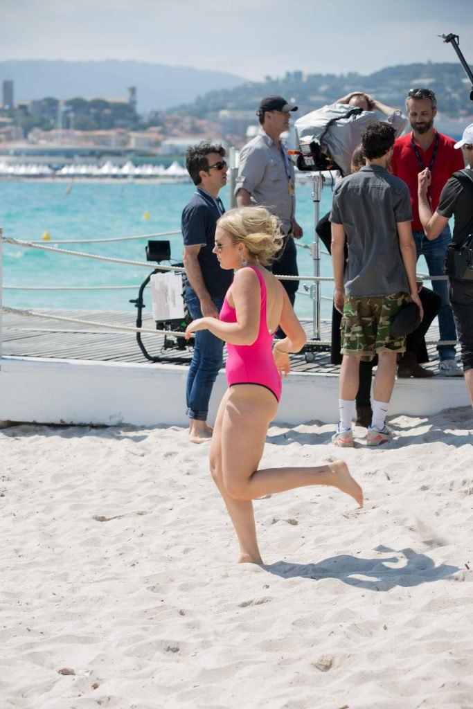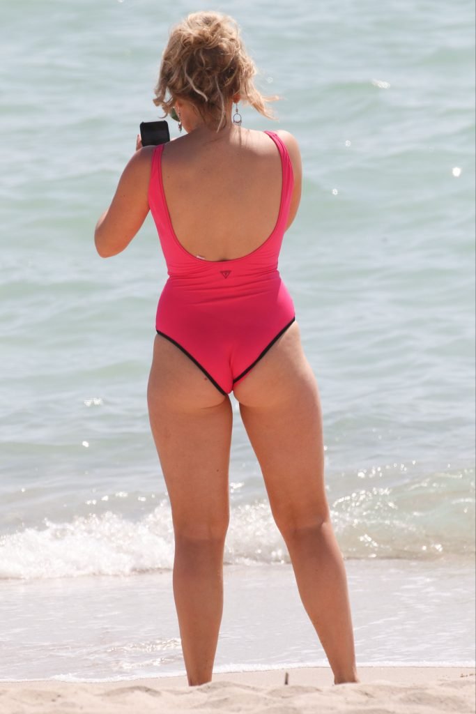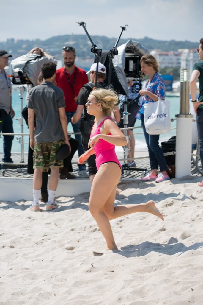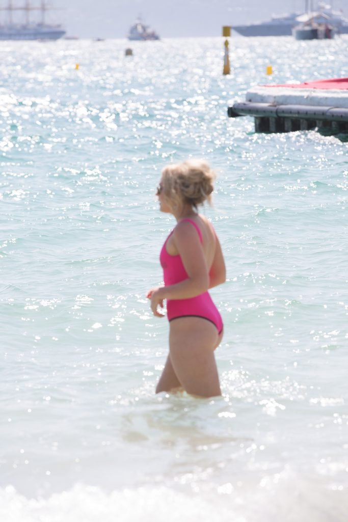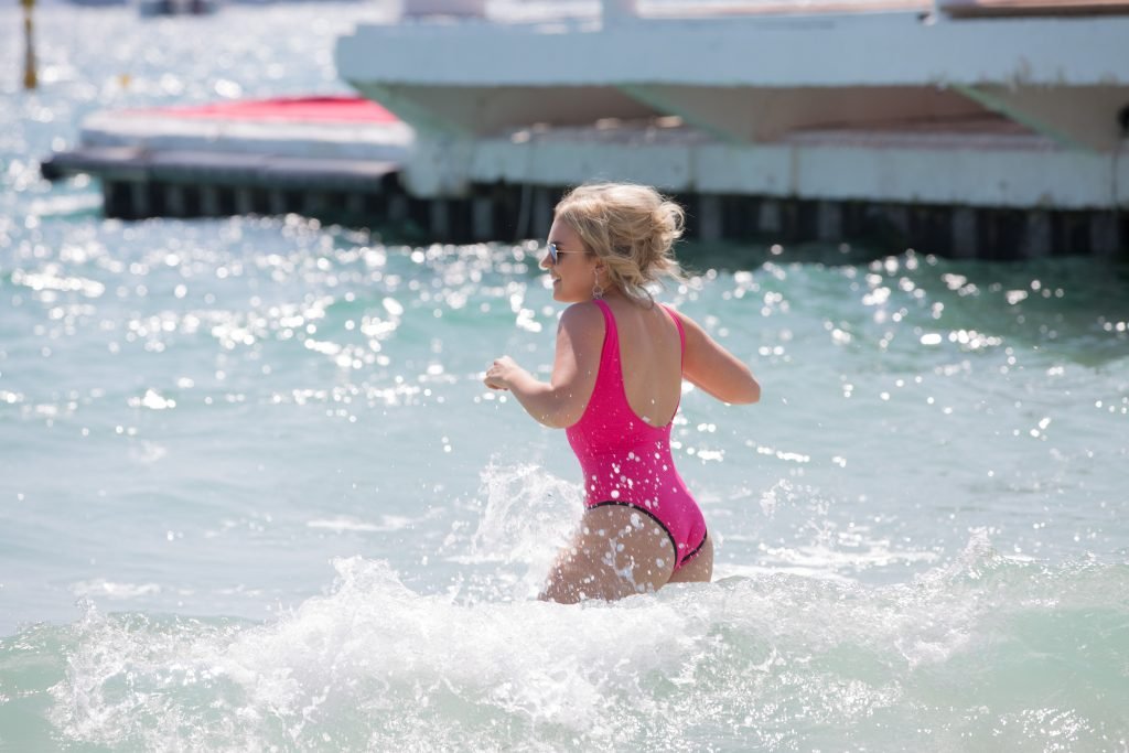 Tallia Storm si gode una giornata di sole in un costume intero neon rosa con la scritta ‘Los Angeles’ sulla spiaggia di Cannes, 12/05/2018. Tallia Storm è una cantante e star della TV reality di Glasgow, Scozia.