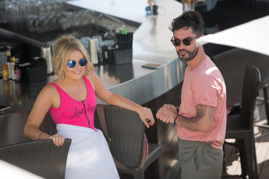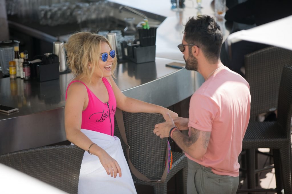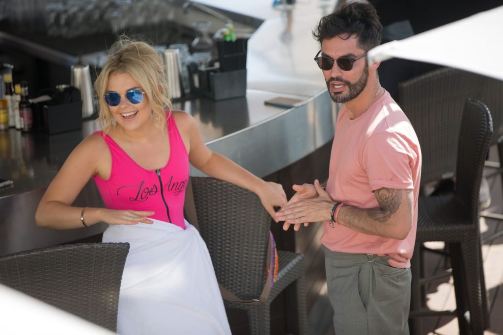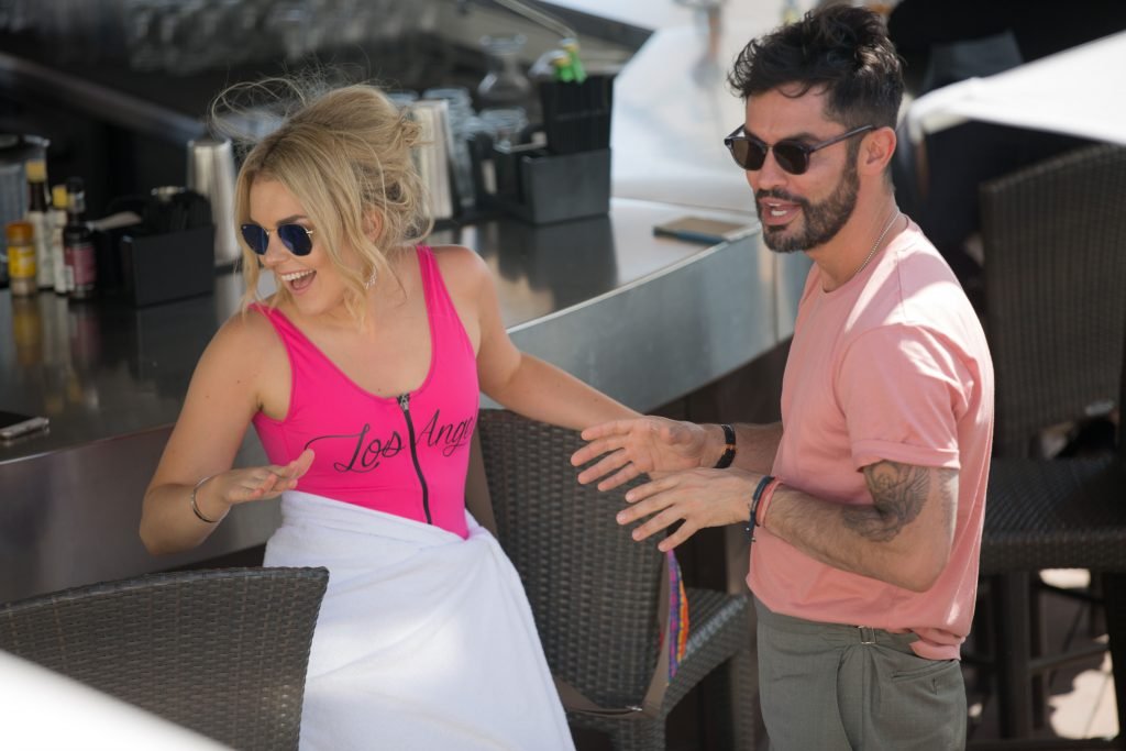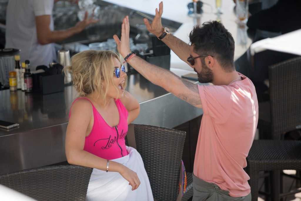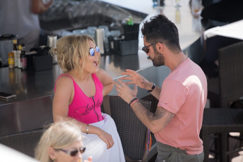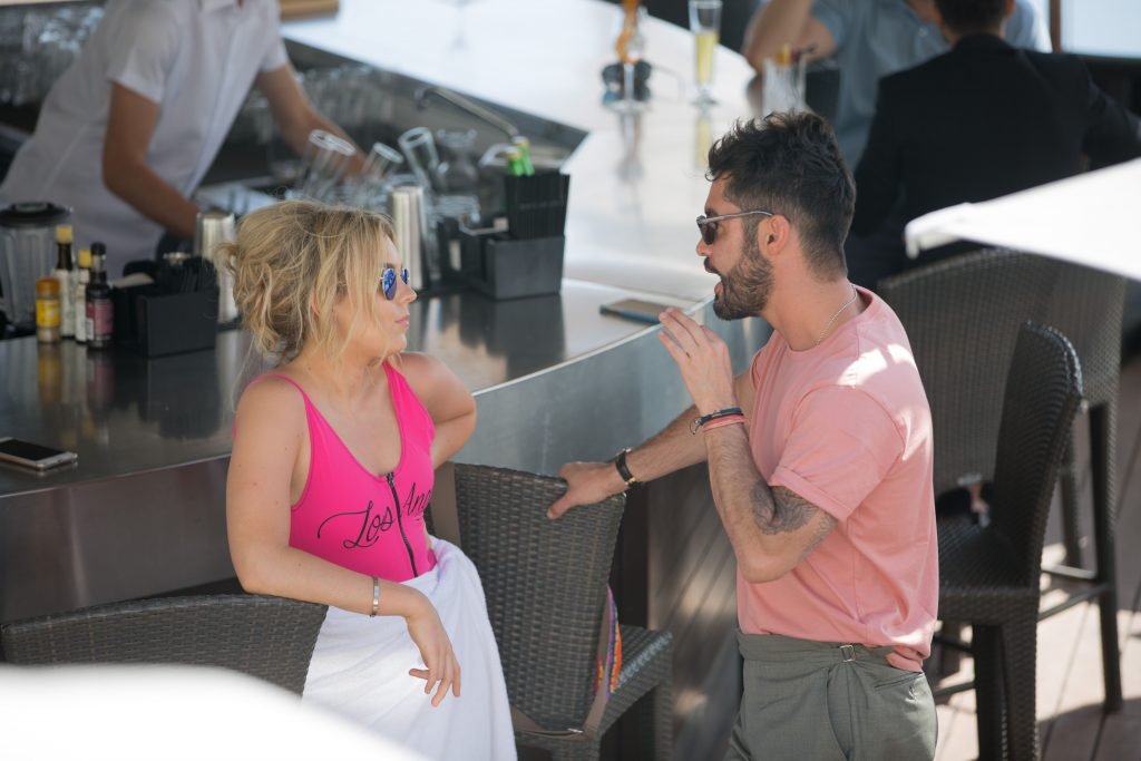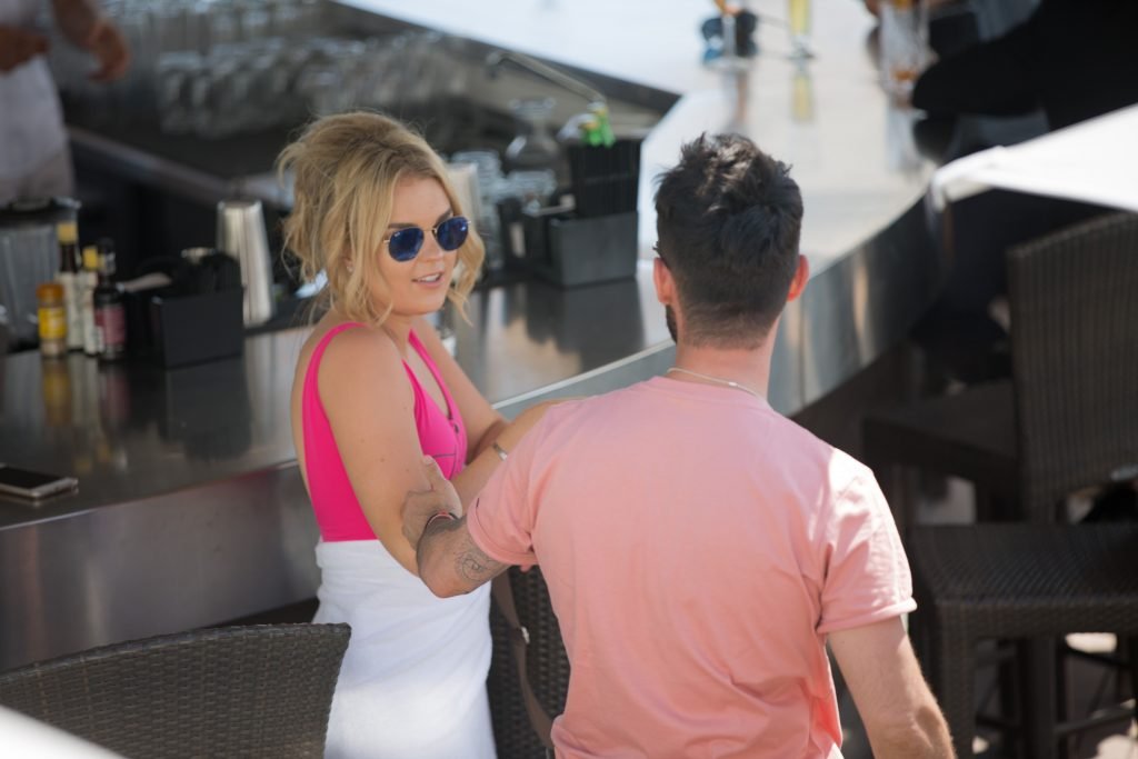 Tallia Storm si gode una giornata di sole in un costume intero neon rosa con la scritta ‘Los Angeles’ sulla spiaggia di Cannes, 12/05/2018. Tallia Storm è una cantante e star della TV reality di Glasgow, Scozia.