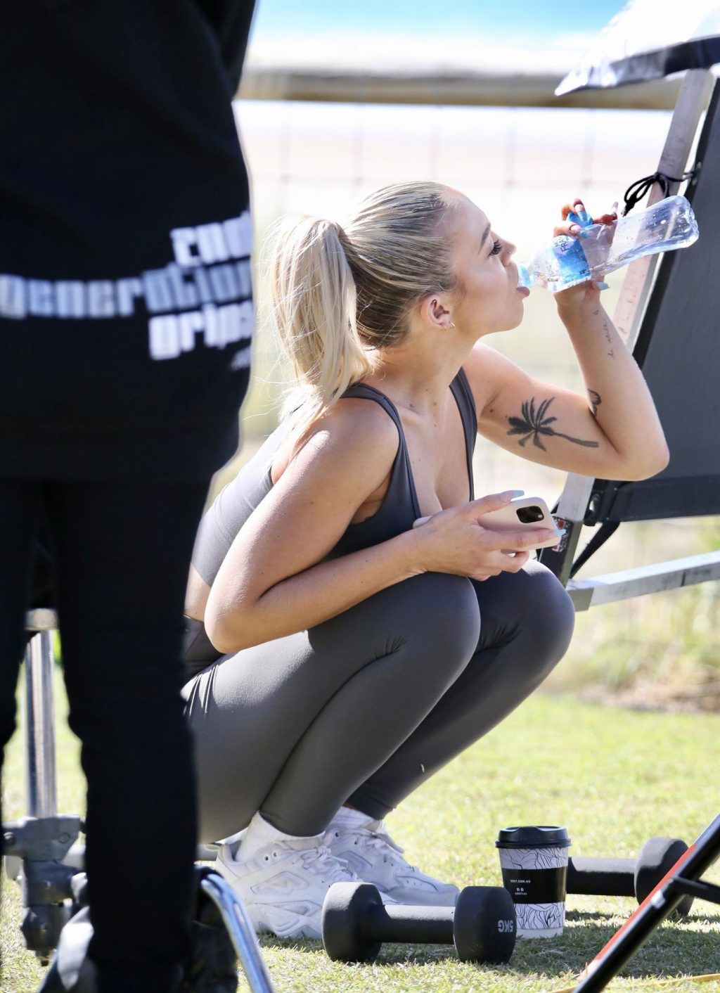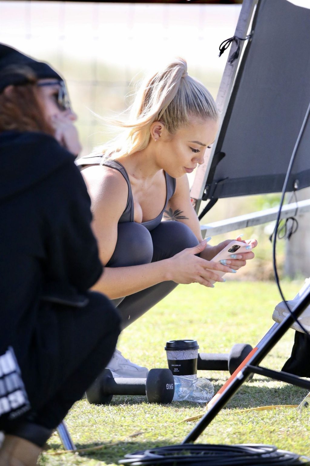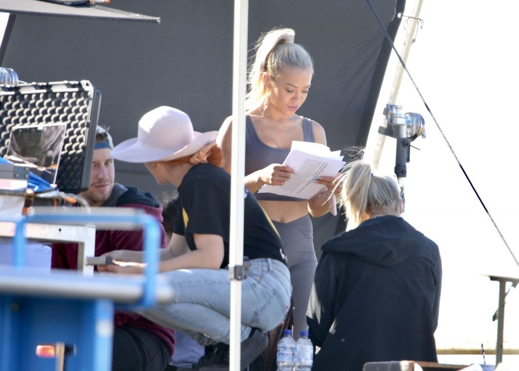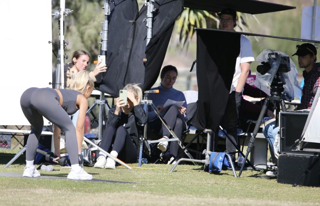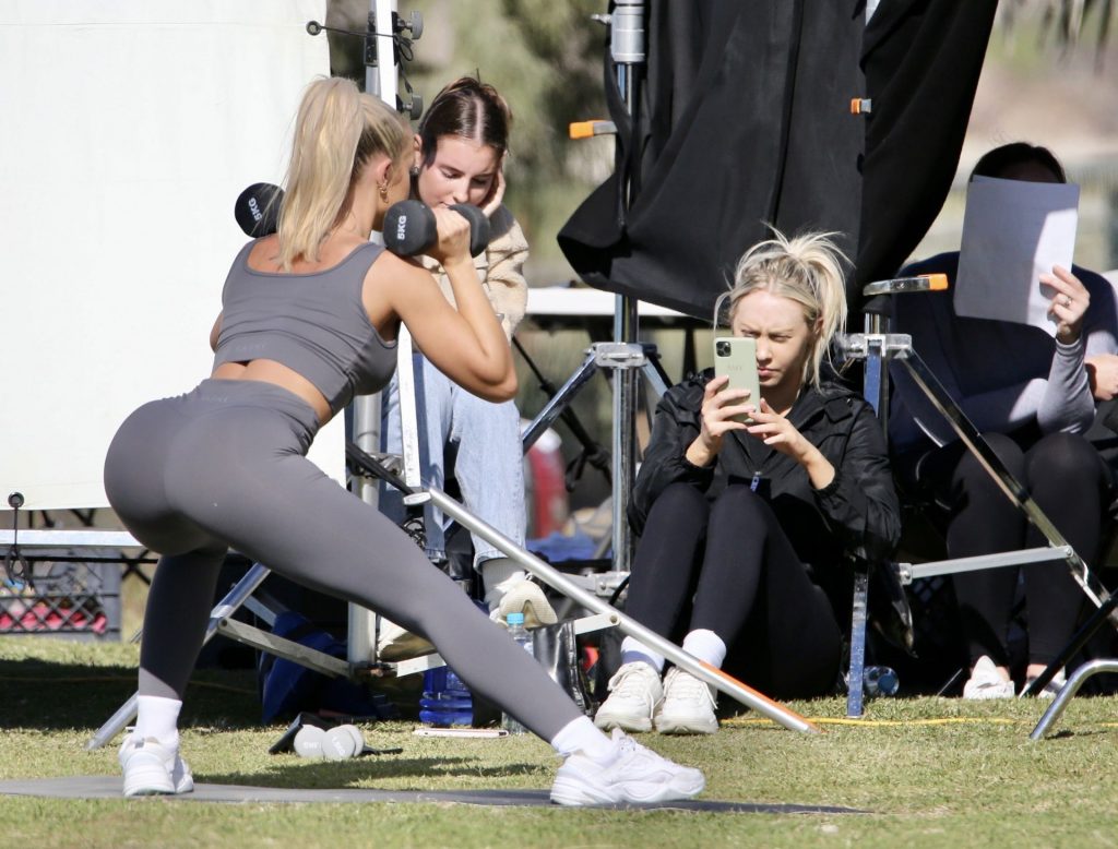 Modella Tammy Hembrow scatta contenuti per la sua app fitness a Mermaid Beach in Australia, 06/04/2020.