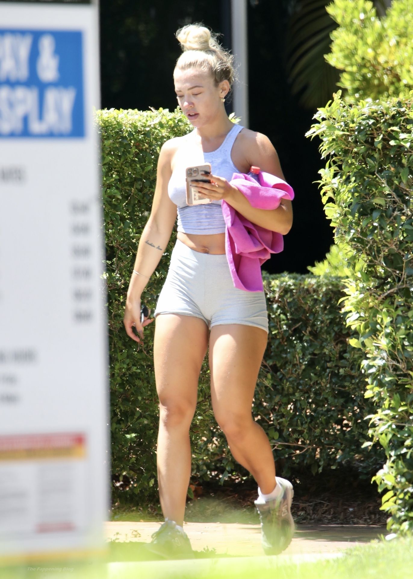 Tammy Hembrow sudata lascia la palestra dopo la sua sessione di allenamento quotidiana a Brisbane, 03/02/2021.