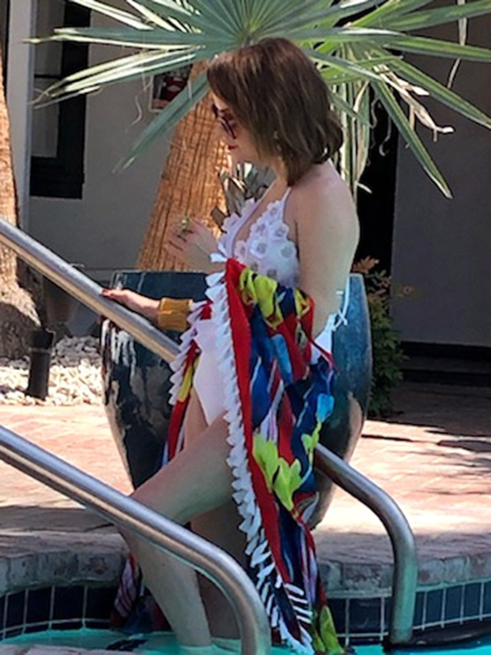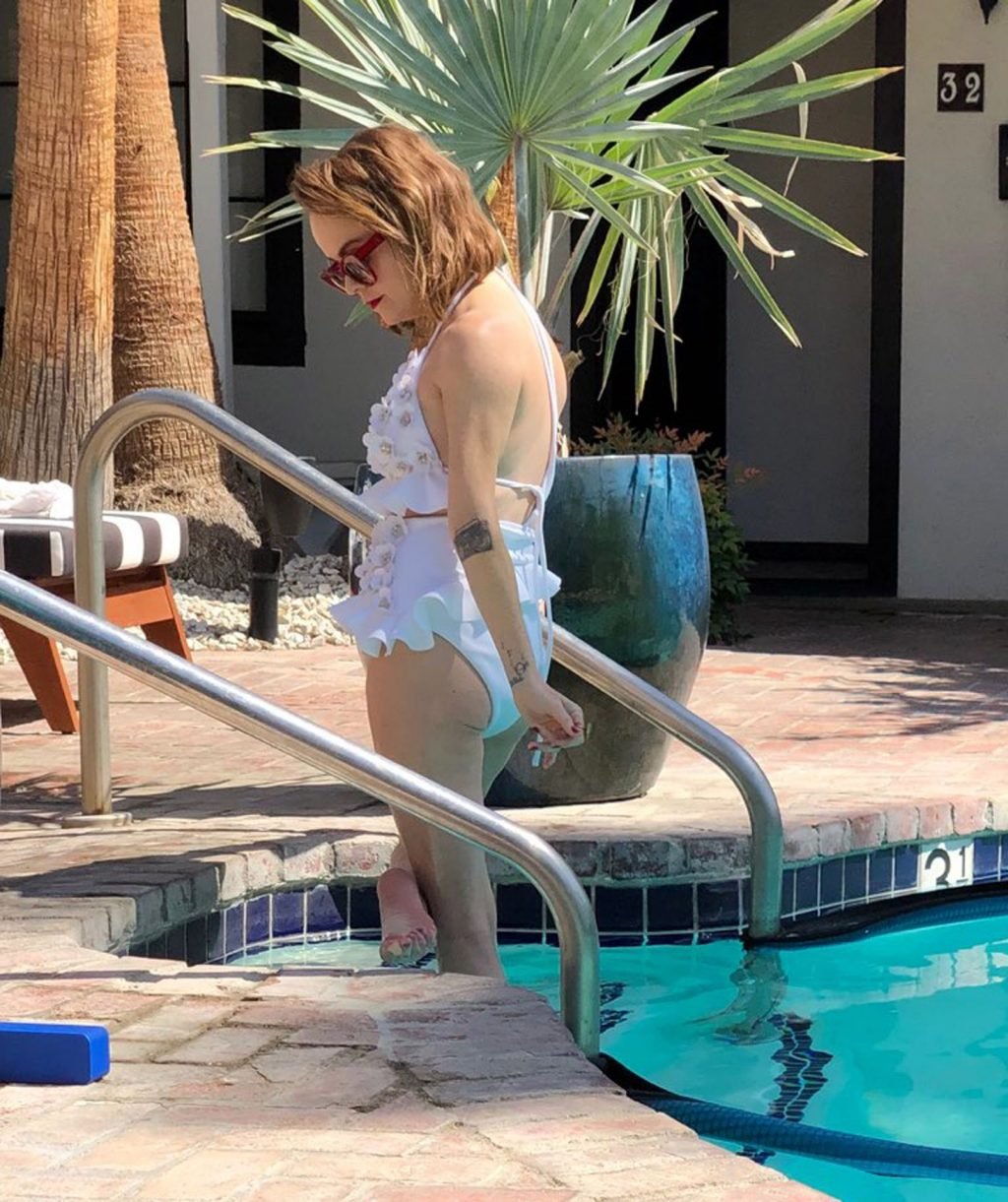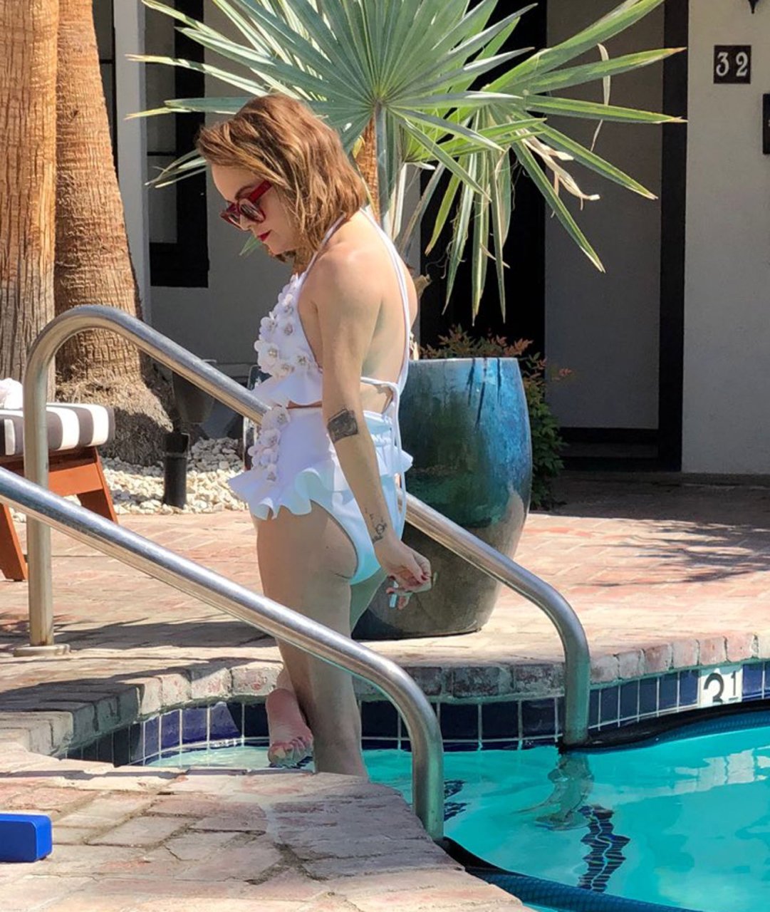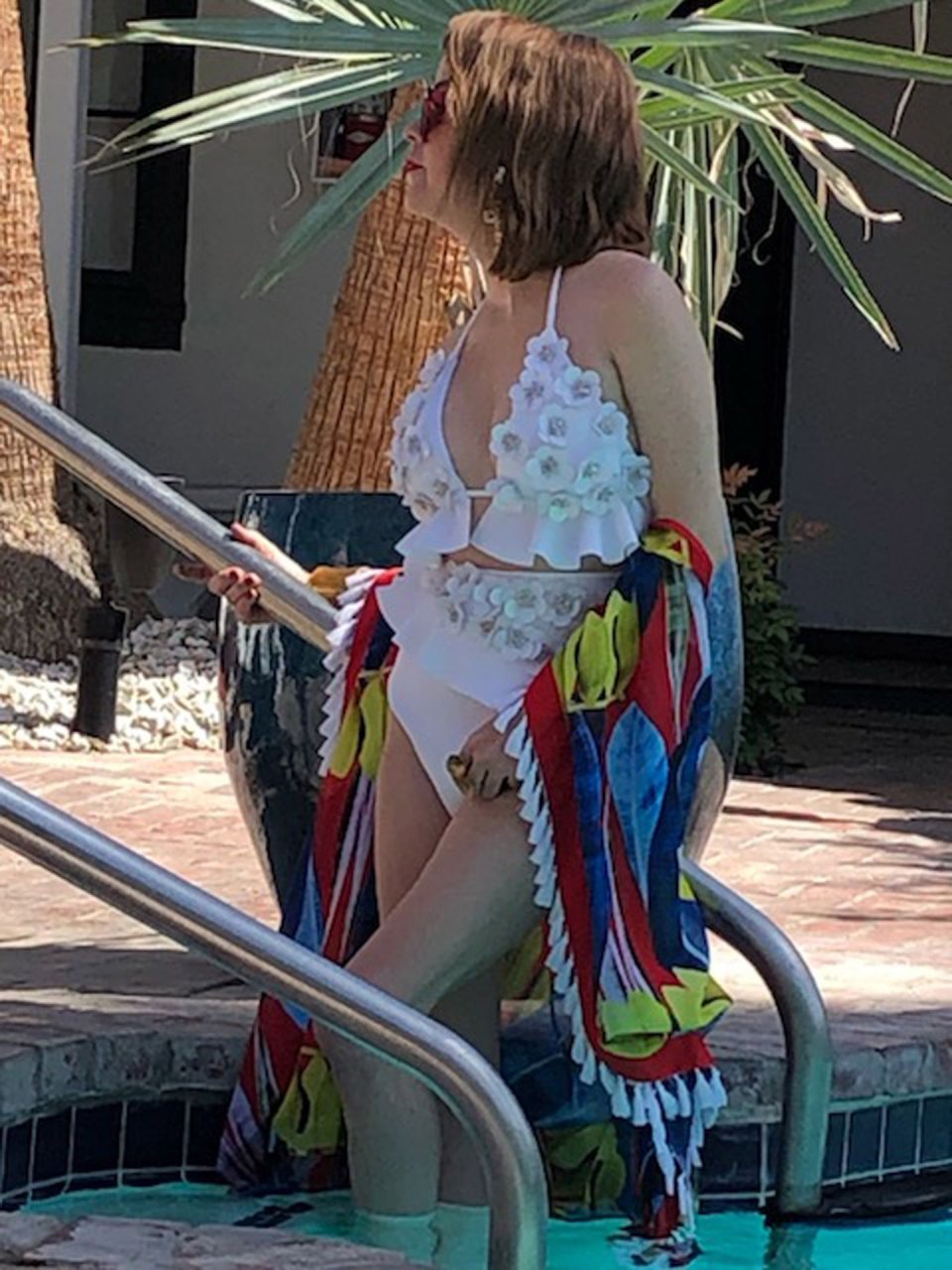 La star di “Orange is the New Black”, Taryn Manning, sfoggia il suo corpo in bikini con un costume da bagno bianco vintage durante un mini servizio fotografico con amici a bordo piscina a Palm Springs, 18/05/2019.