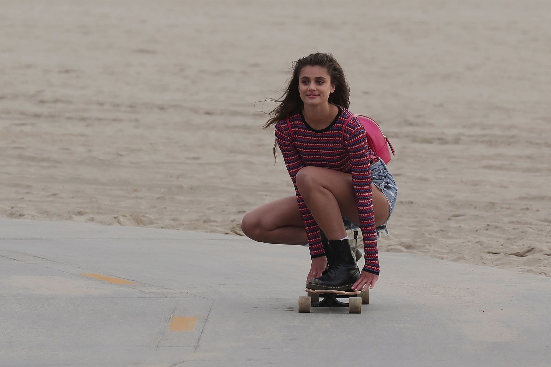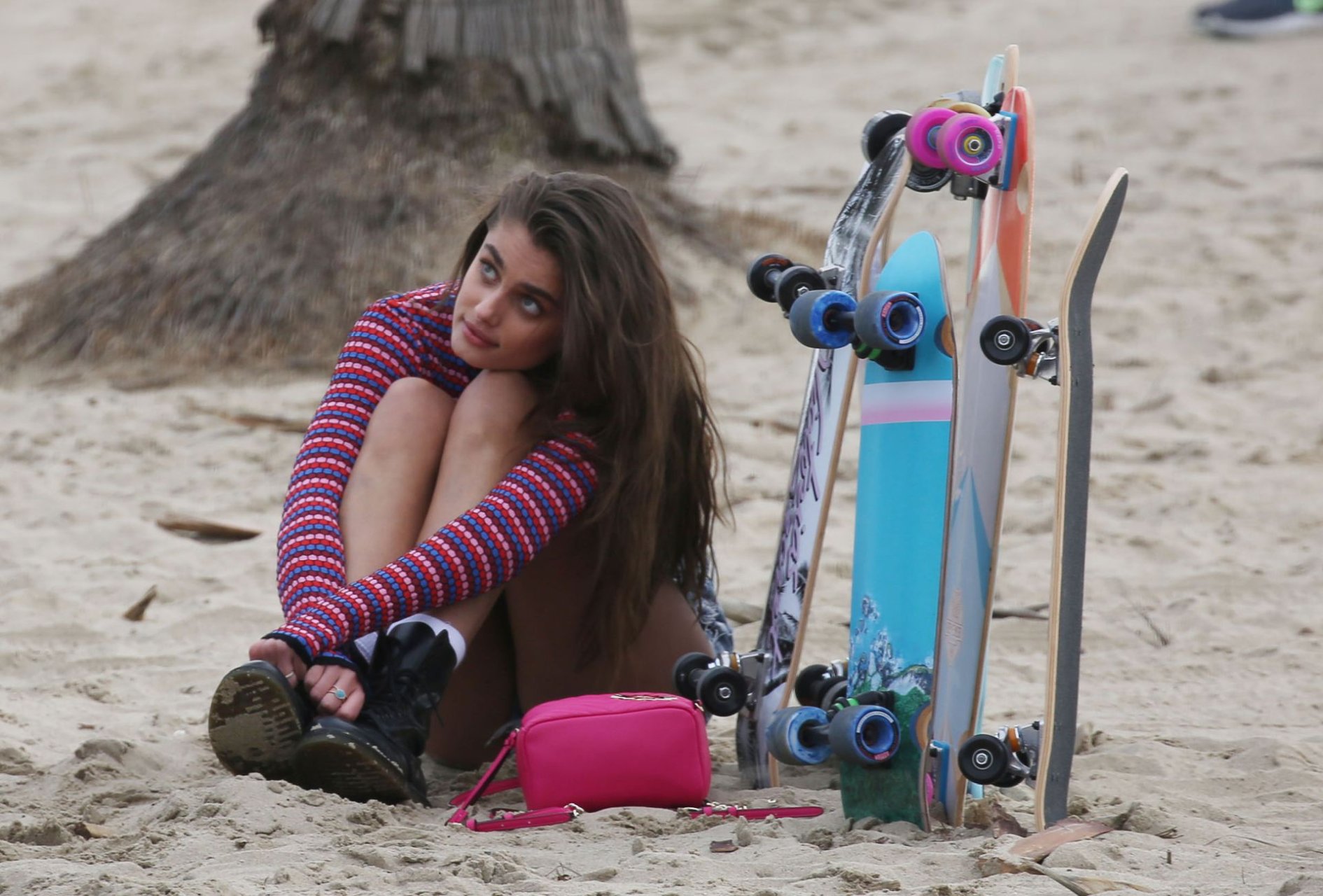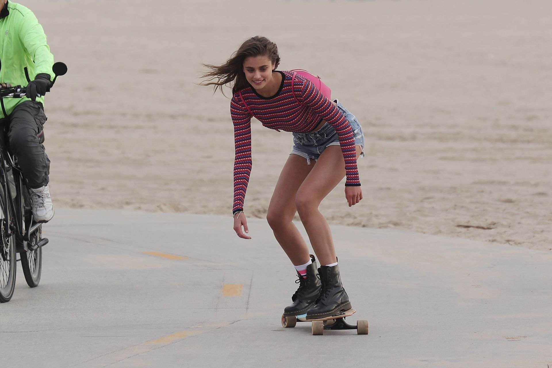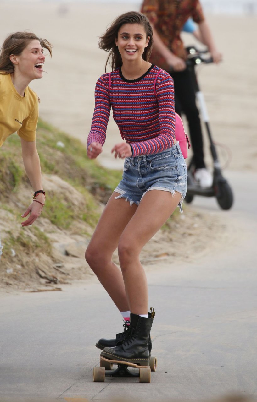 Modella Taylor Marie Hill indossa un costume da bagno a taglio alto e Daisy Dukes come ragazza skater durante il photoshoot di Victoria’s Secret a Venice Beach. Los Angeles, 01/10/2019.