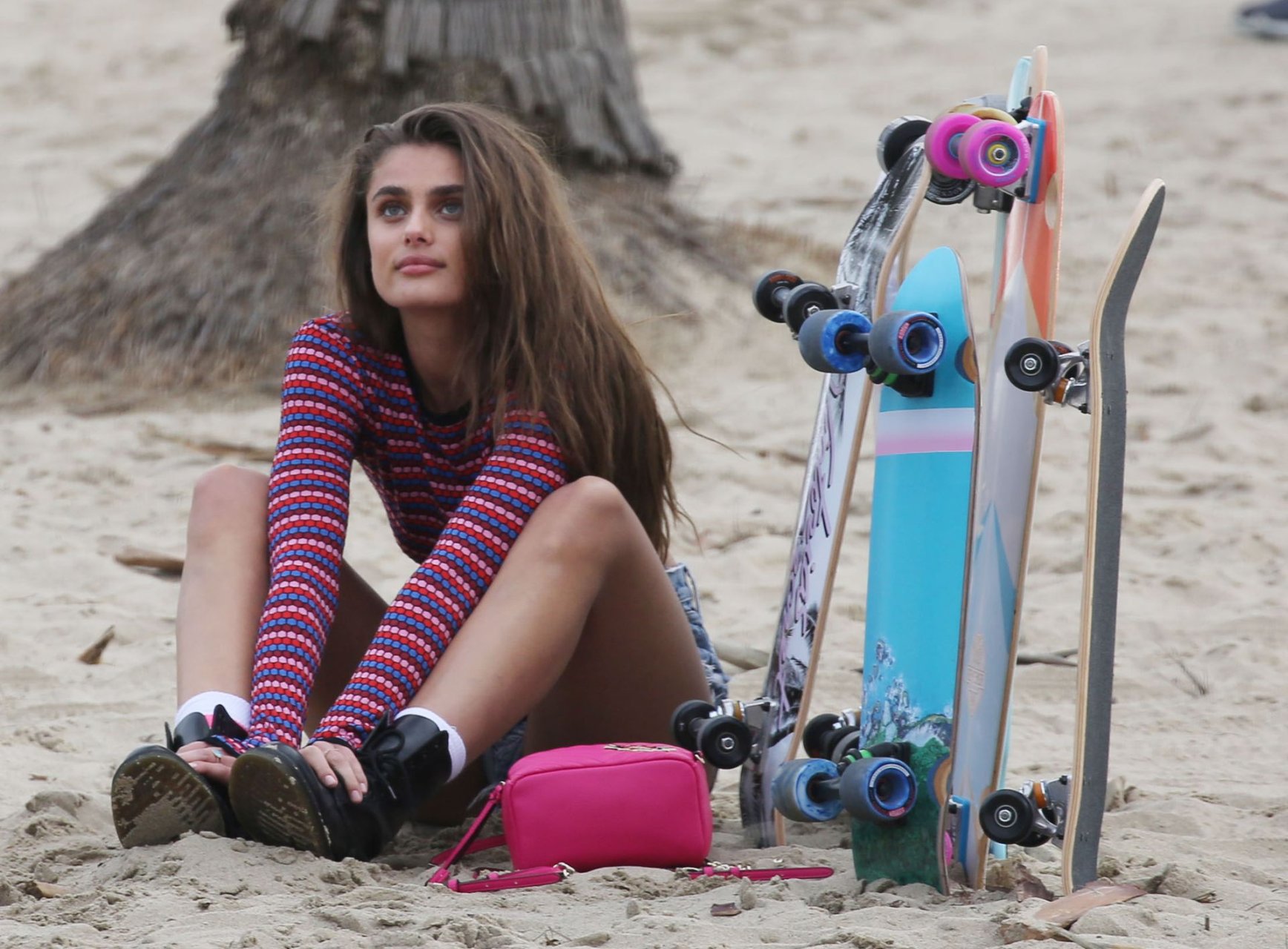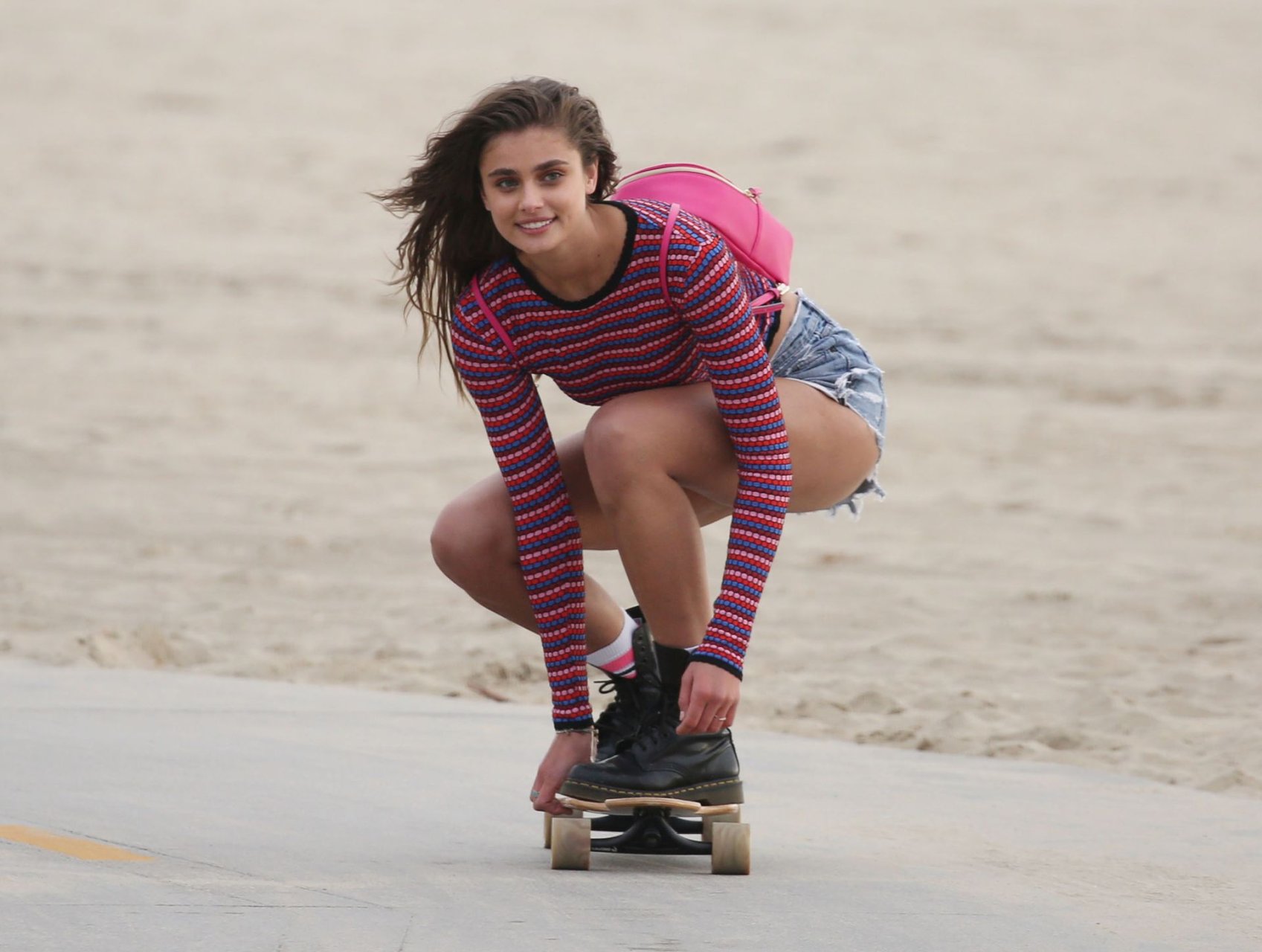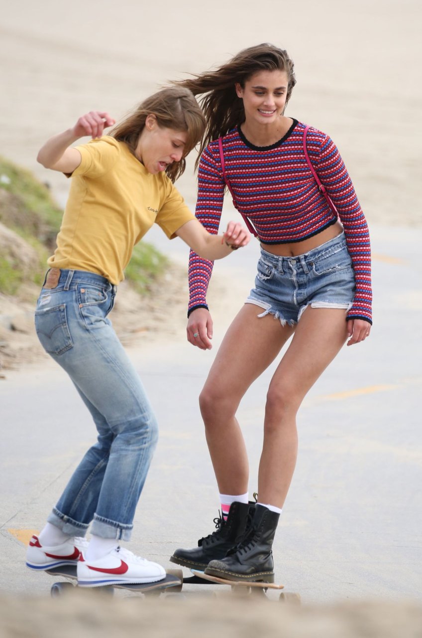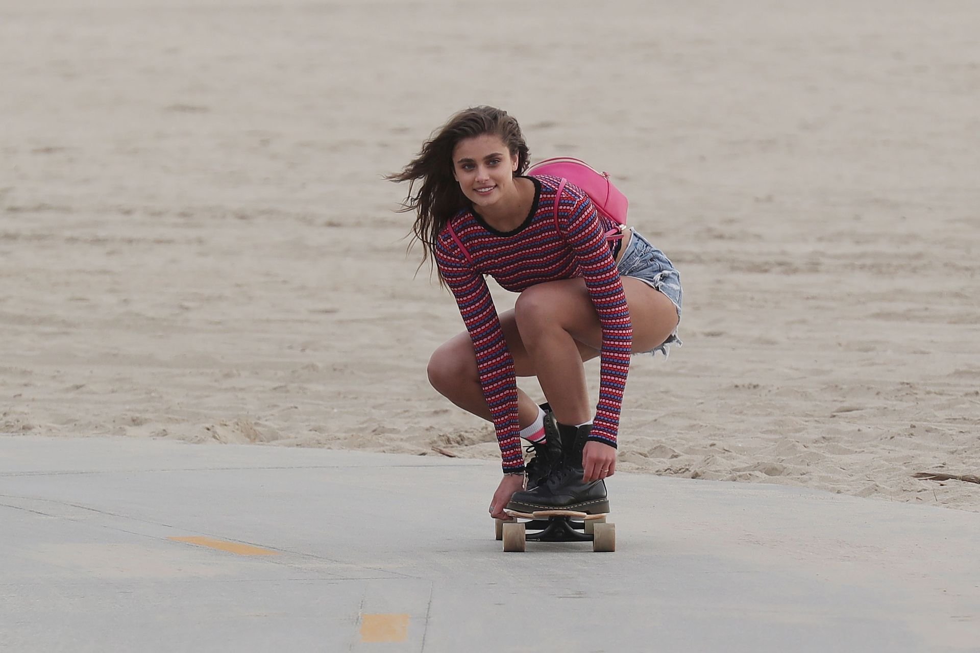 Modella Taylor Marie Hill indossa un costume da bagno a taglio alto e Daisy Dukes come ragazza skater durante il photoshoot di Victoria’s Secret a Venice Beach. Los Angeles, 01/10/2019.