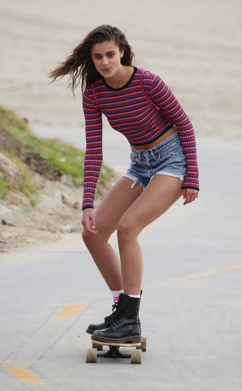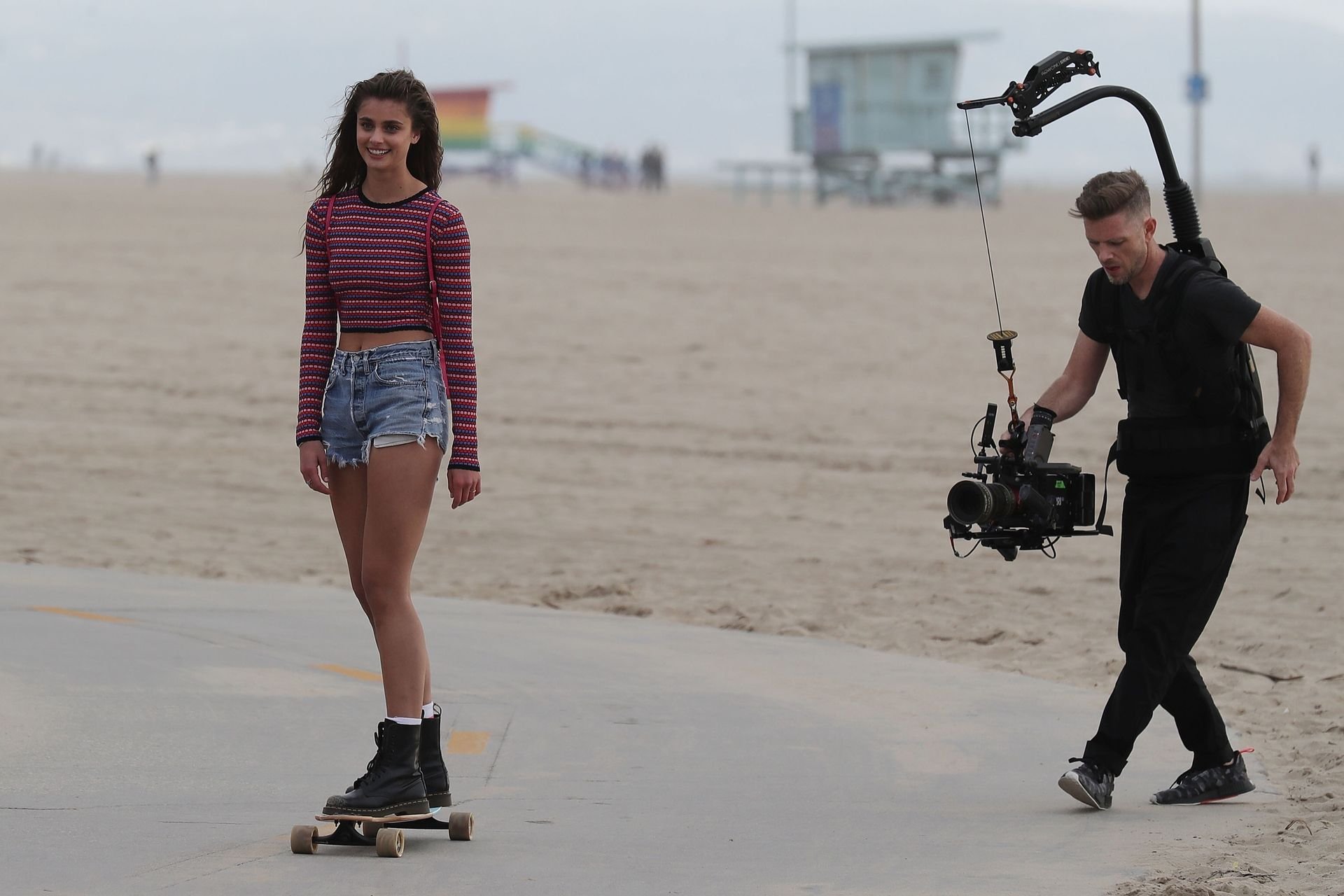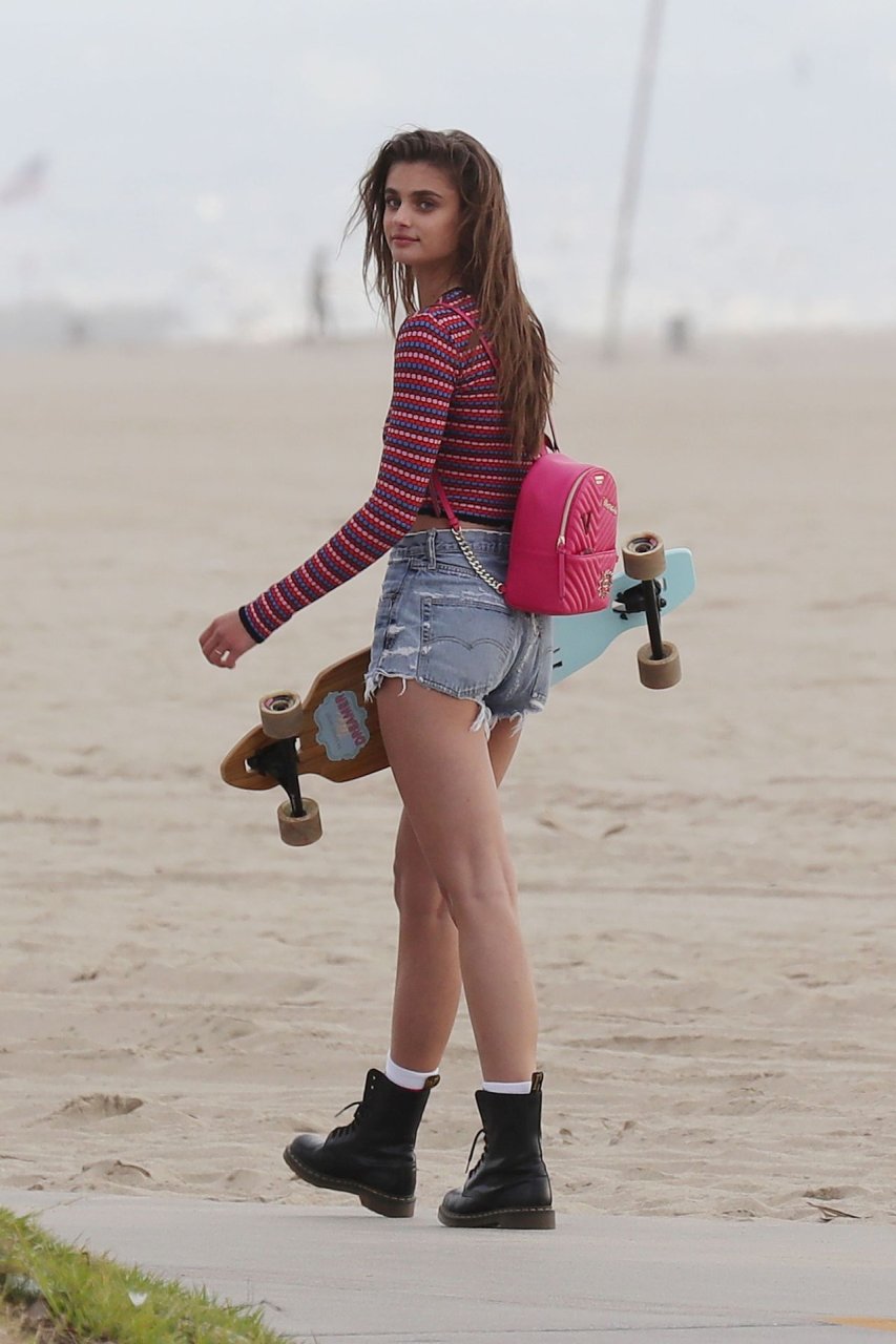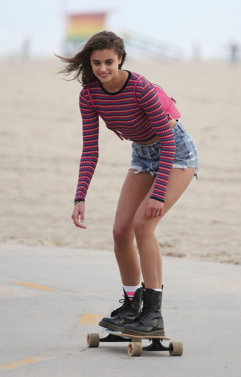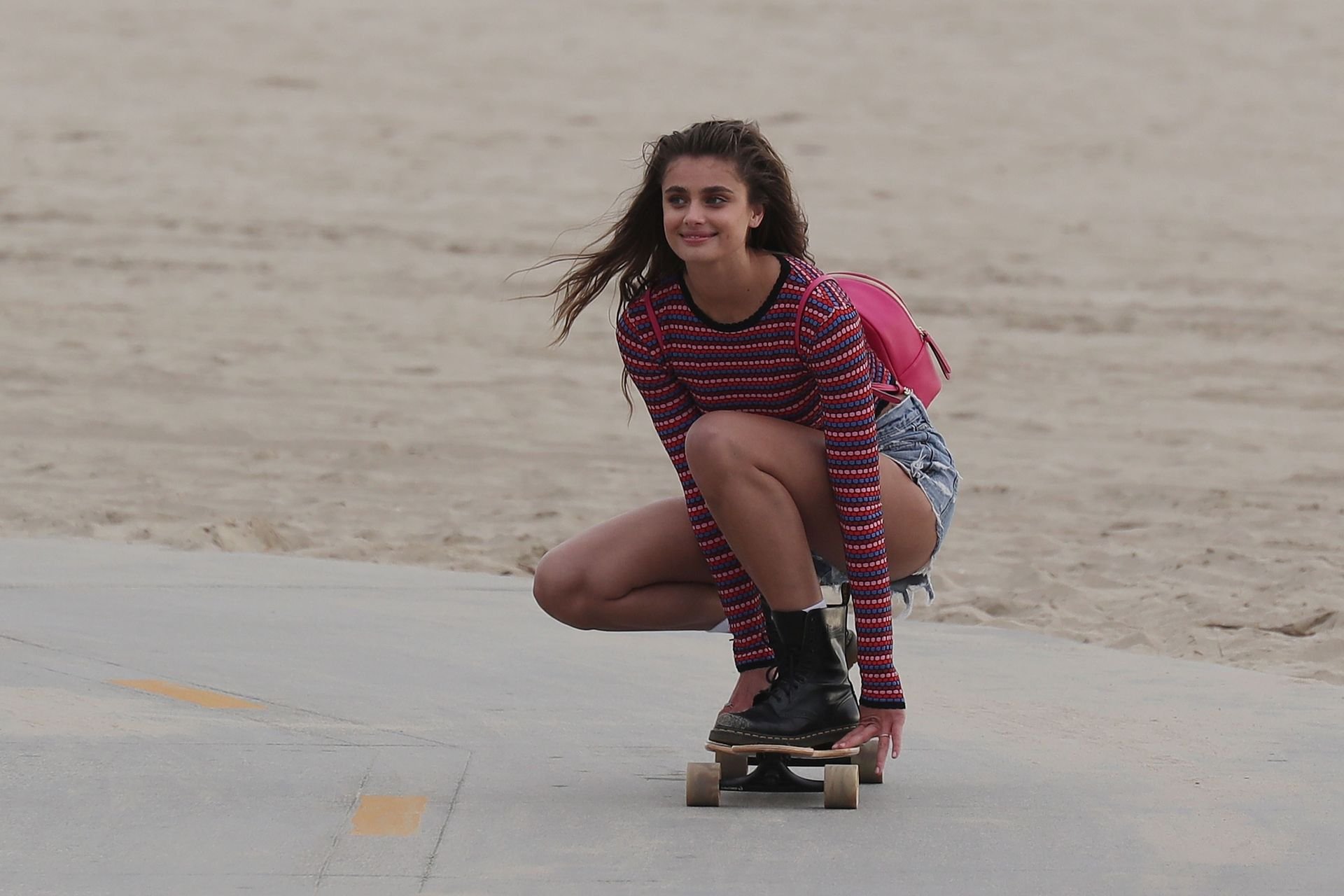 Modella Taylor Marie Hill indossa un costume da bagno a taglio alto e Daisy Dukes come ragazza skater durante il photoshoot di Victoria’s Secret a Venice Beach. Los Angeles, 01/10/2019.