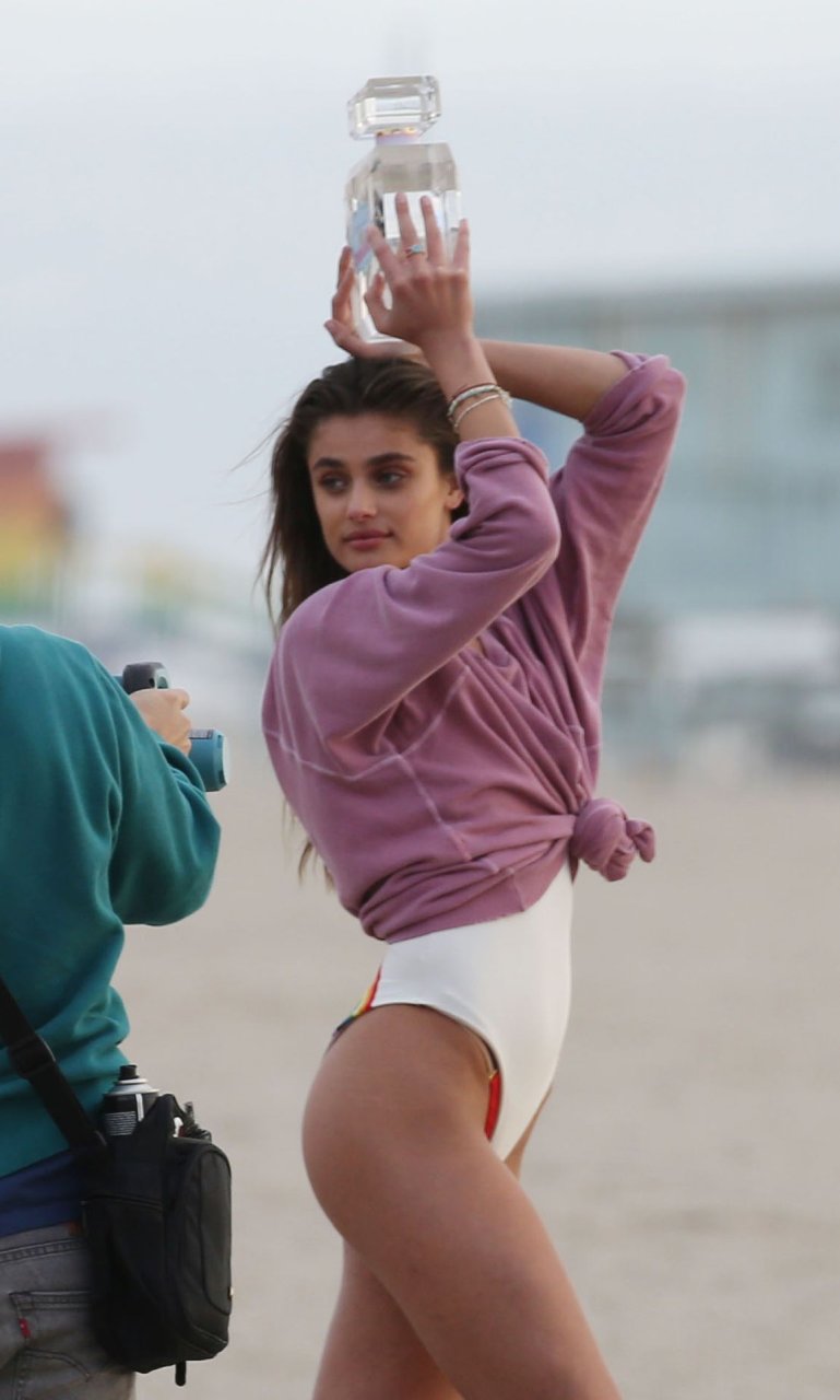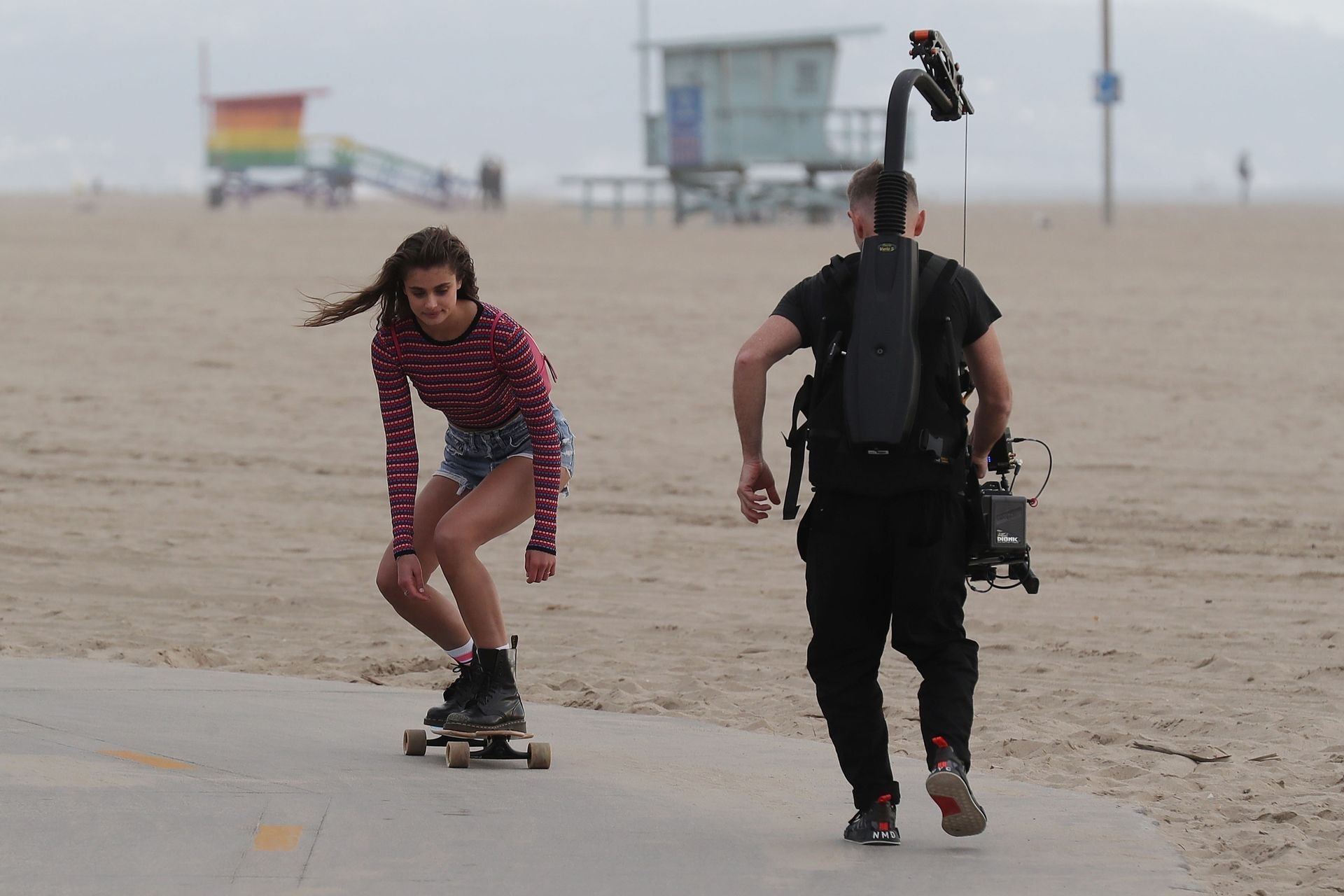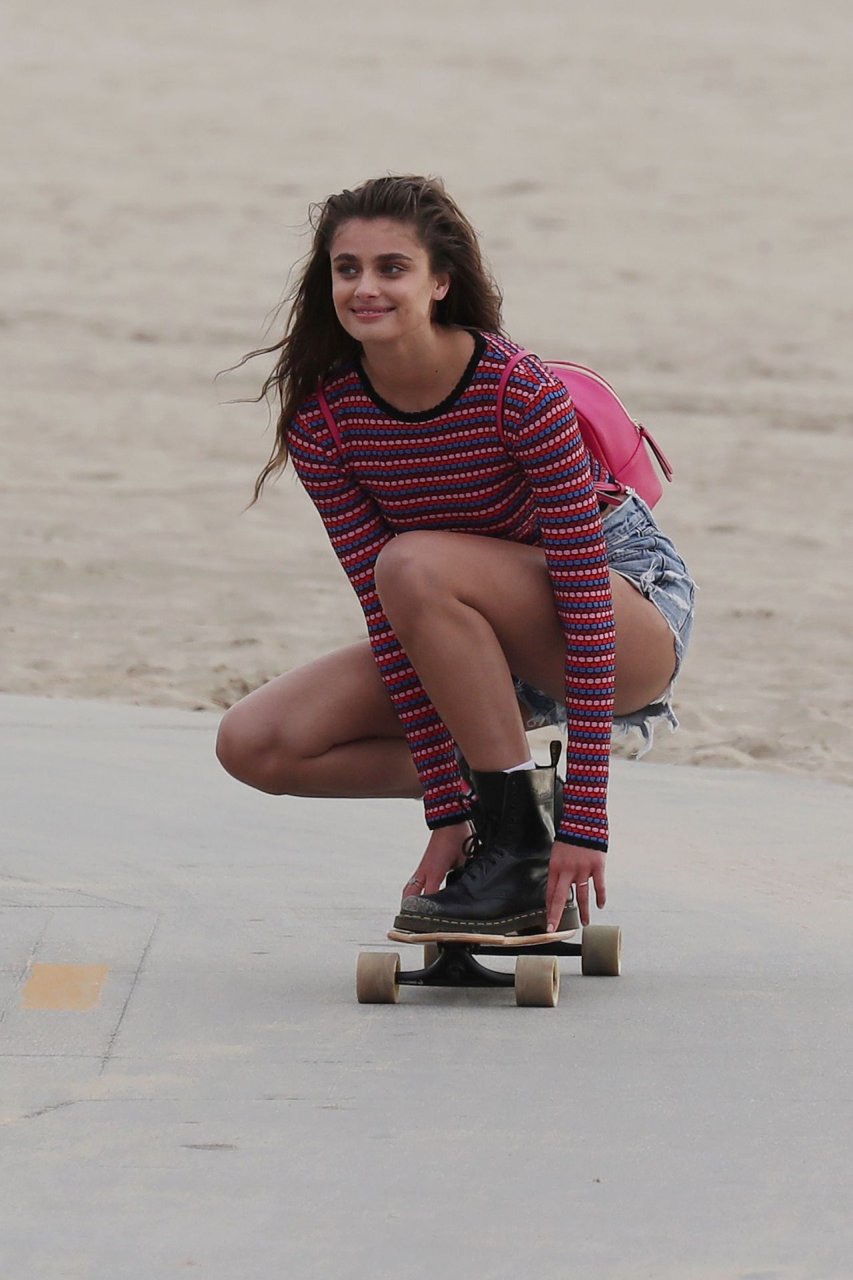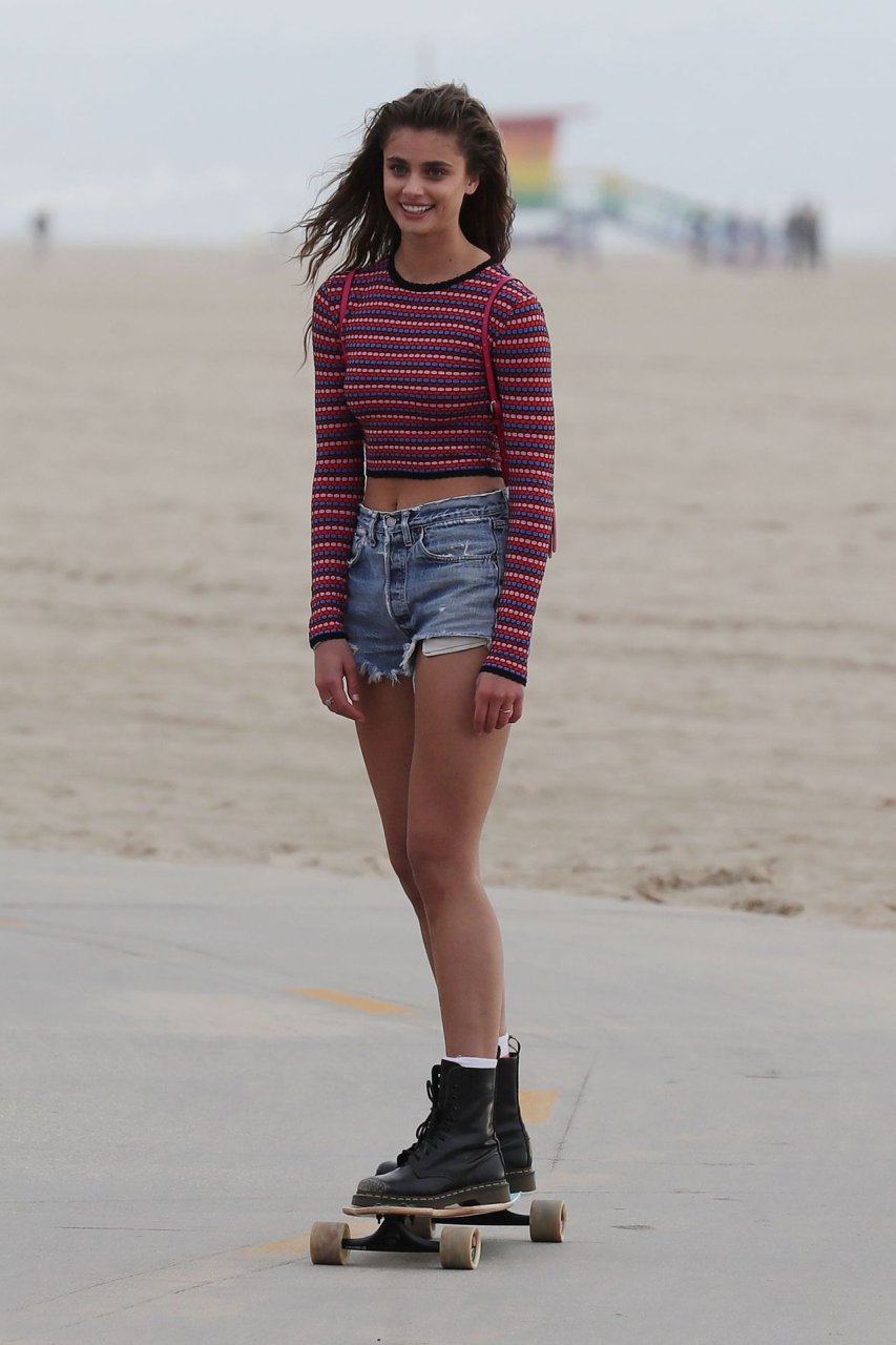 Modella Taylor Marie Hill indossa un costume da bagno a taglio alto e Daisy Dukes come ragazza skater durante il photoshoot di Victoria’s Secret a Venice Beach. Los Angeles, 01/10/2019.