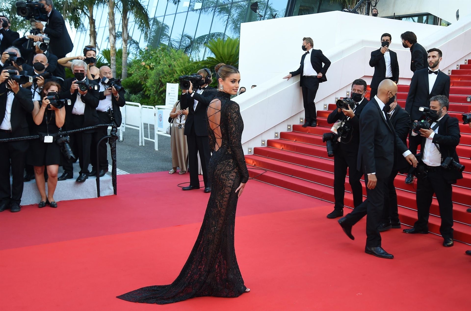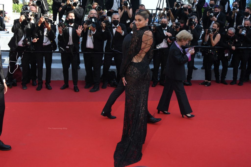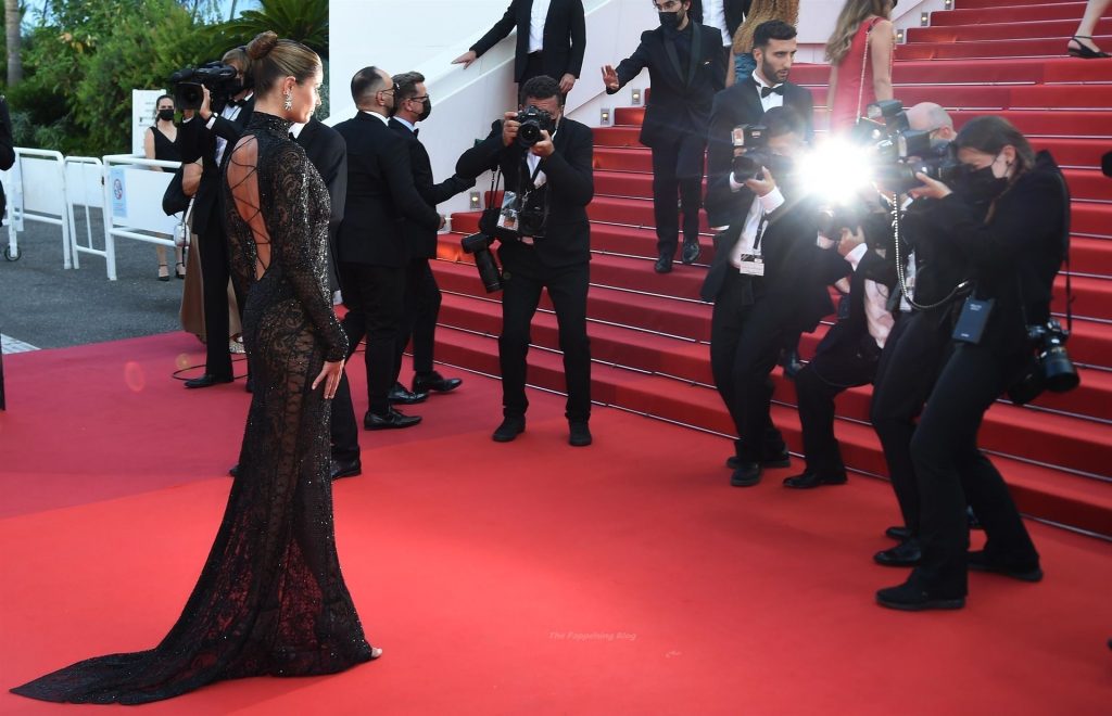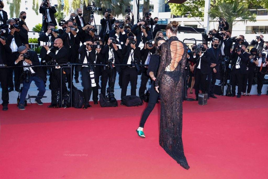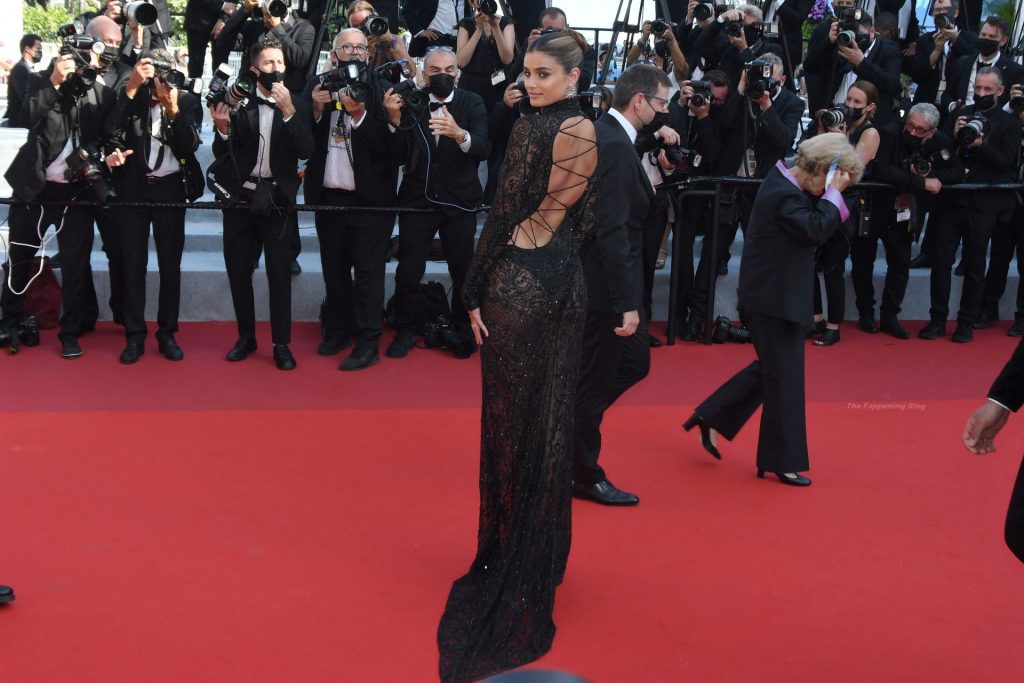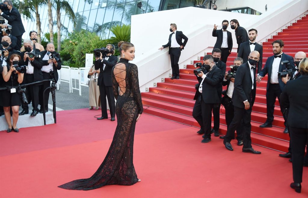 La modella Taylor Hill posa con un abito nero trasparente durante la proiezione di “De Son Vivant” al 74º Festival di Cannes a Cannes, 07/10/2021.